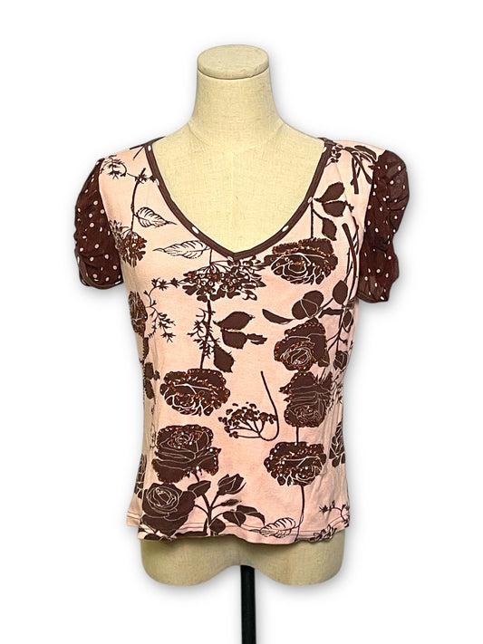 Y2K Pink and Brown Floral Print Top (S/M)