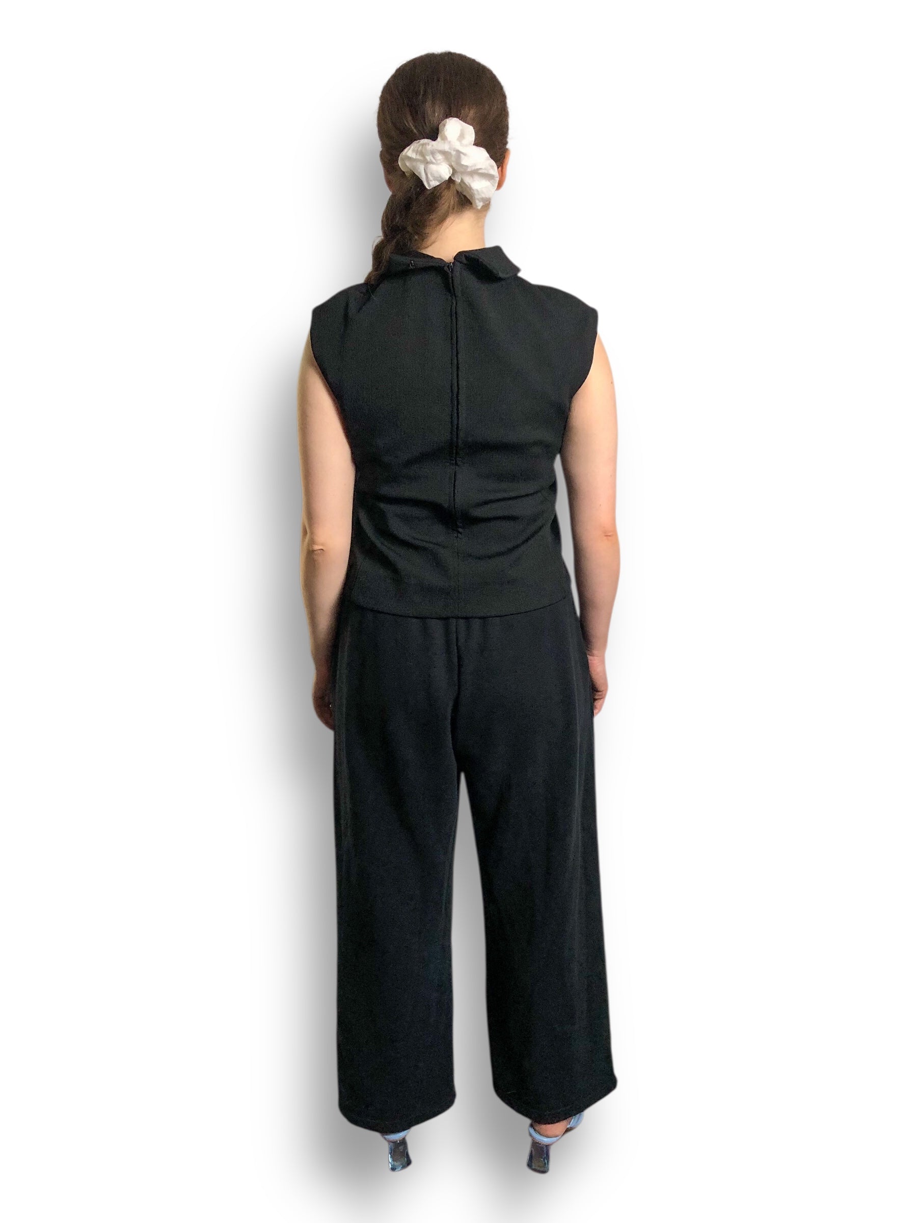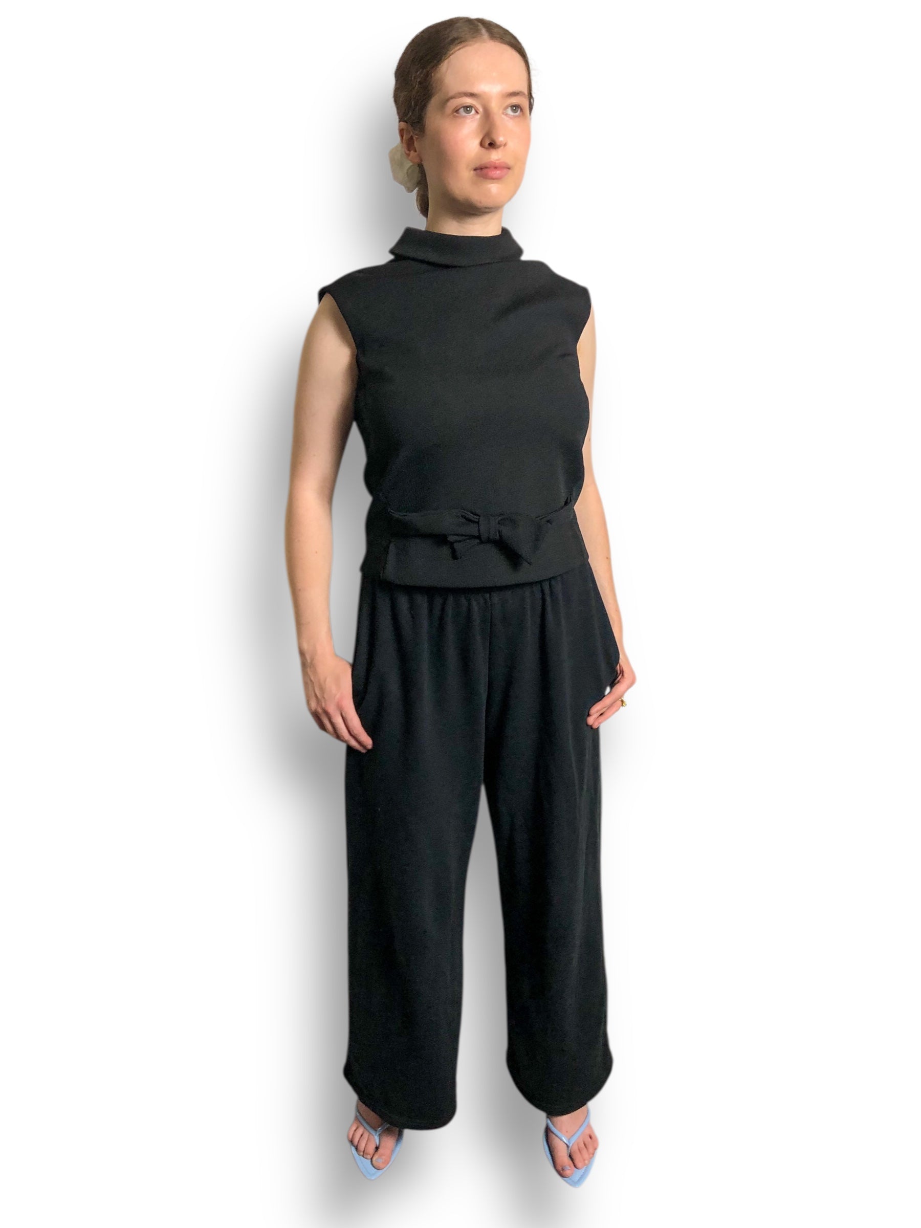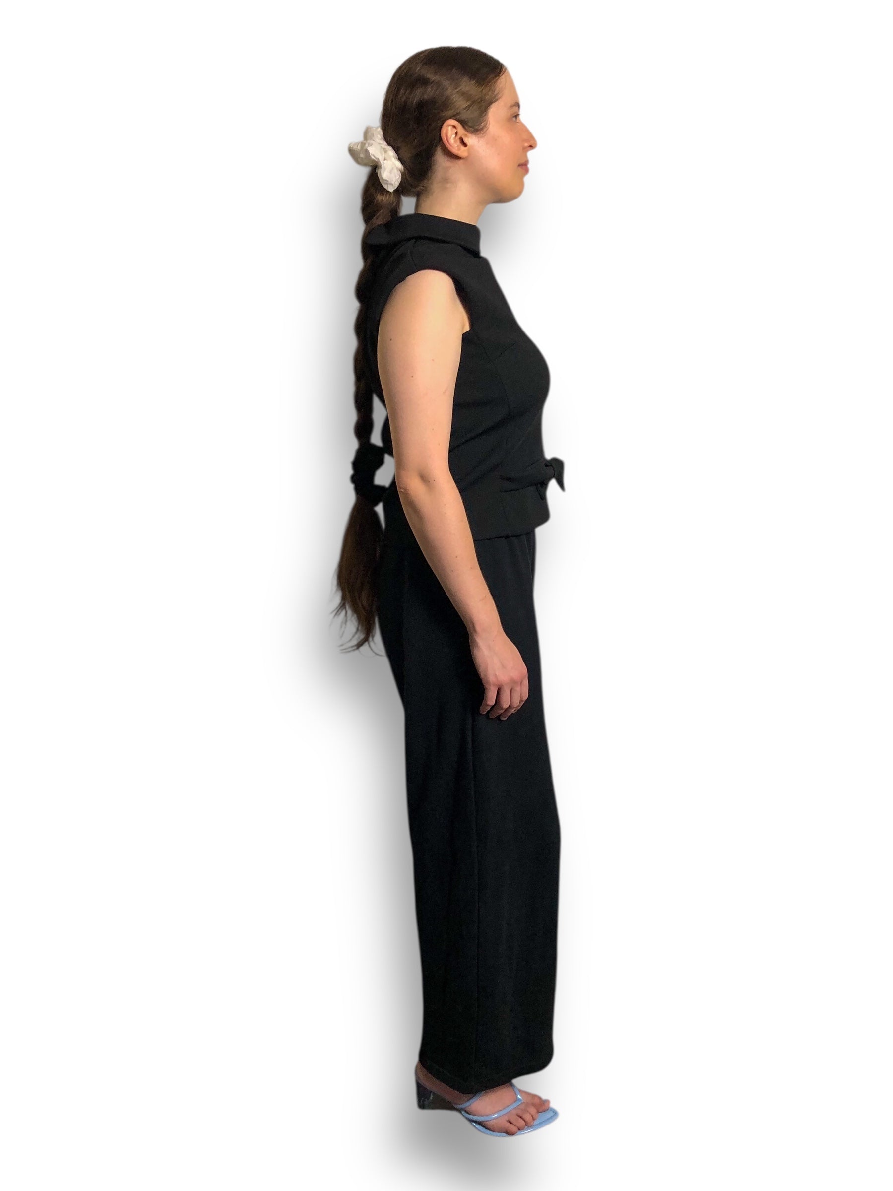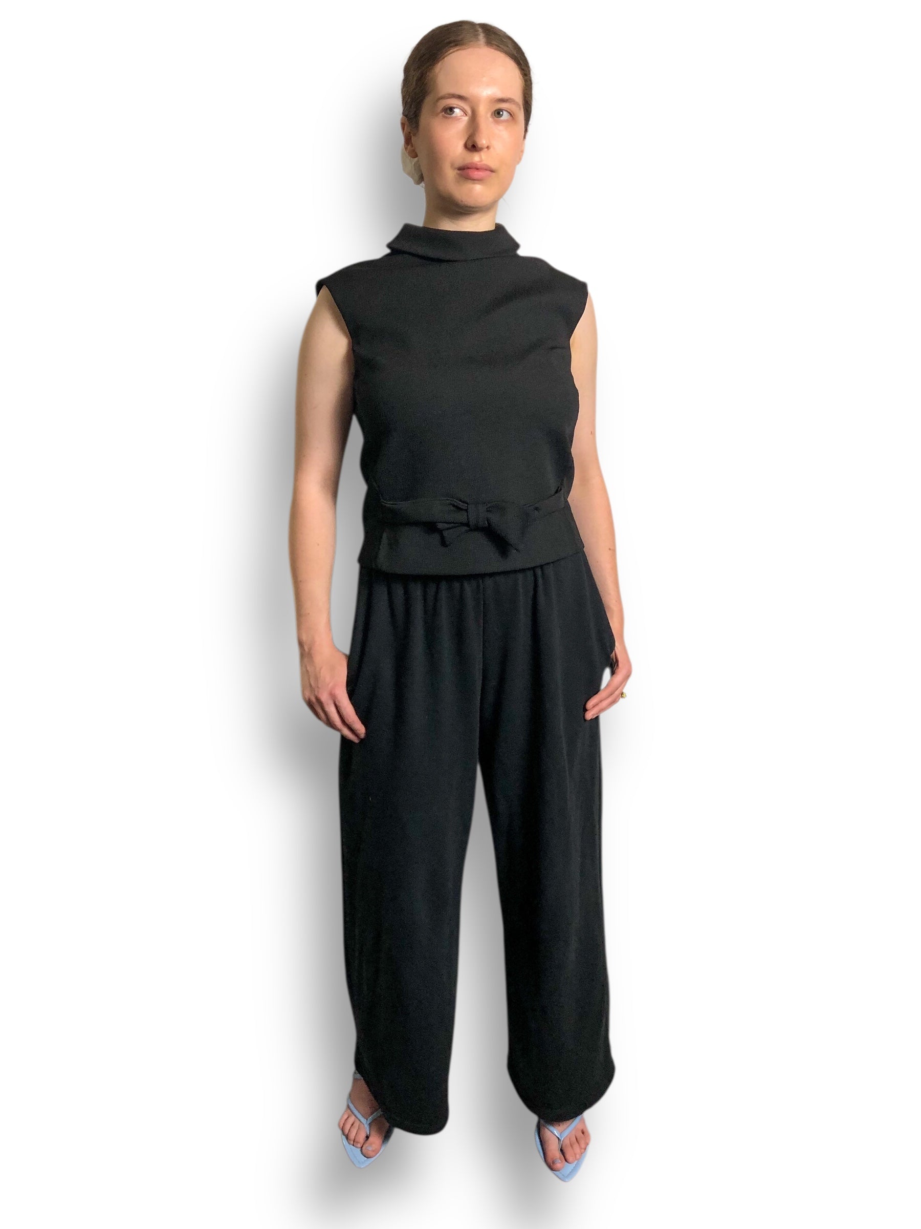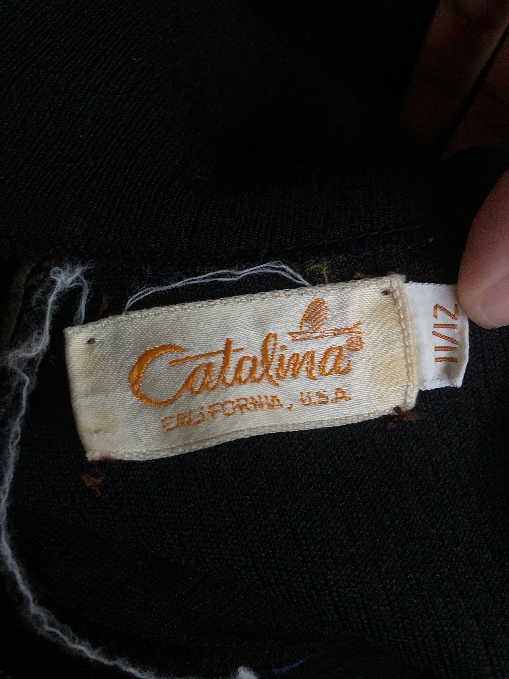 rolled collar, rear zipper closure, bow detail in the front, textured fabric w/ some stretch (feels like polyester), made in USA