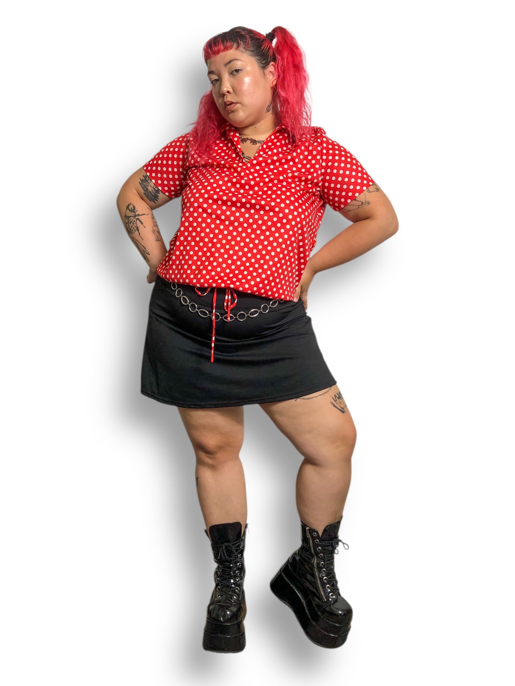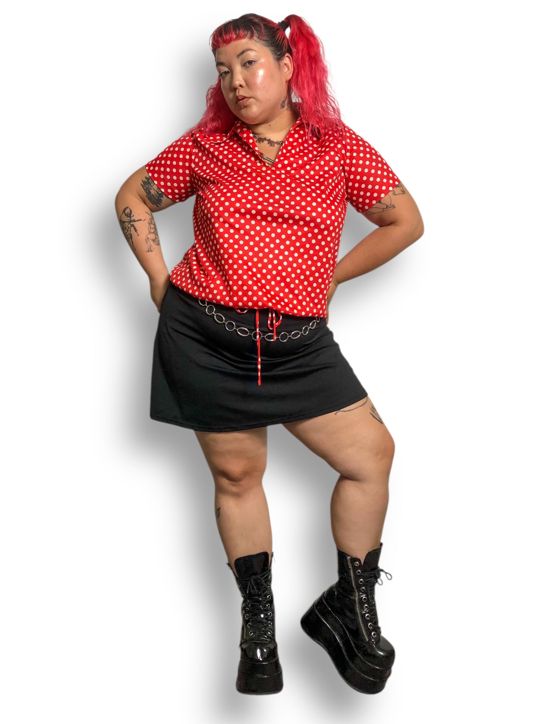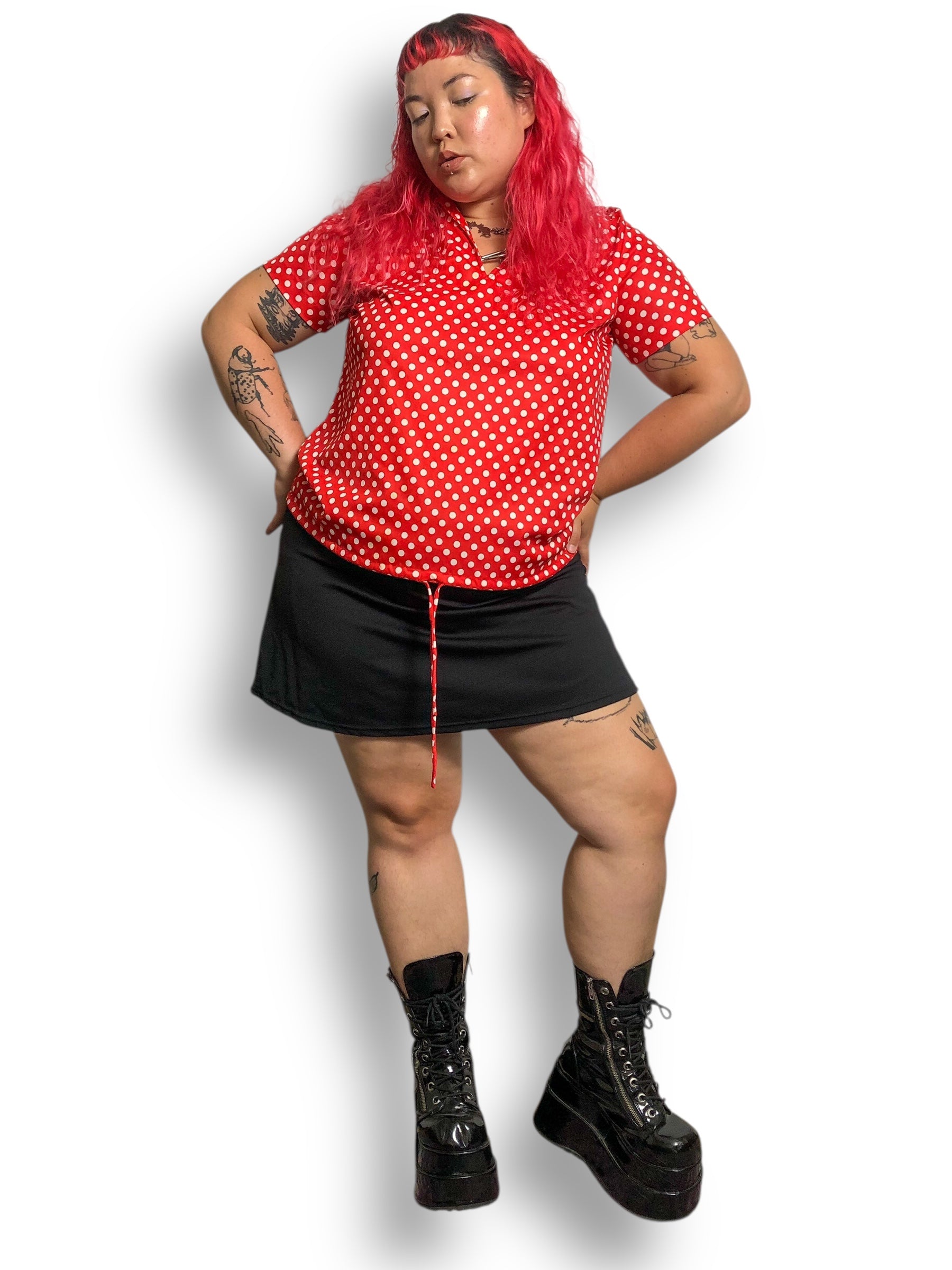 retro Minnie Mouse vibes <3 adjustable drawstring waist tie, large pointy collar, some stretch (100% polyester)