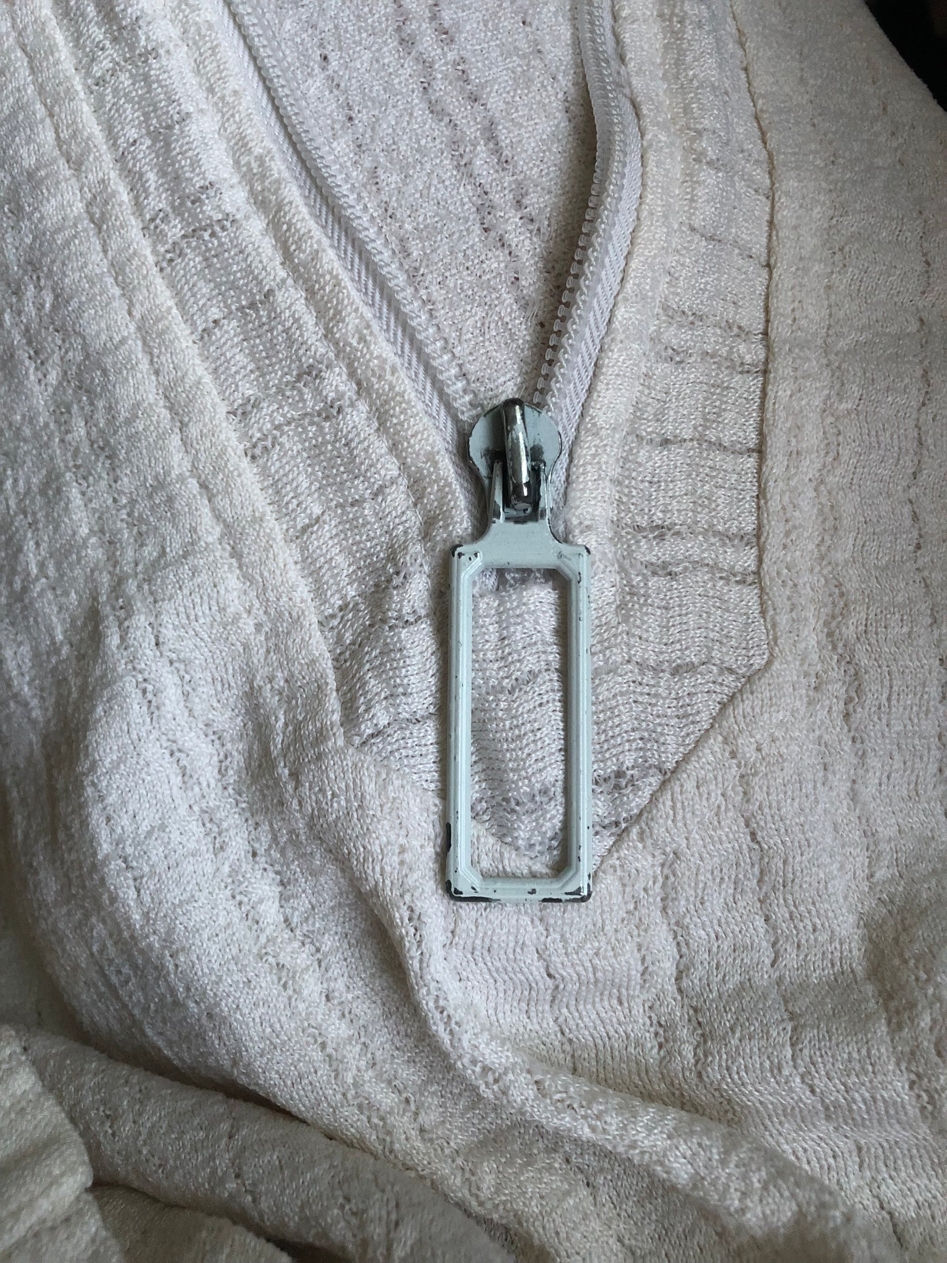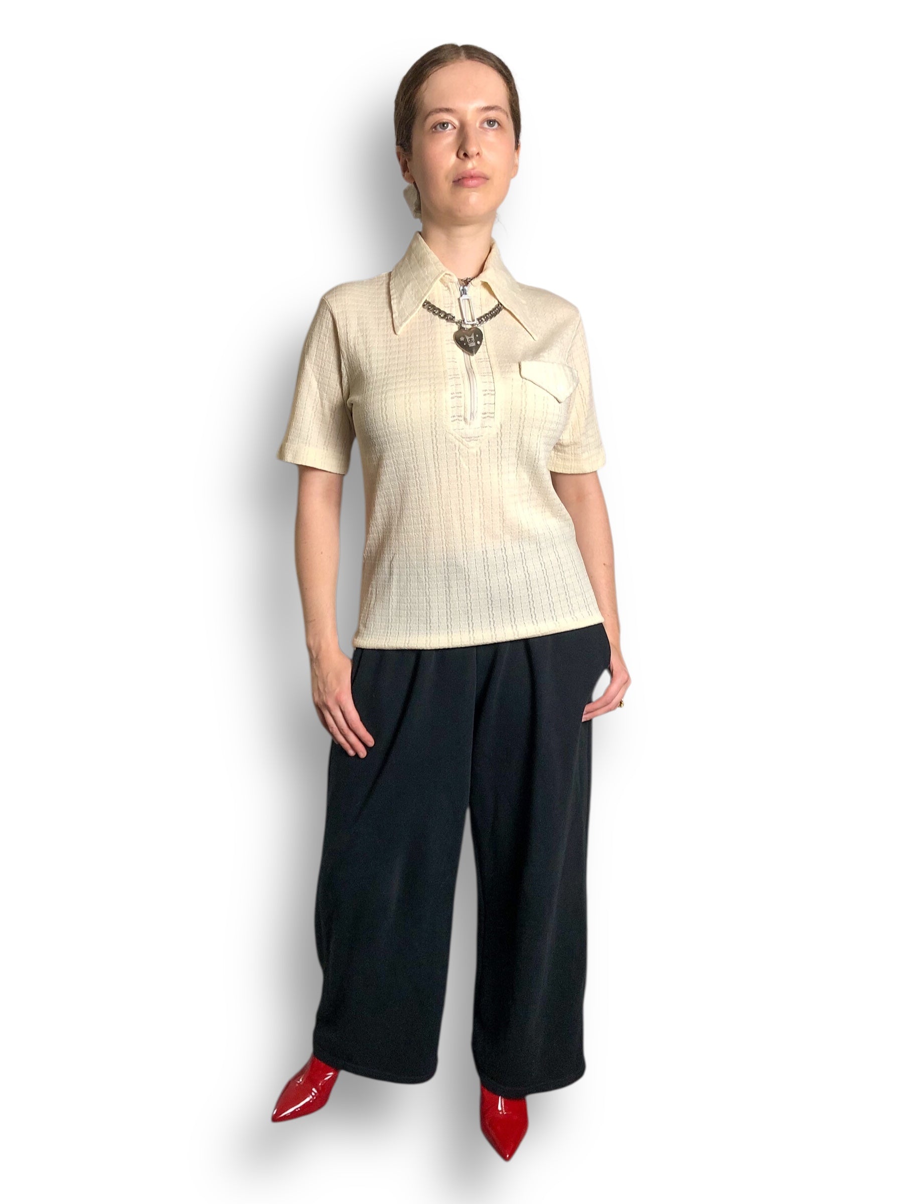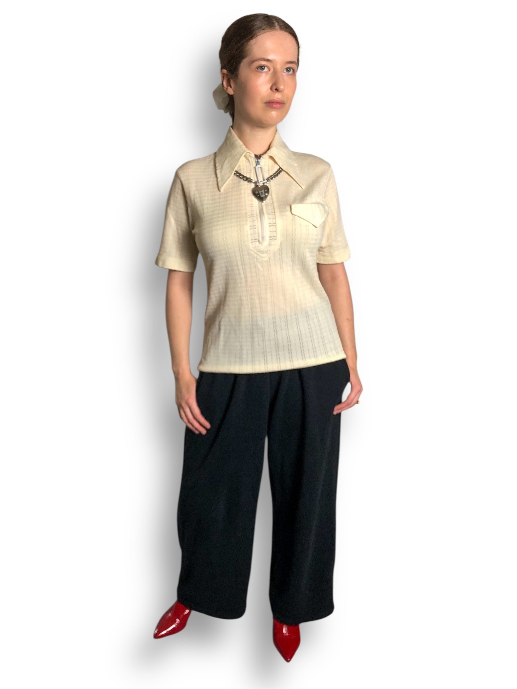large pointy collar, half zip in the front w/ a big zipper pull, shirt pocket, stretchy fabric (feels like a poly rayon blend)