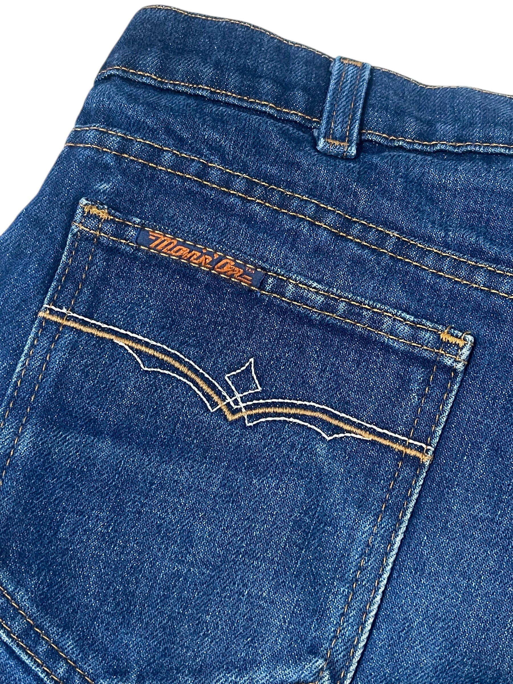 dark wash, rear pocket embroidery, raw hems, 100% cotton