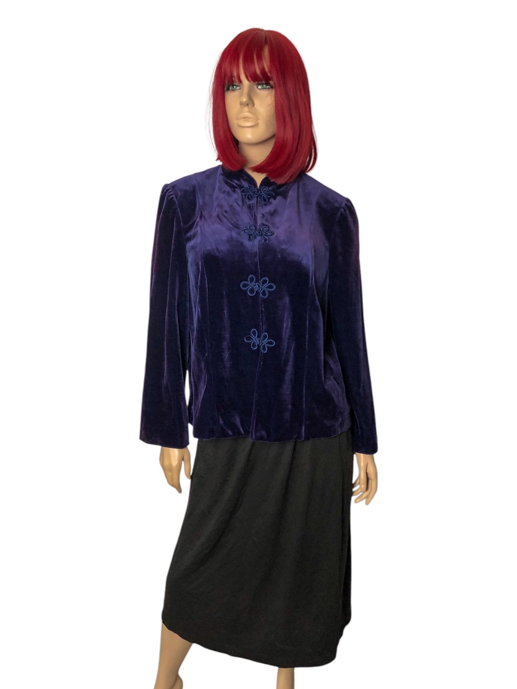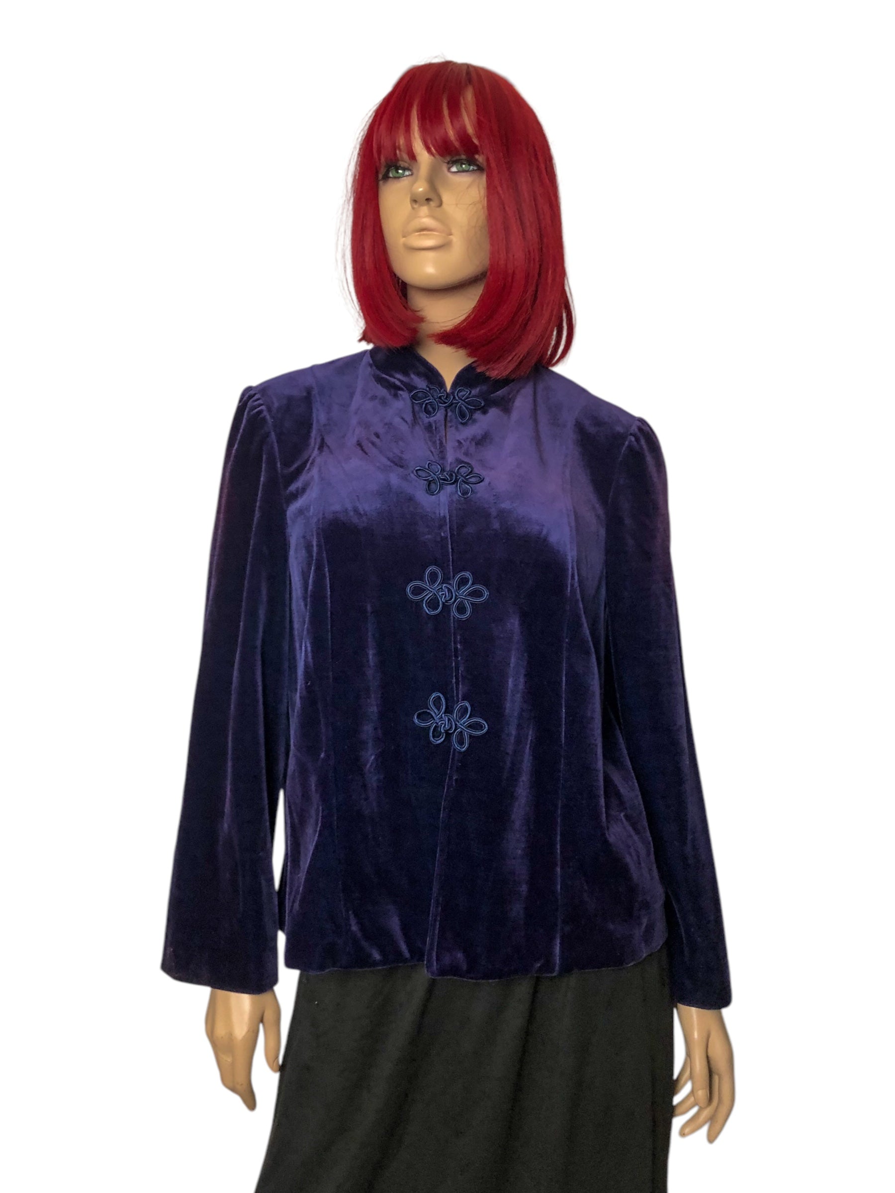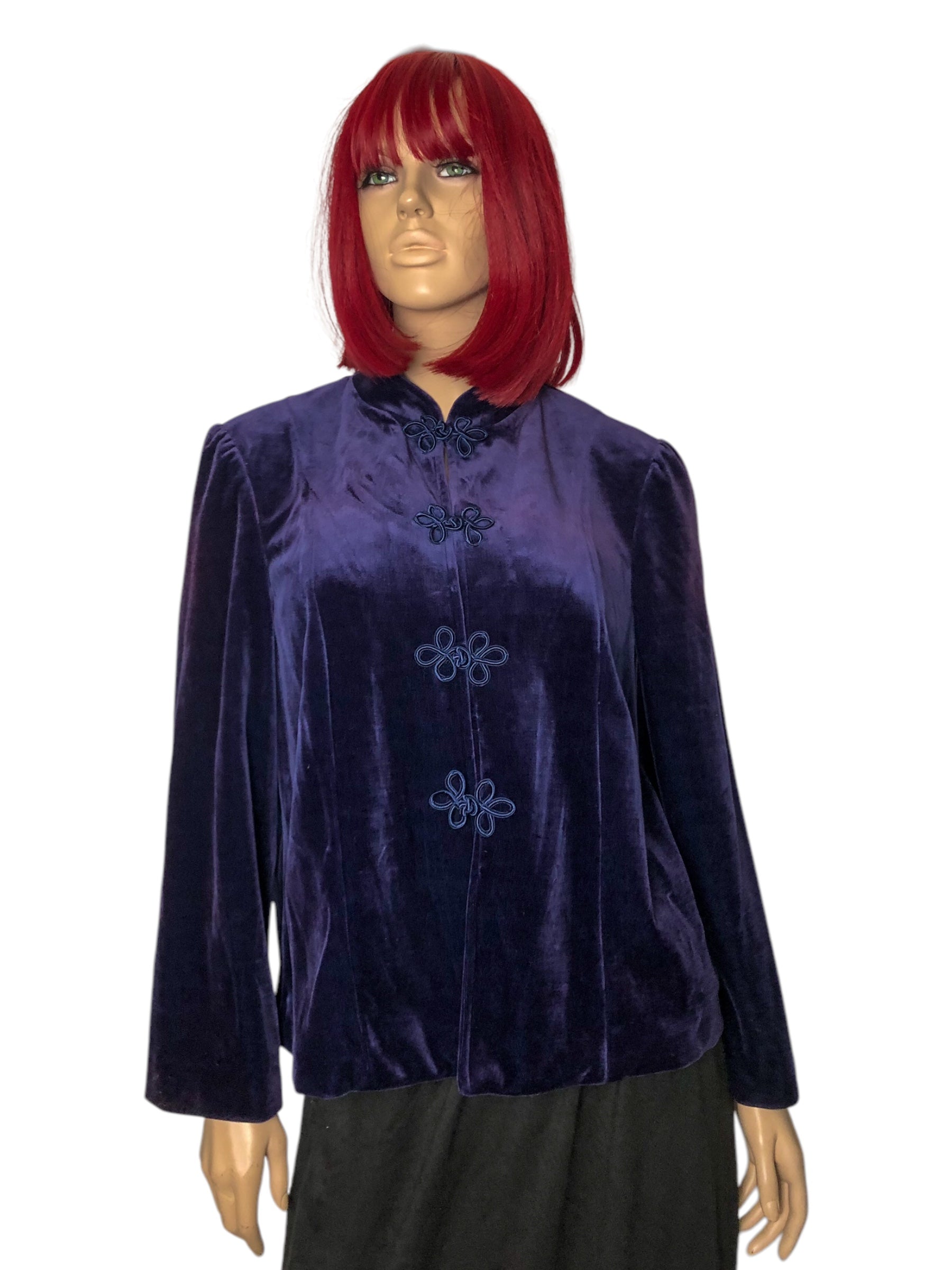 deadstock w/ tags! mandarin collar, frog clasps down the front, shoulder pads, soft non-stretch fabric (75% triacetate 25% polyester), made in USA