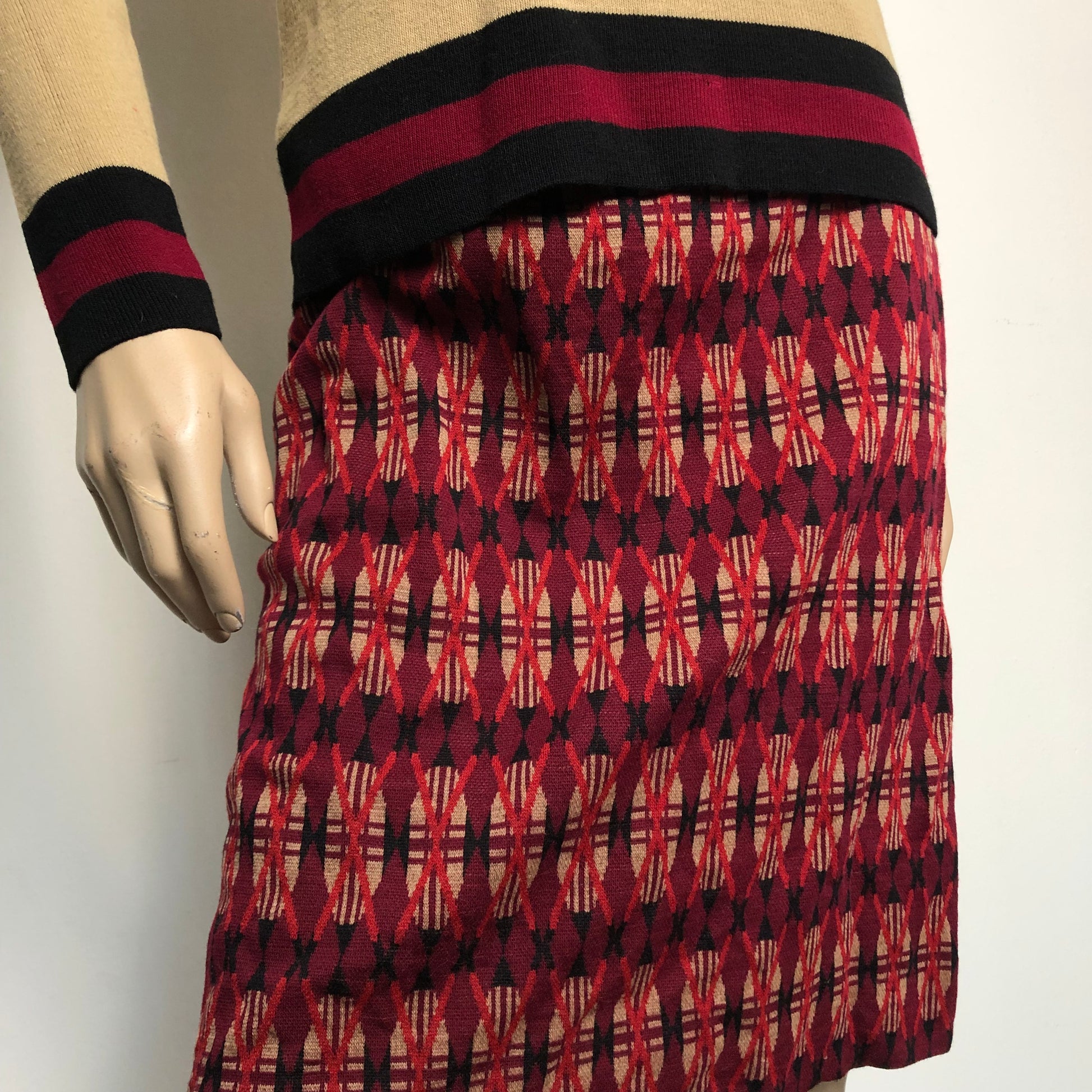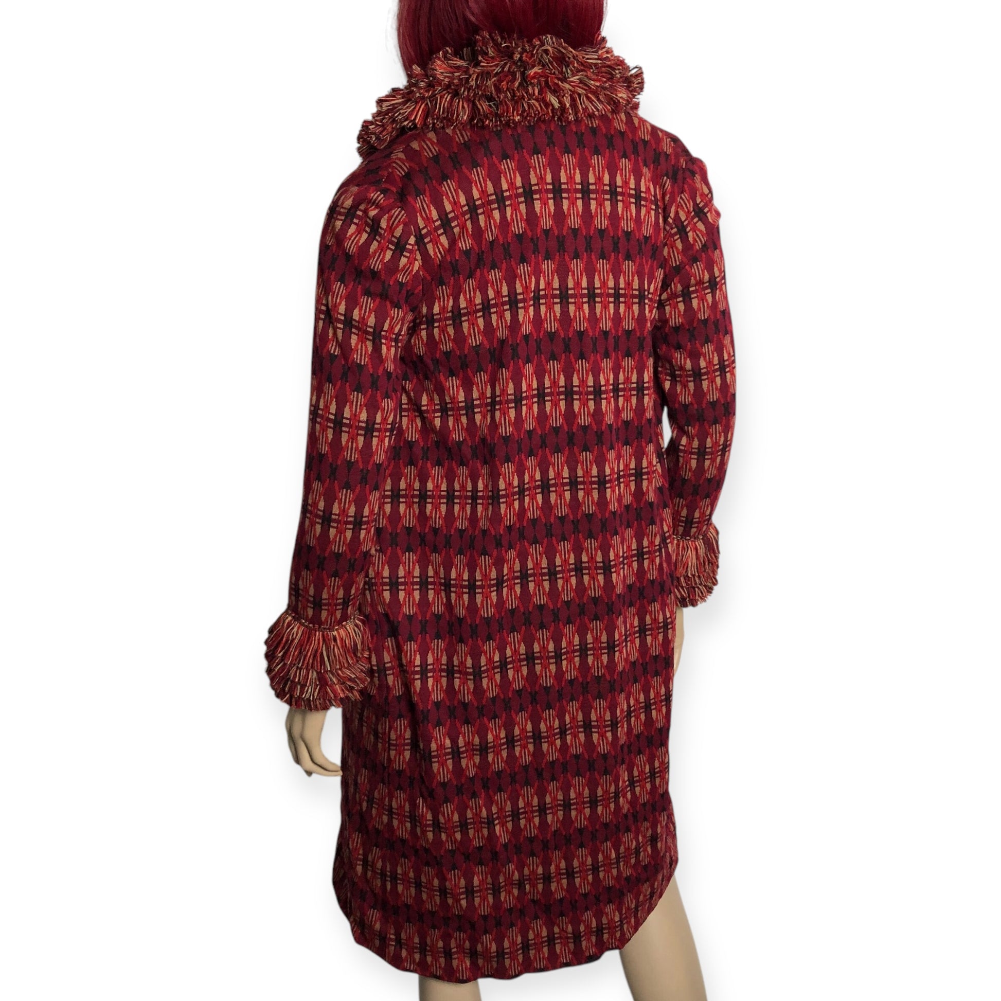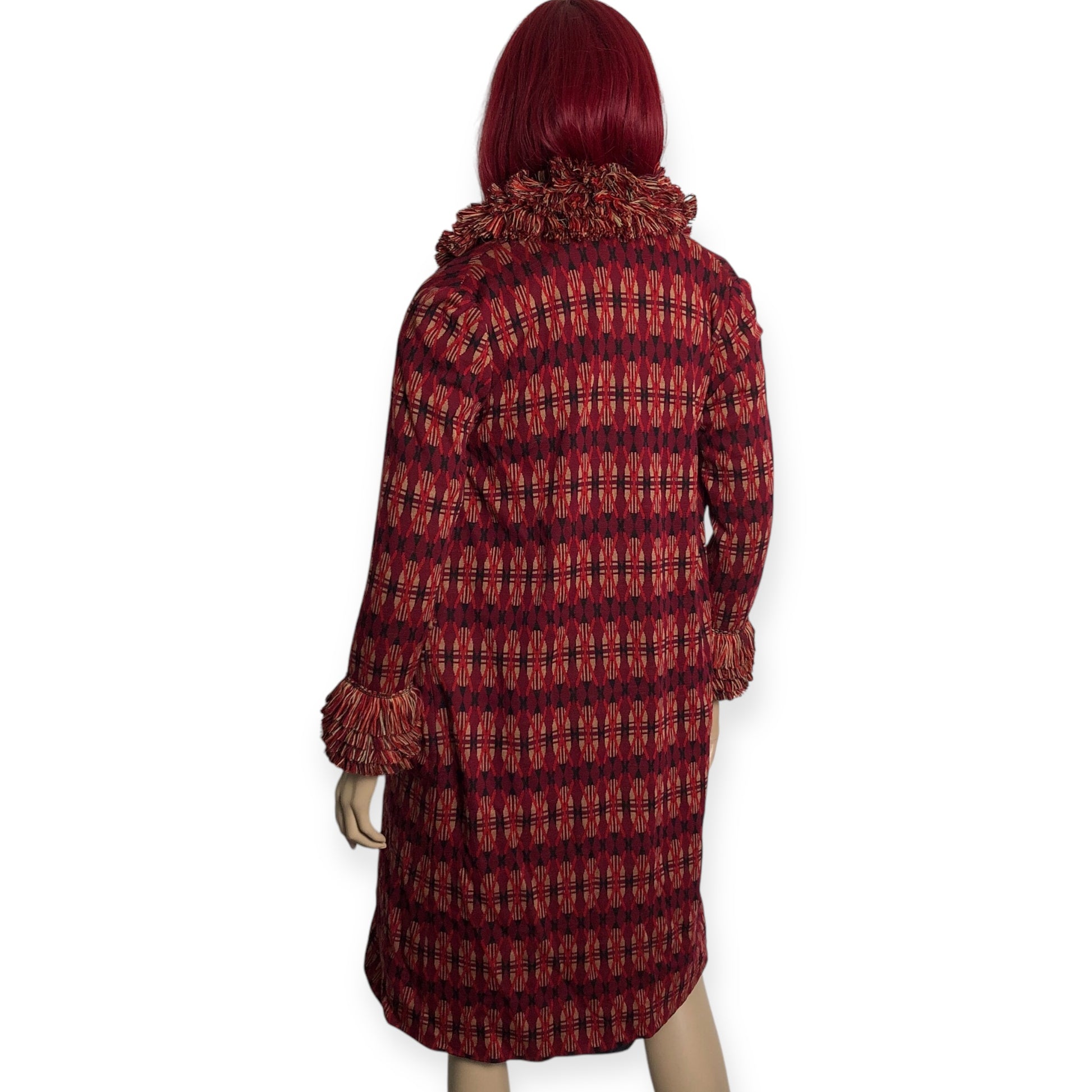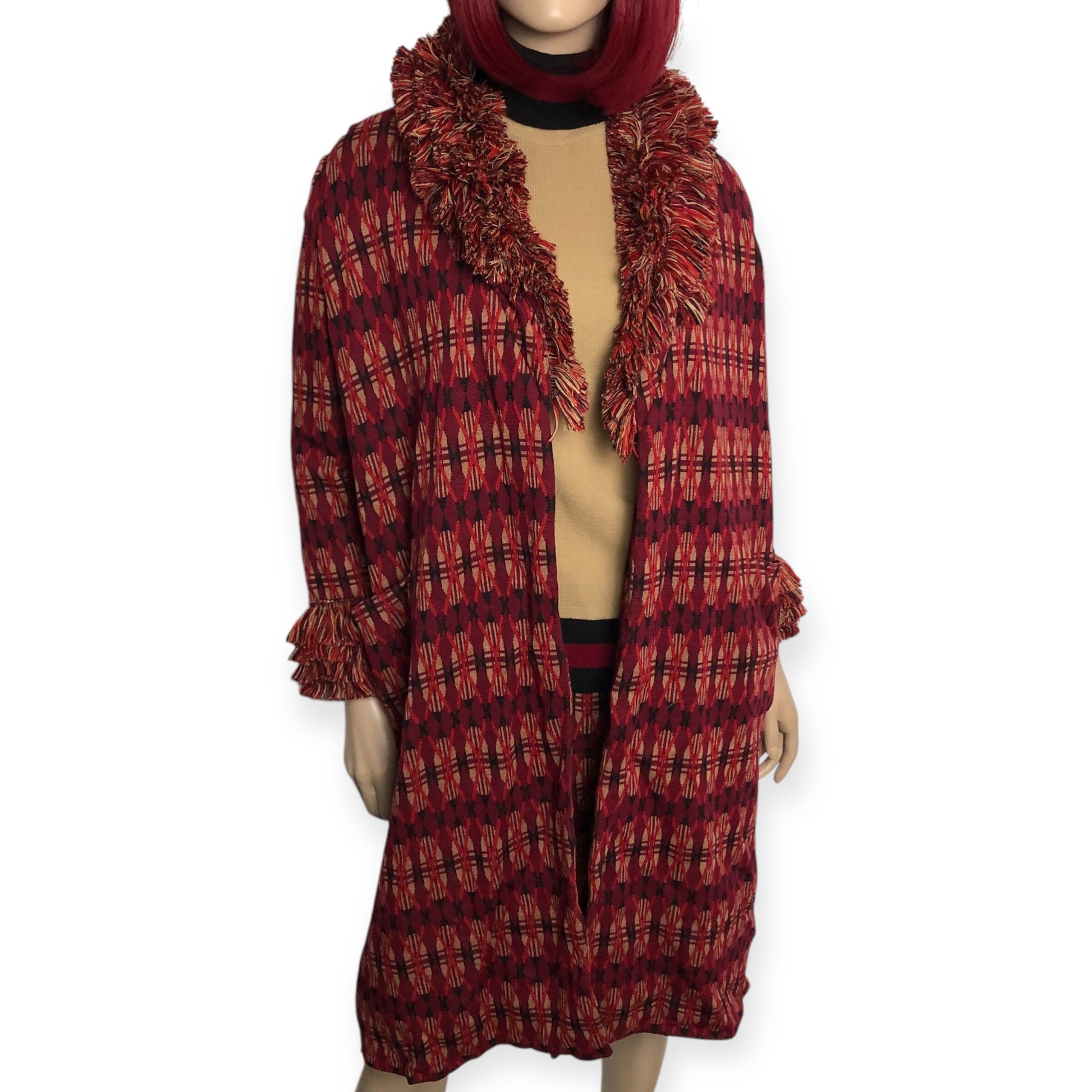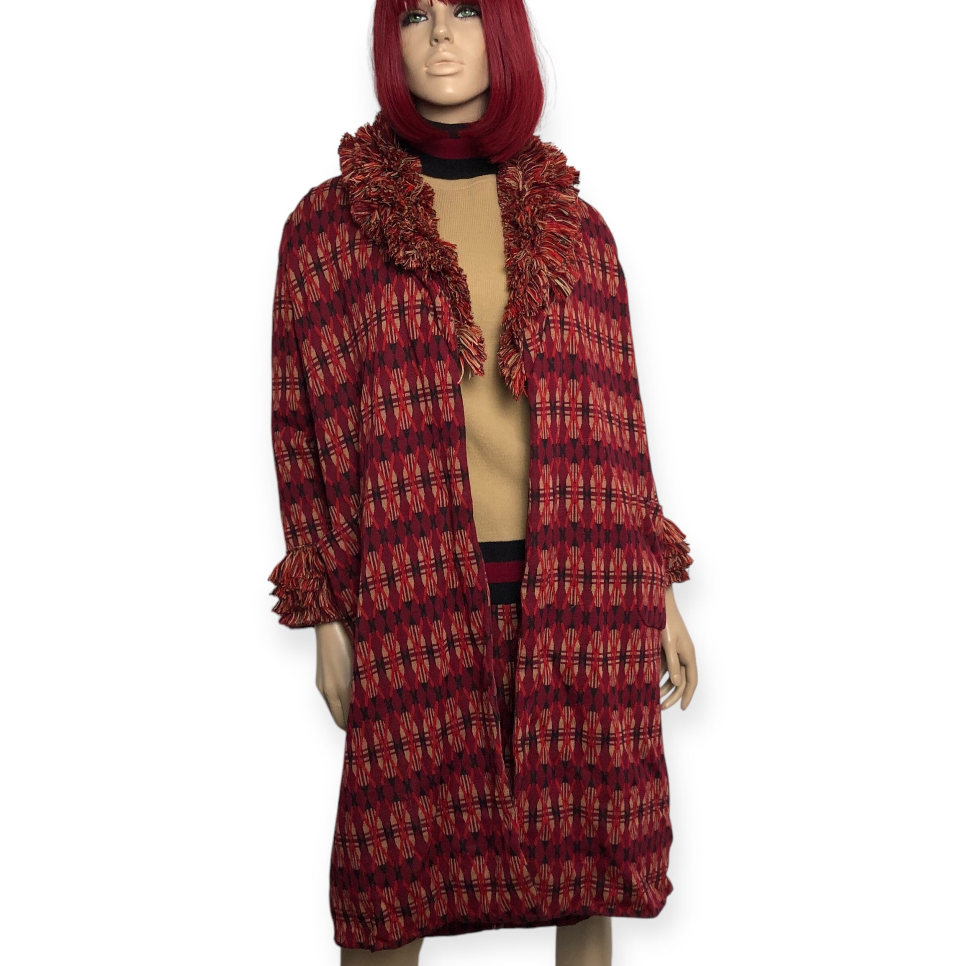 groovy mod outfit!! red and khaki patterned coat with fringe collar & cuffs, turtleneck knit sweater, + matching knit a-line skirt, lining + belt loops + side pockets on the coat, small neck zipper on the shirt, skirt has some stretch , shirt has quite a bit of stretch!