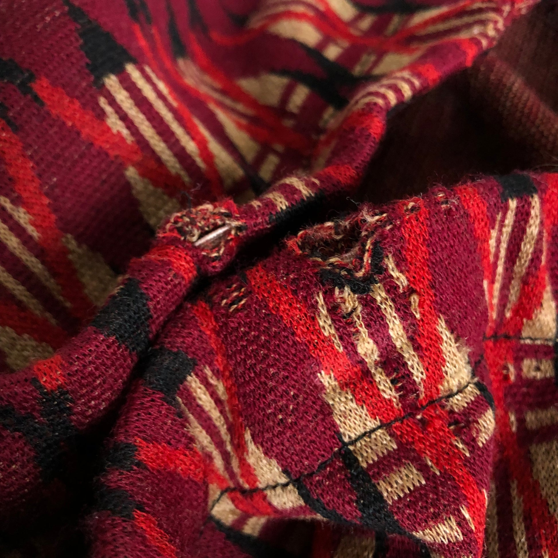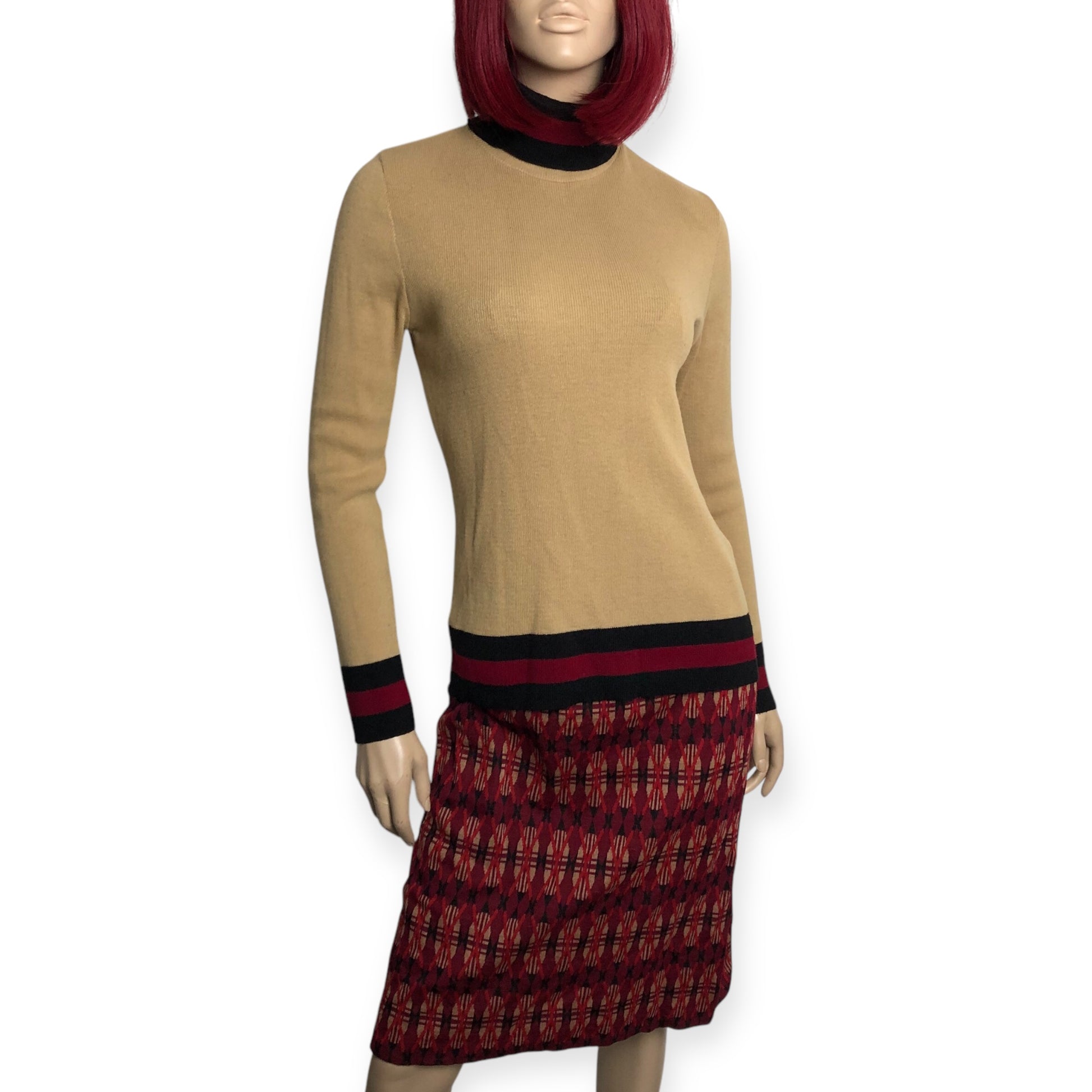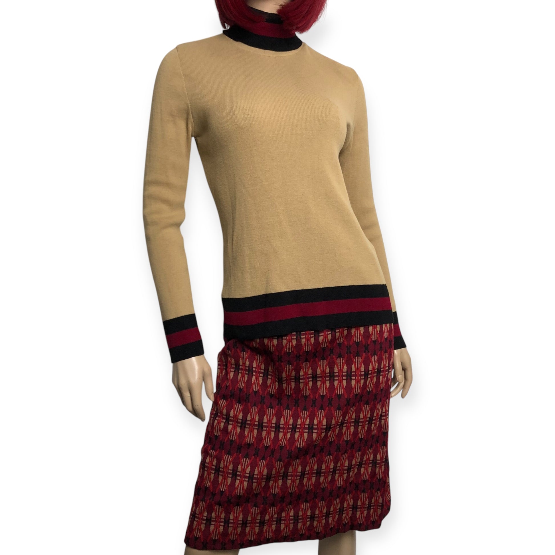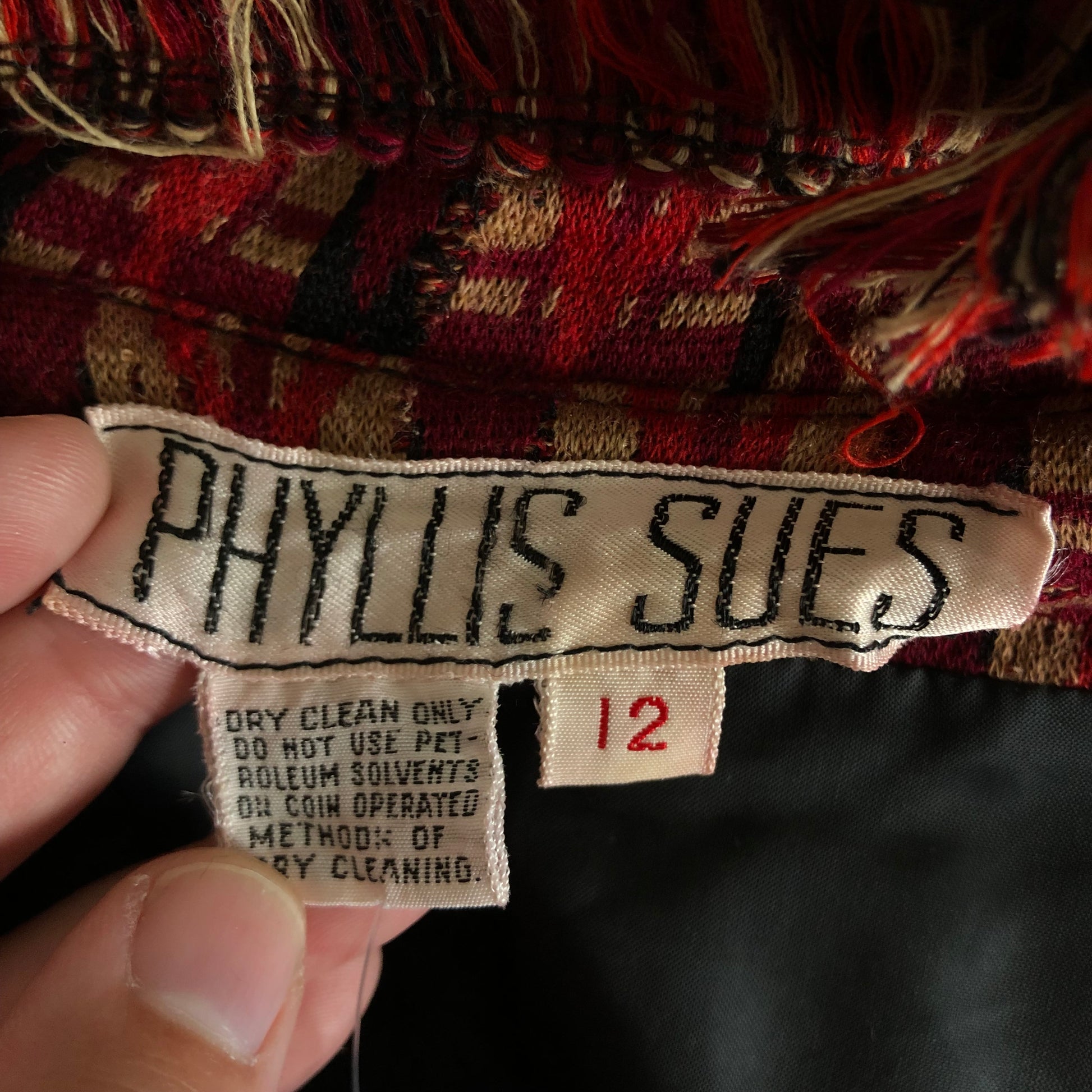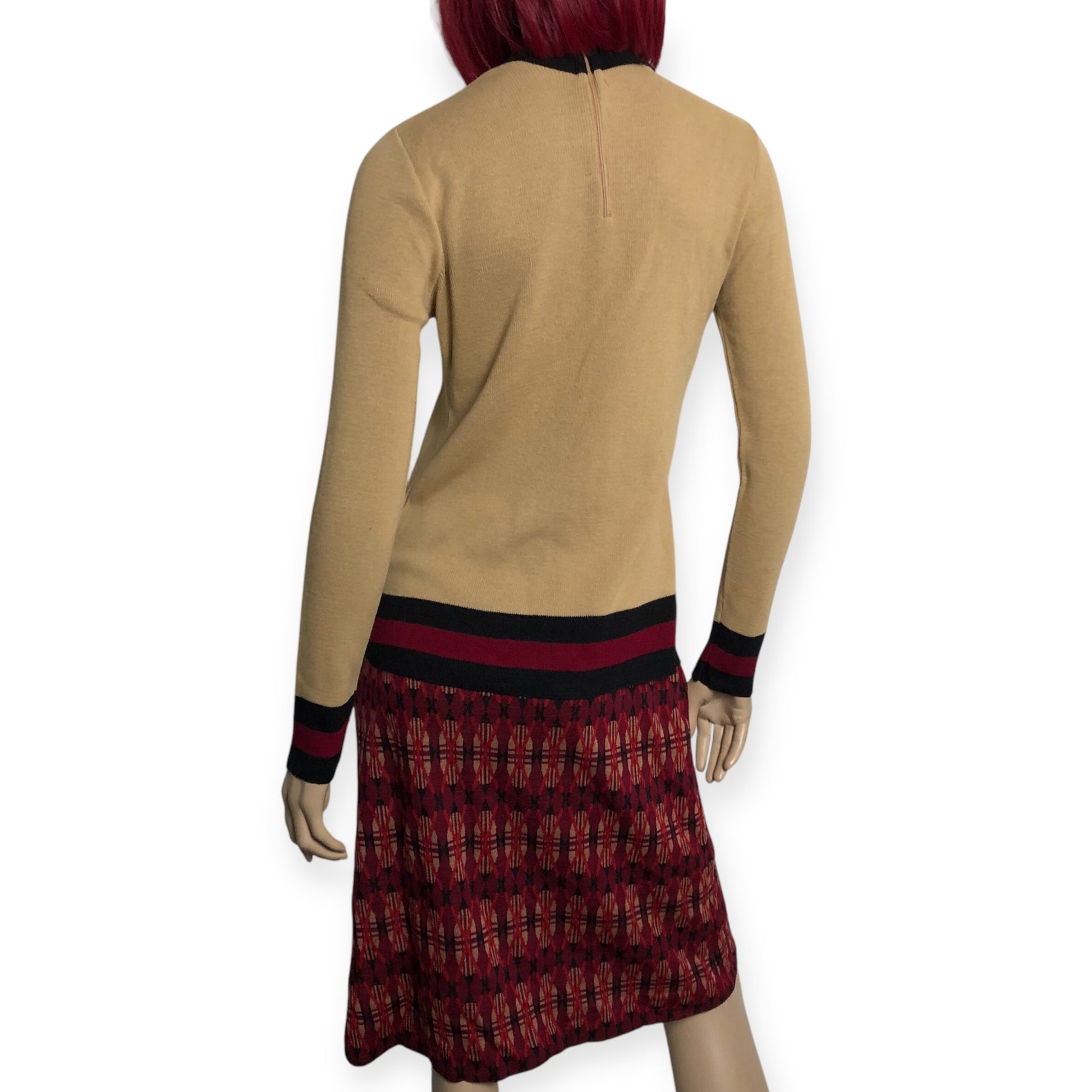 groovy mod outfit!! red and khaki patterned coat with fringe collar & cuffs, turtleneck knit sweater, + matching knit a-line skirt, lining + belt loops + side pockets on the coat, small neck zipper on the shirt, skirt has some stretch , shirt has quite a bit of stretch!