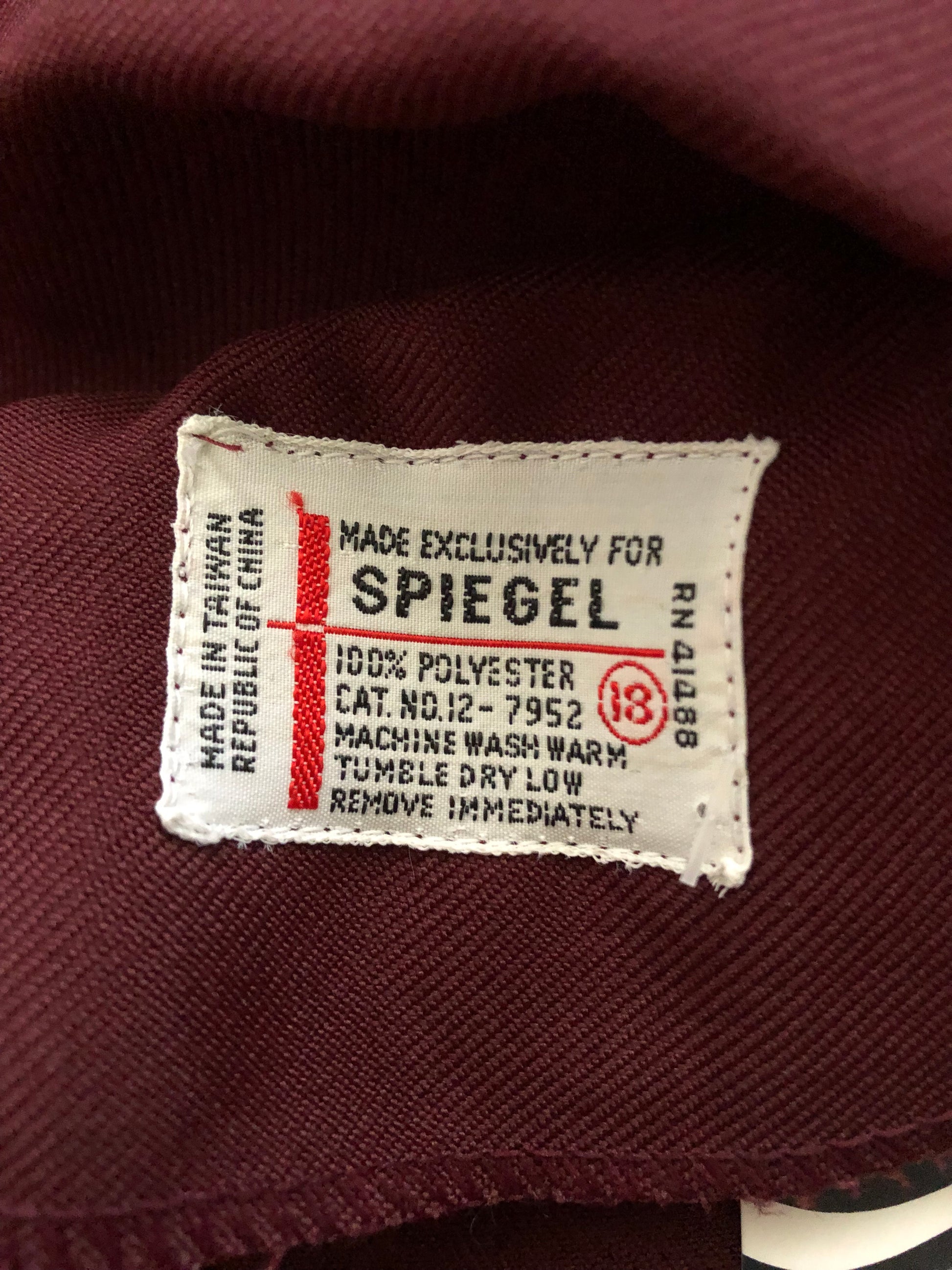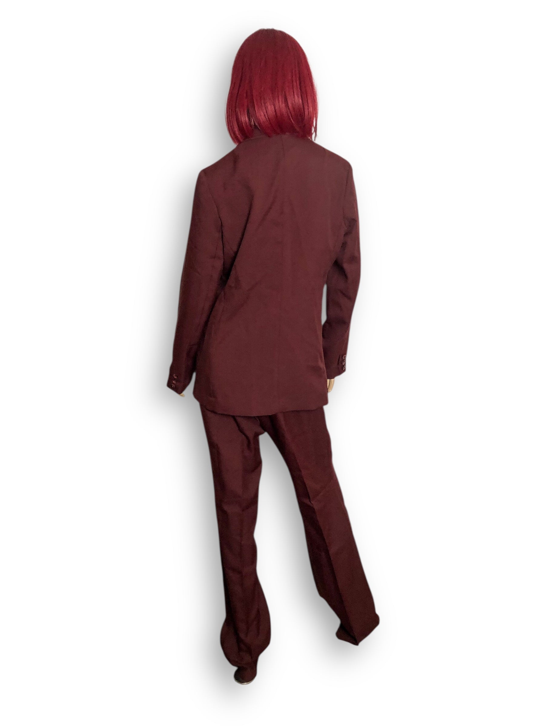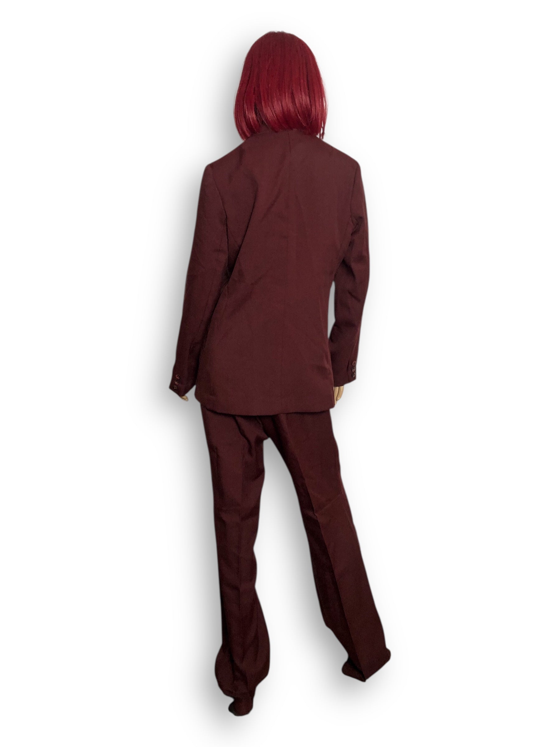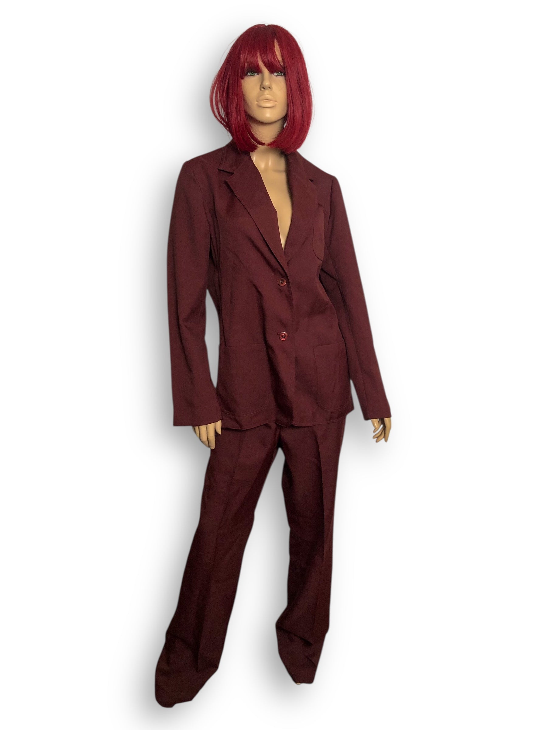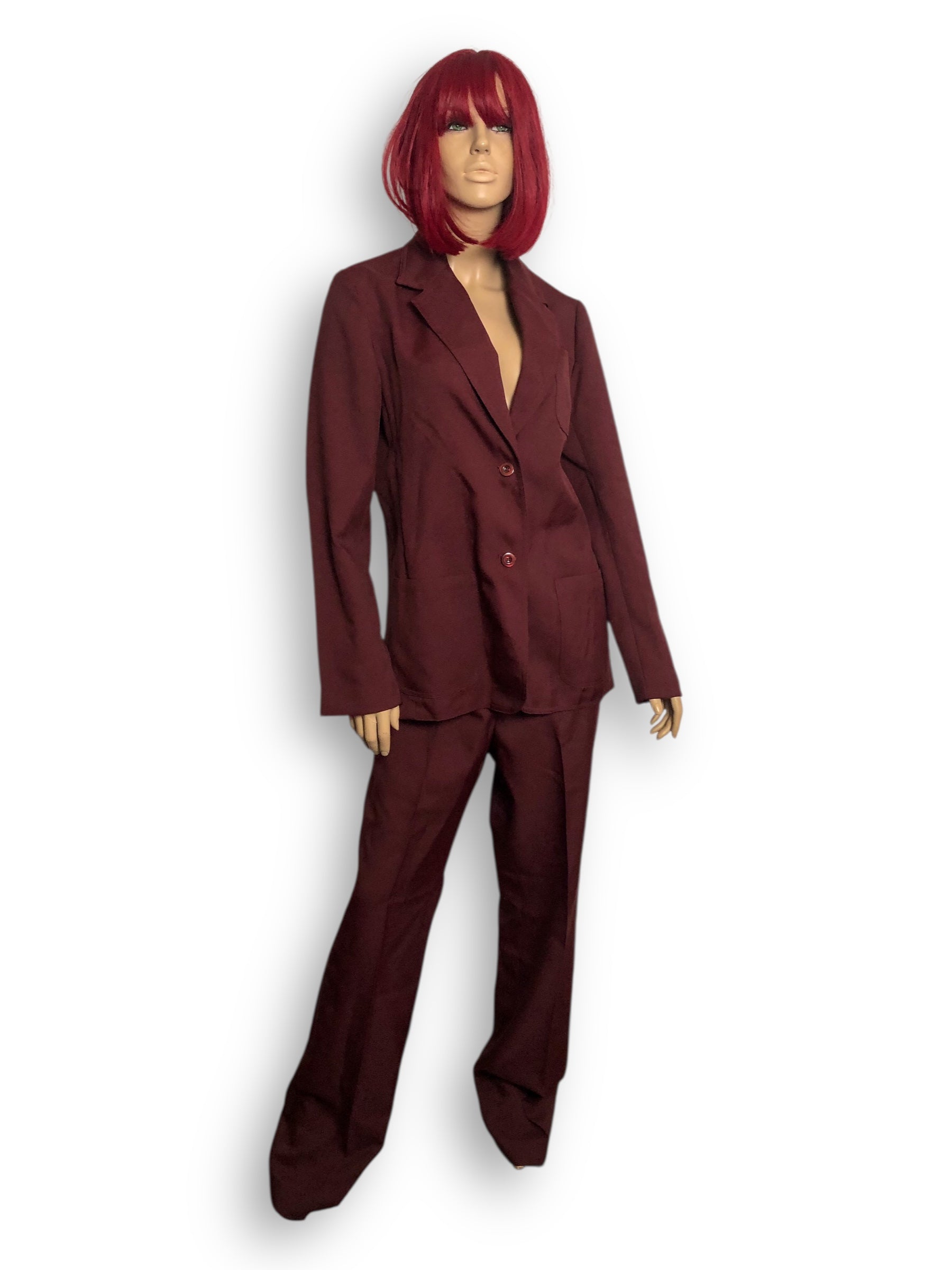 groovy blazer + pant set~ buttons down the front + at the cuffs, shirt pocket, and front pockets on the blazer, semi-elastic waistband and button + zipper closure on the pants, 100% polyester, made in Taiwan