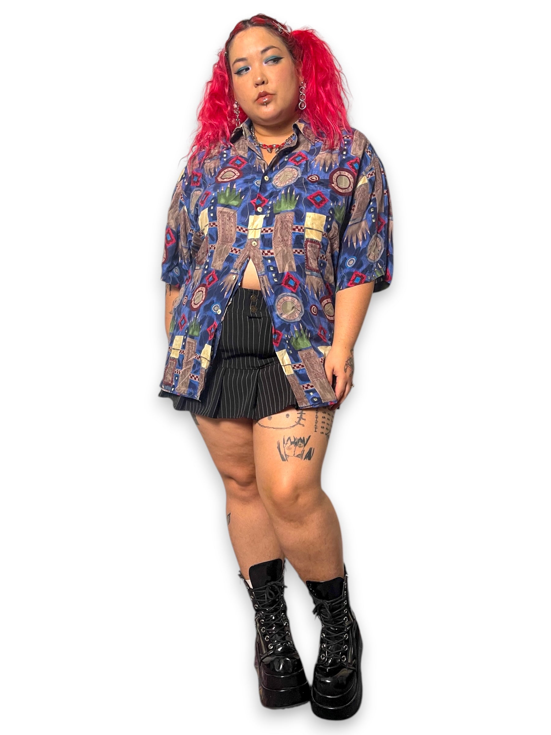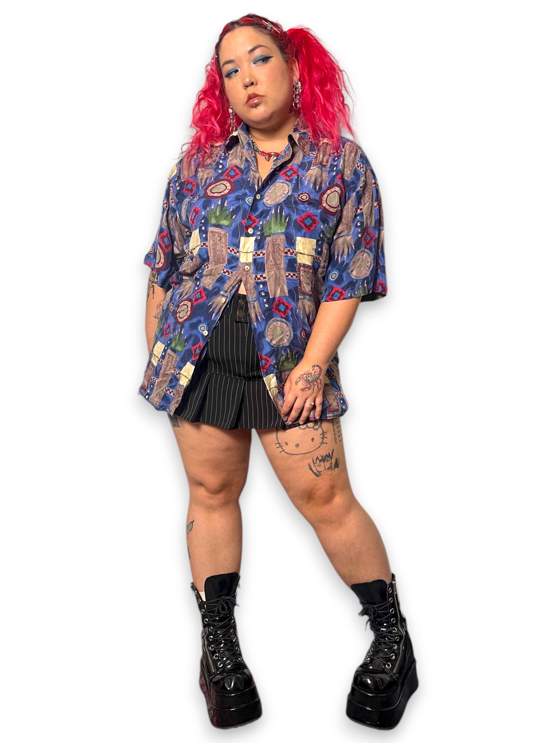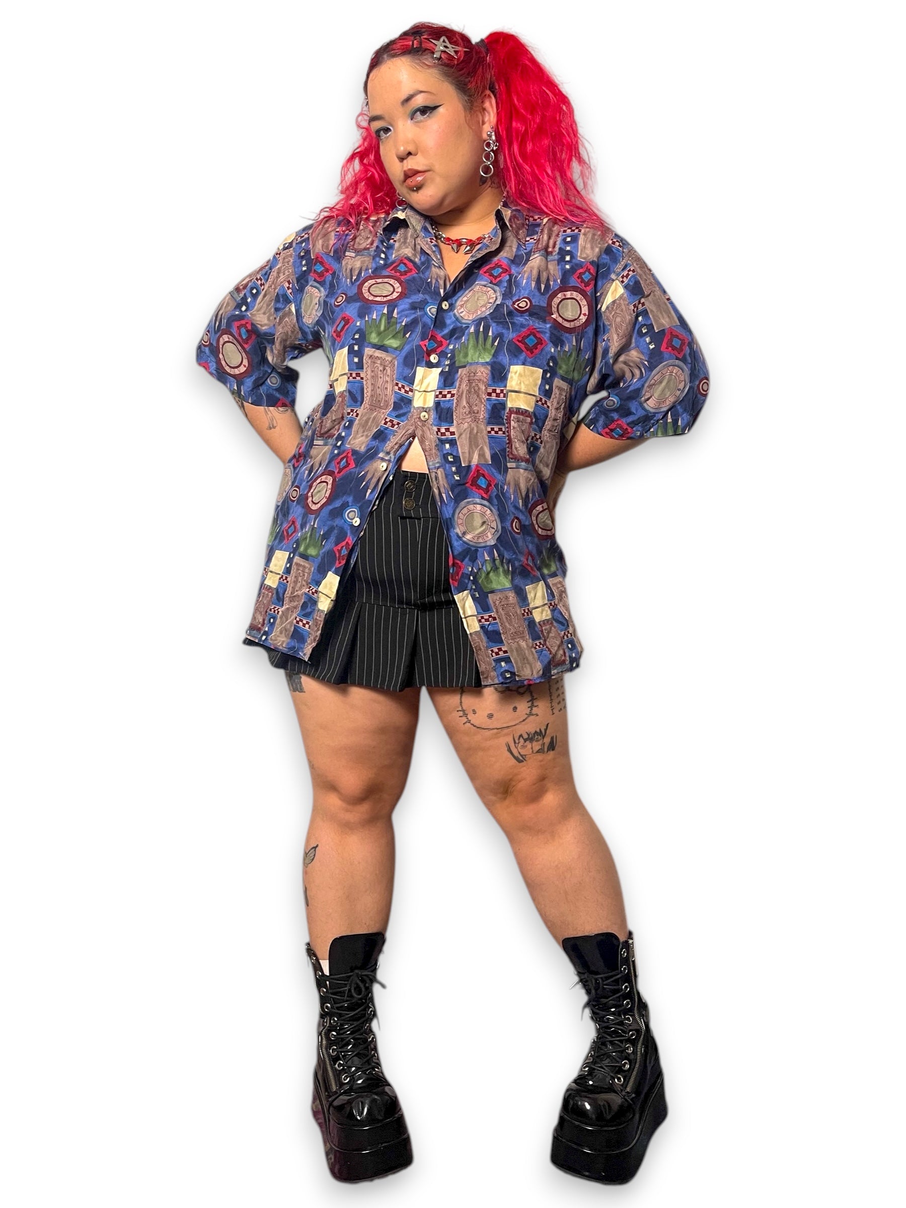 100% silk <3 really sick travel-inspired imagery, buttons down the front, shirt pocket, made in Korea