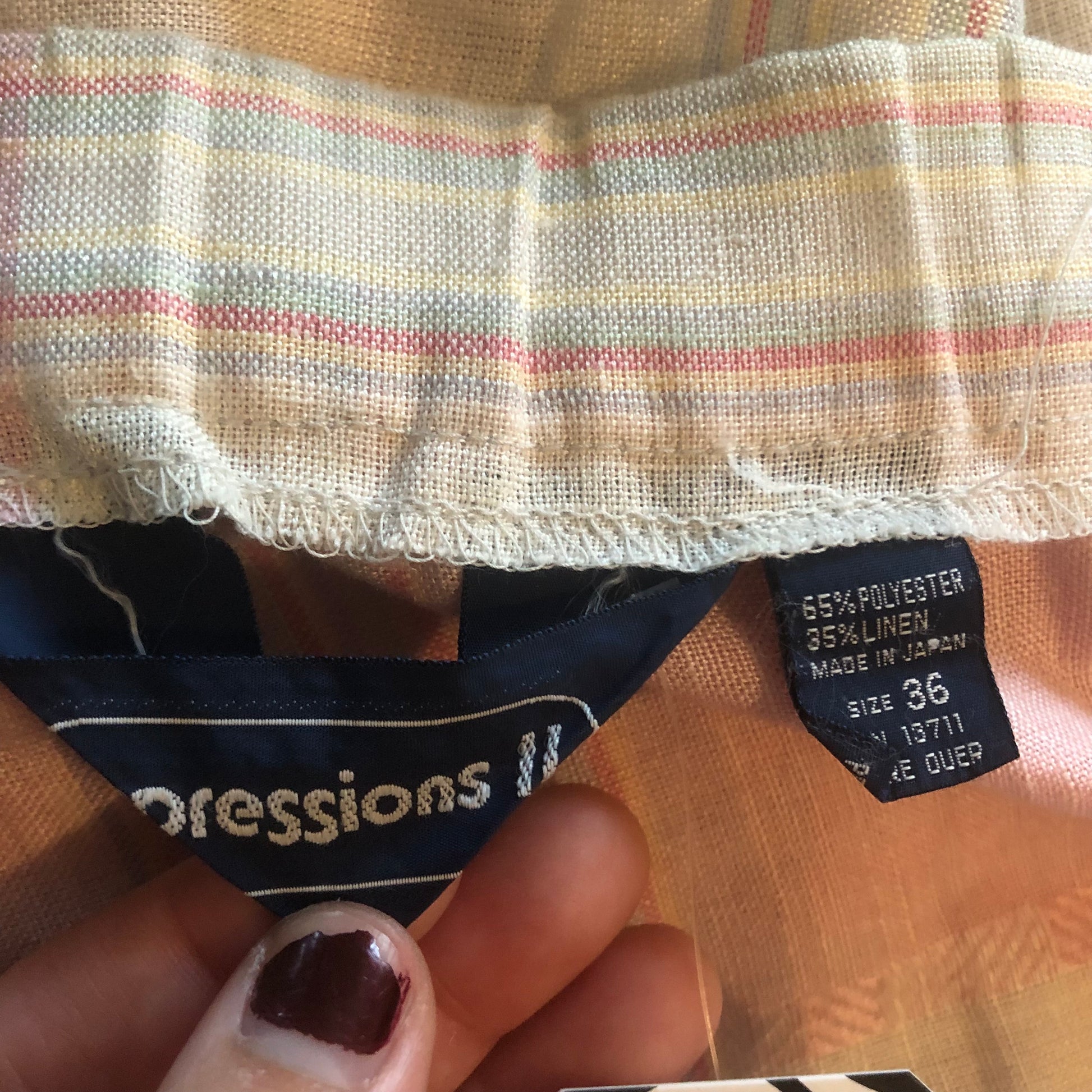 semi-elastic waistband, side button closure, side pockets, sturdy woven fabric (65% polyester 35% linen), made in Japan