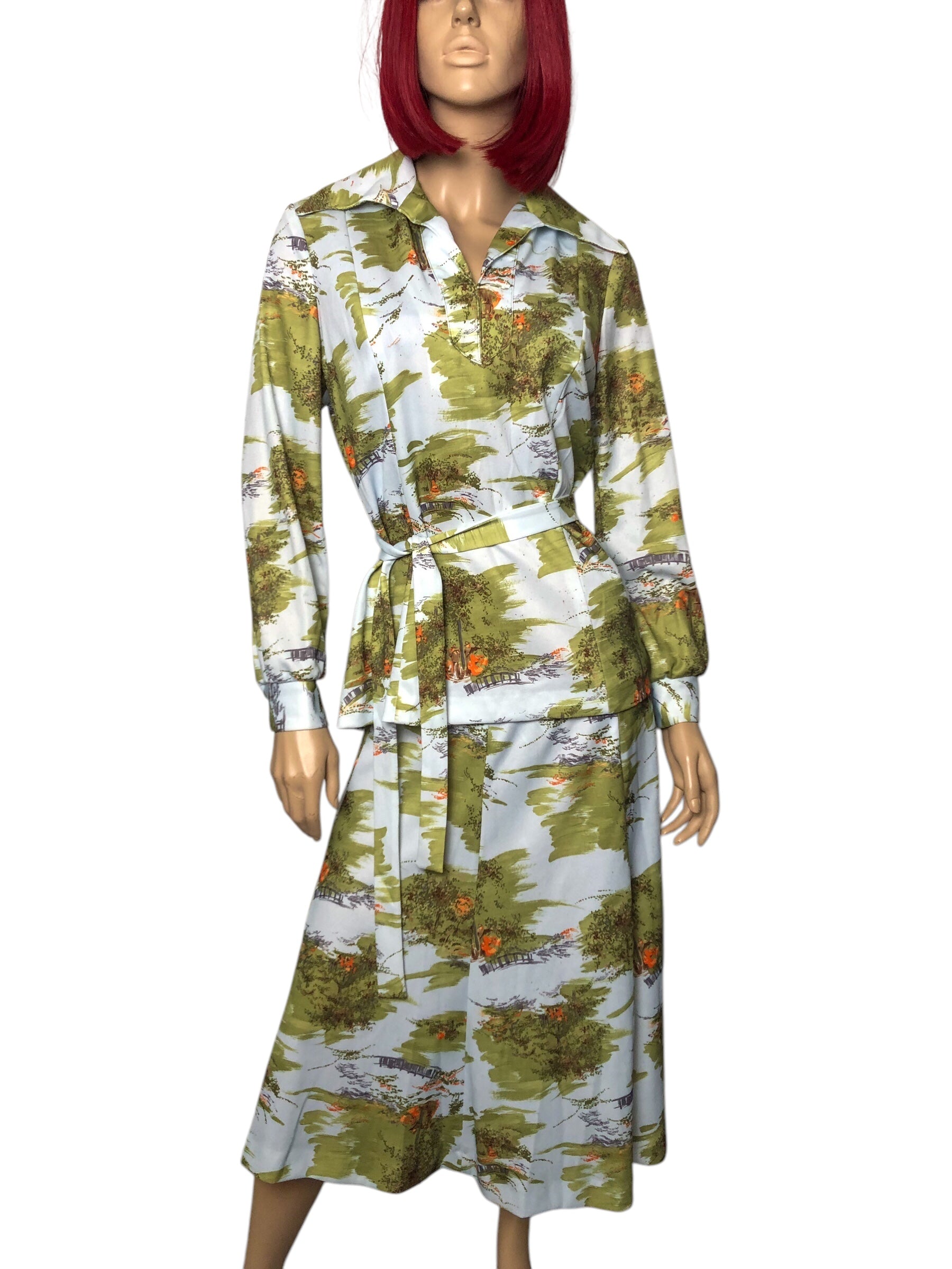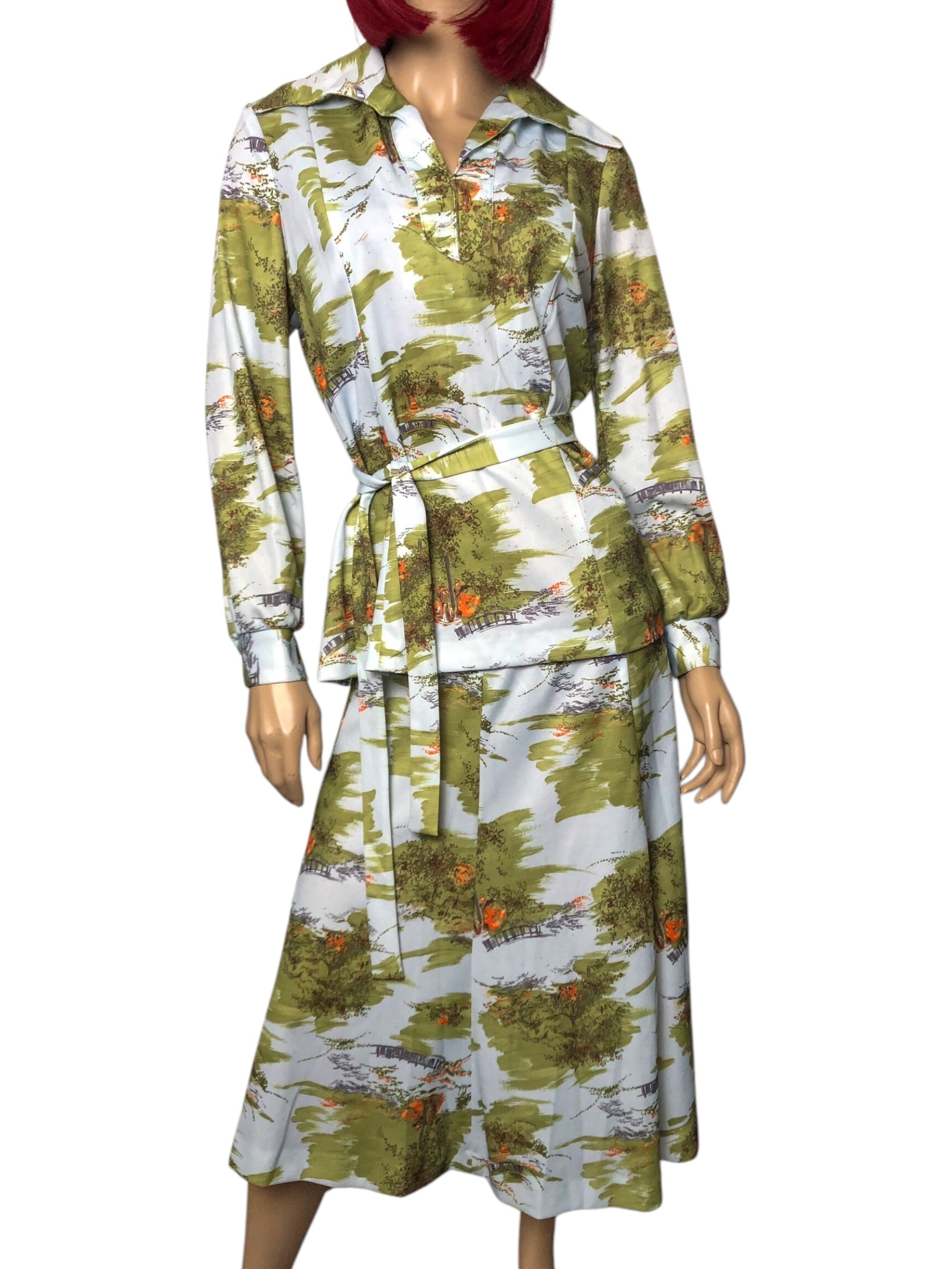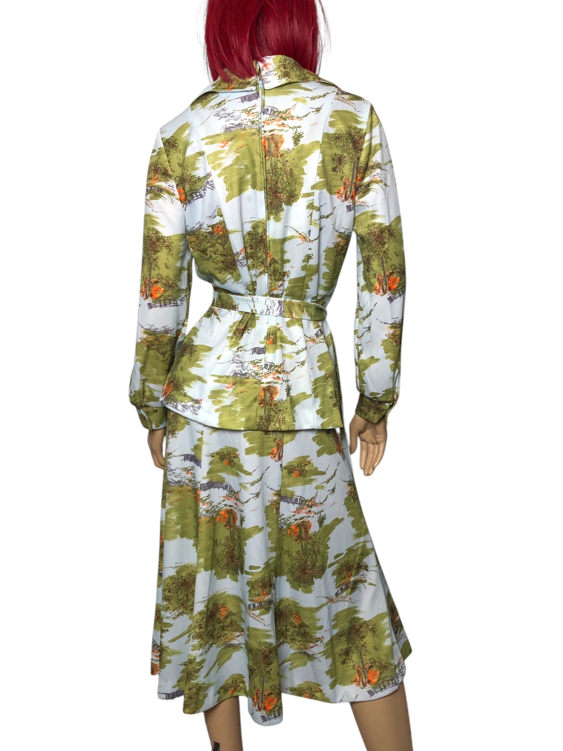 watercolor scenic landscape print throughout, rear clasp + zipper on the blouse, buttons at the cuffs, stretchy elastic waistband on the skirt, some stretch throughout (feels like polyester)