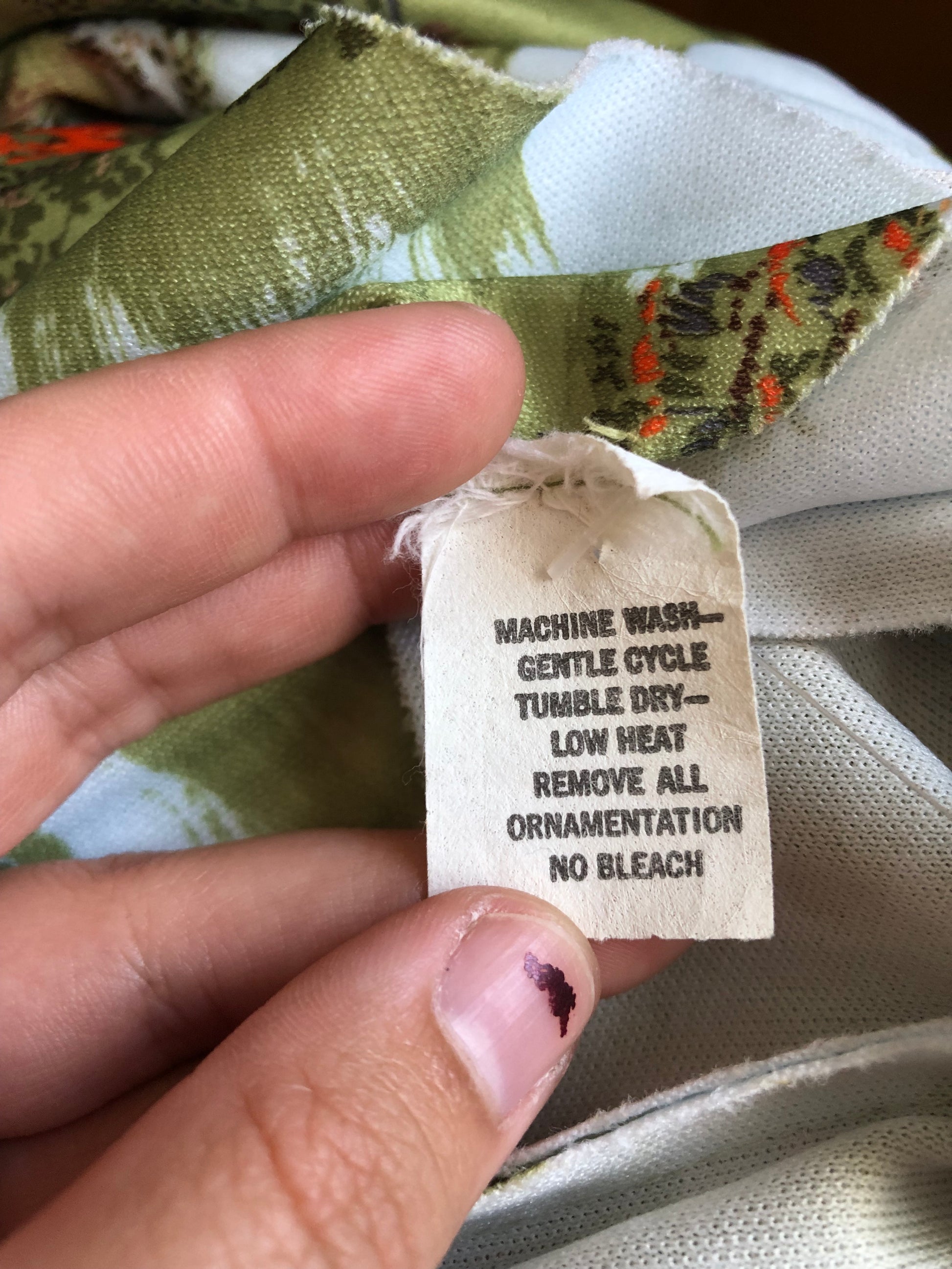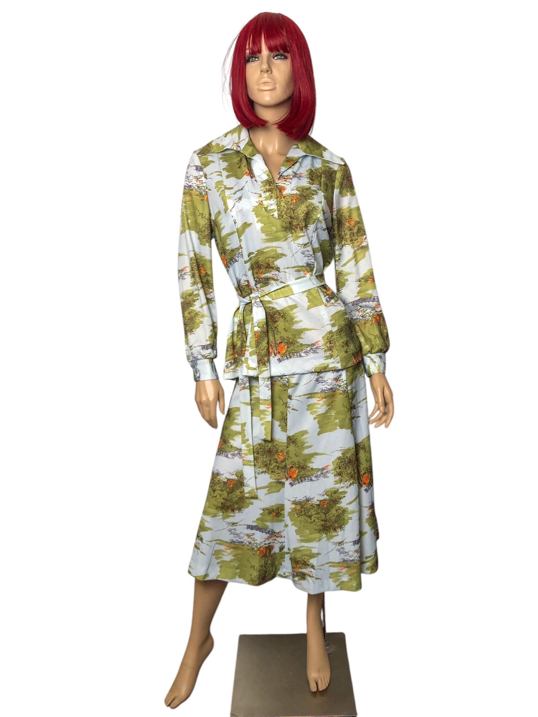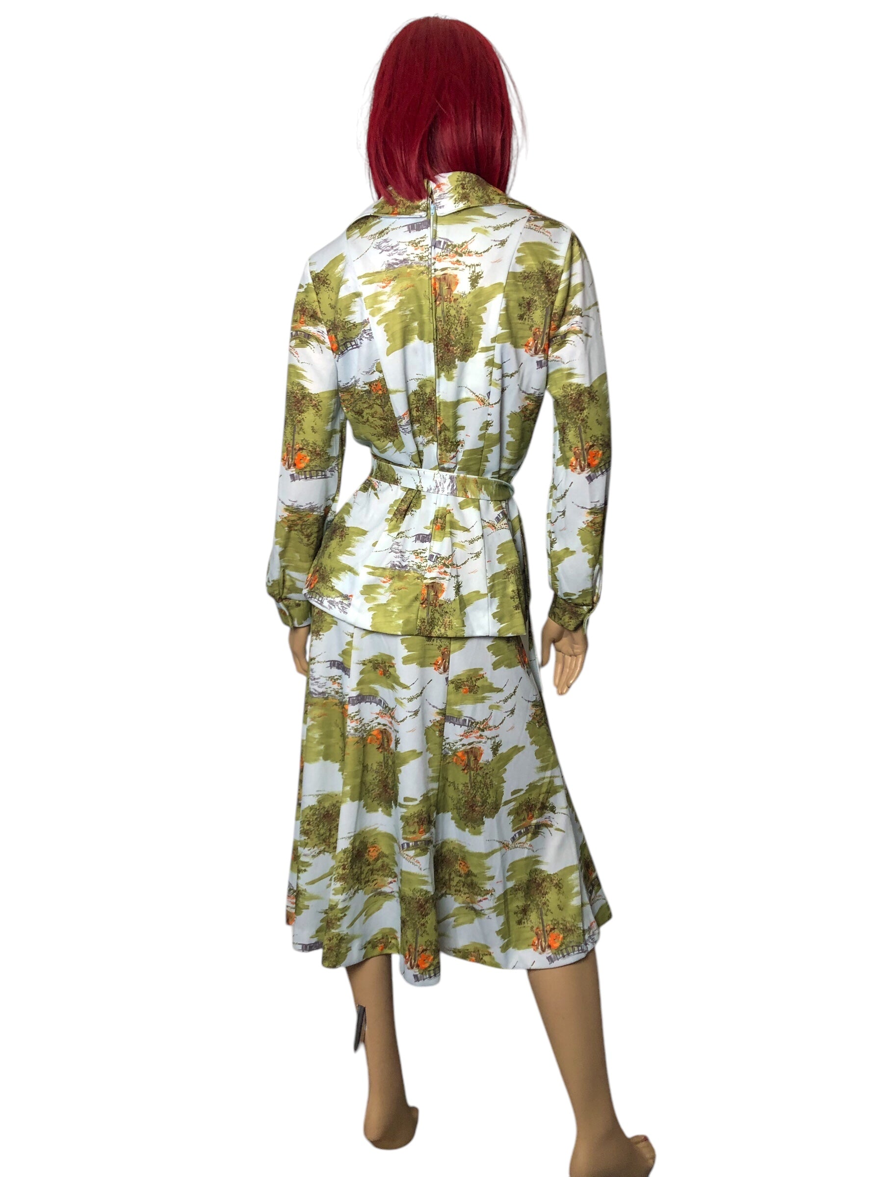 watercolor scenic landscape print throughout, rear clasp + zipper on the blouse, buttons at the cuffs, stretchy elastic waistband on the skirt, some stretch throughout (feels like polyester)
