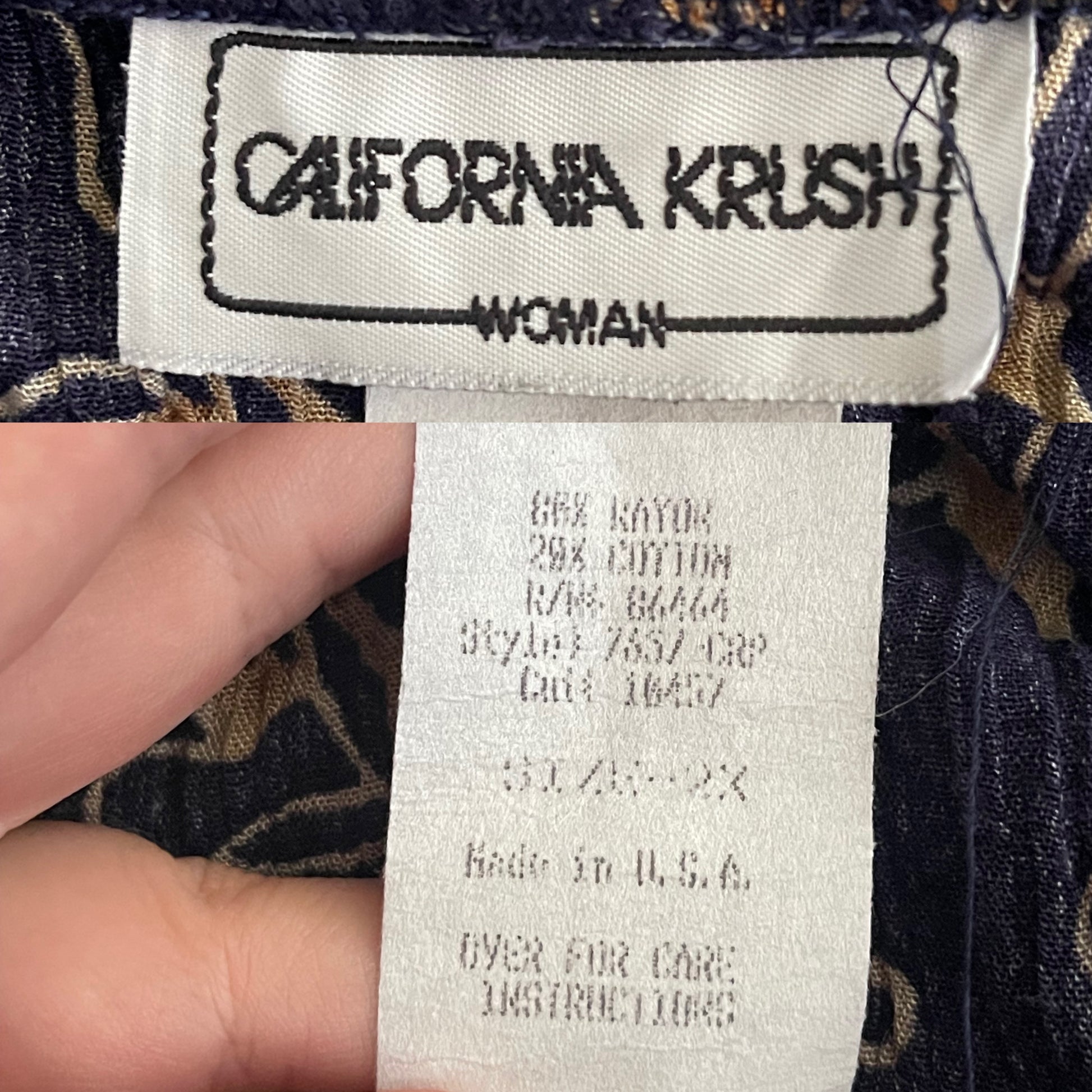button down blouse w/ shoulder pads, midi skirt w/ elastic waistband, lightweight crinkled fabric (80% rayon 20% cotton), made in USA