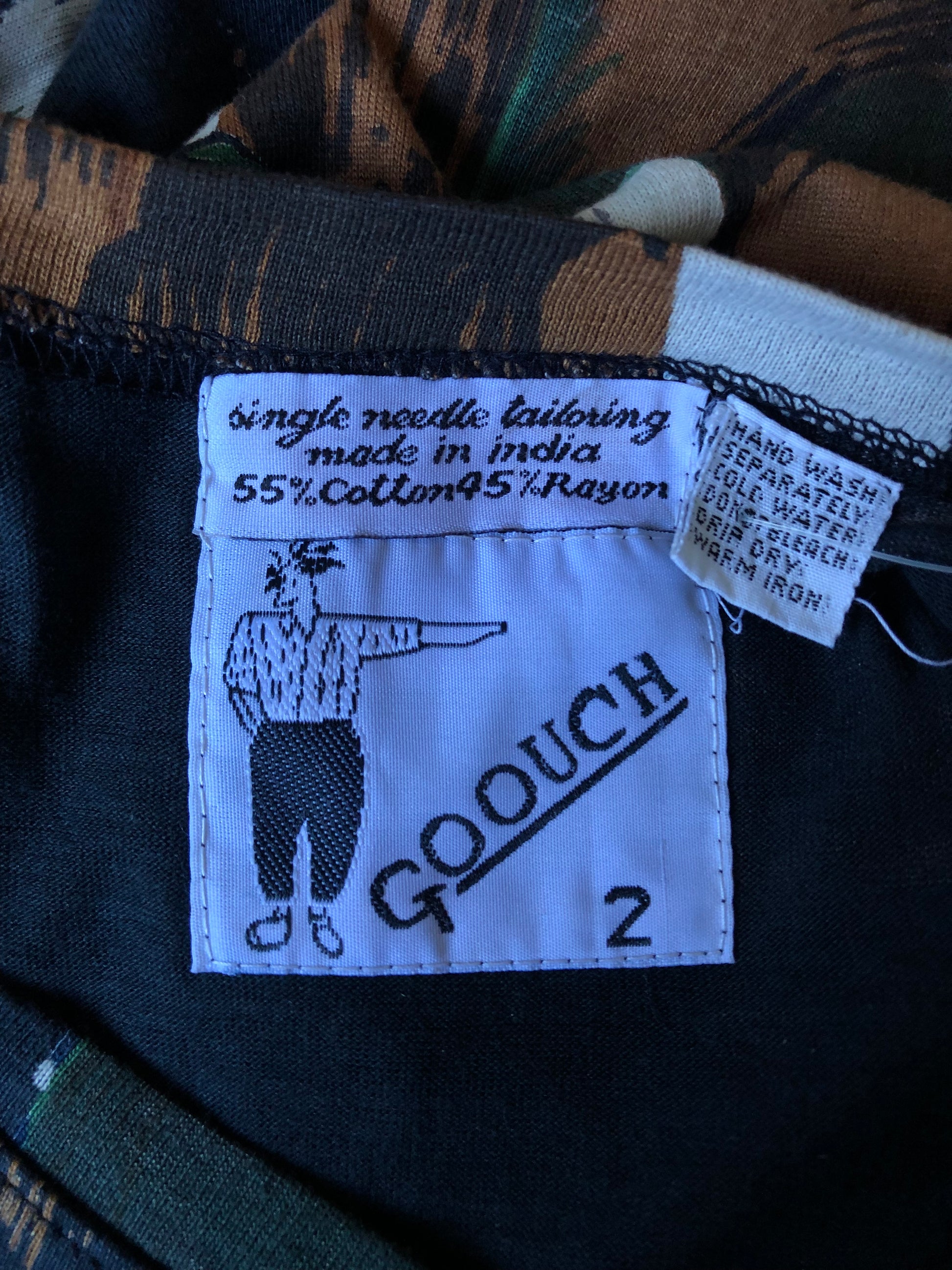 deadstock w/ tags! looks like a well surrounded by pitchers, some stretch (55% cotton 45% rayon), single needle tailoring, made in India