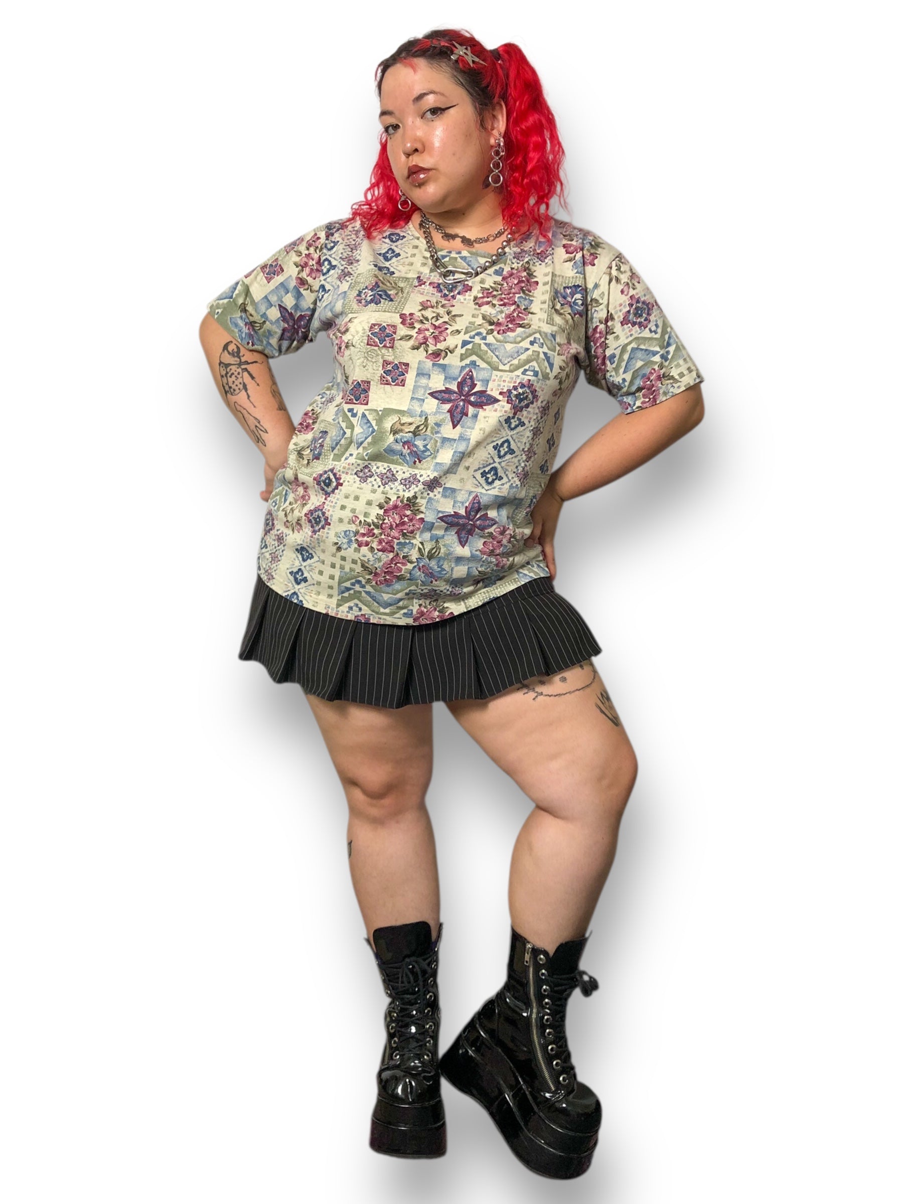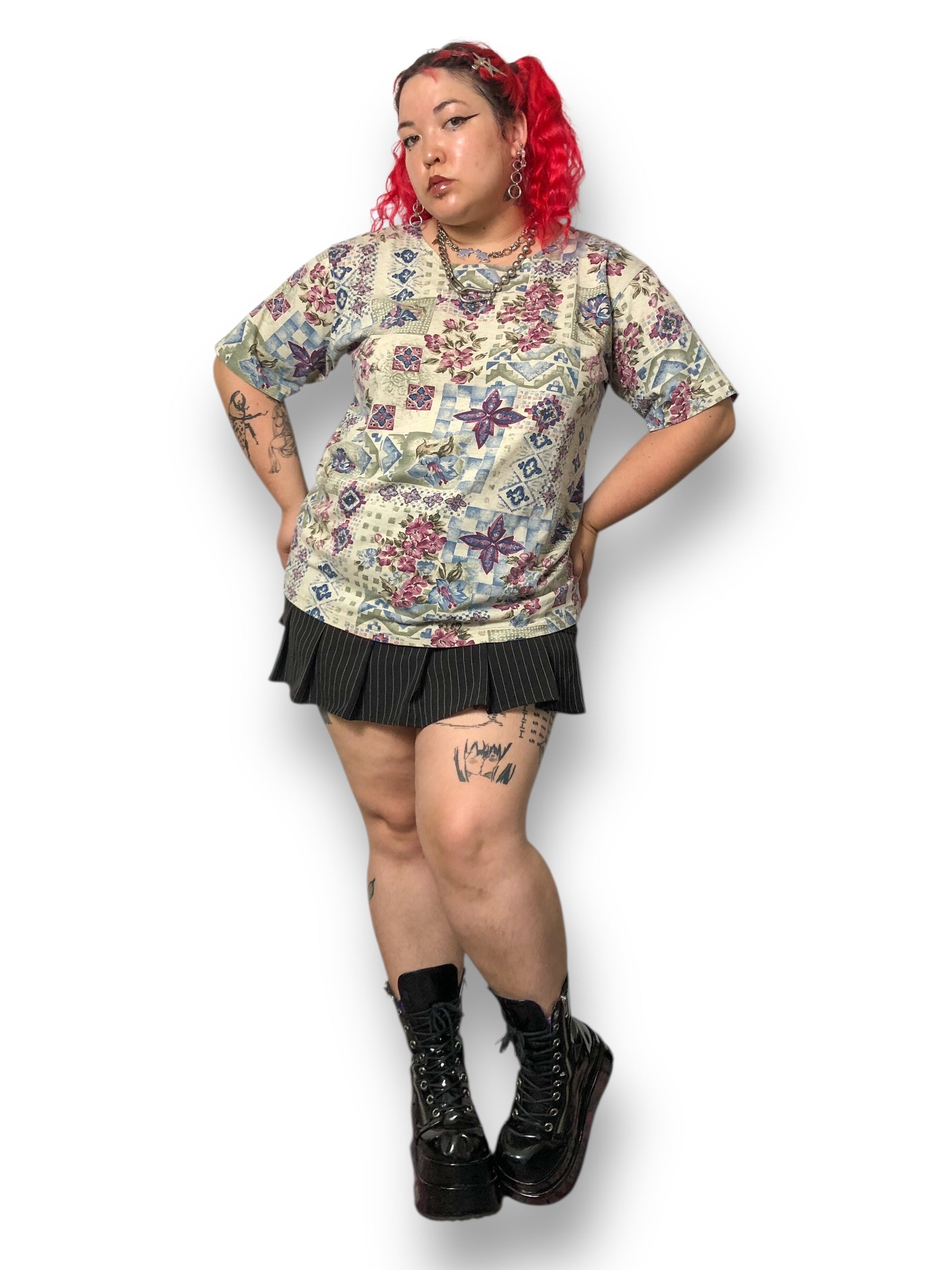 boho grandma vibes~ floral and geometric print throughout, some stretch (50% polyester 49% cotton 1% rayon)