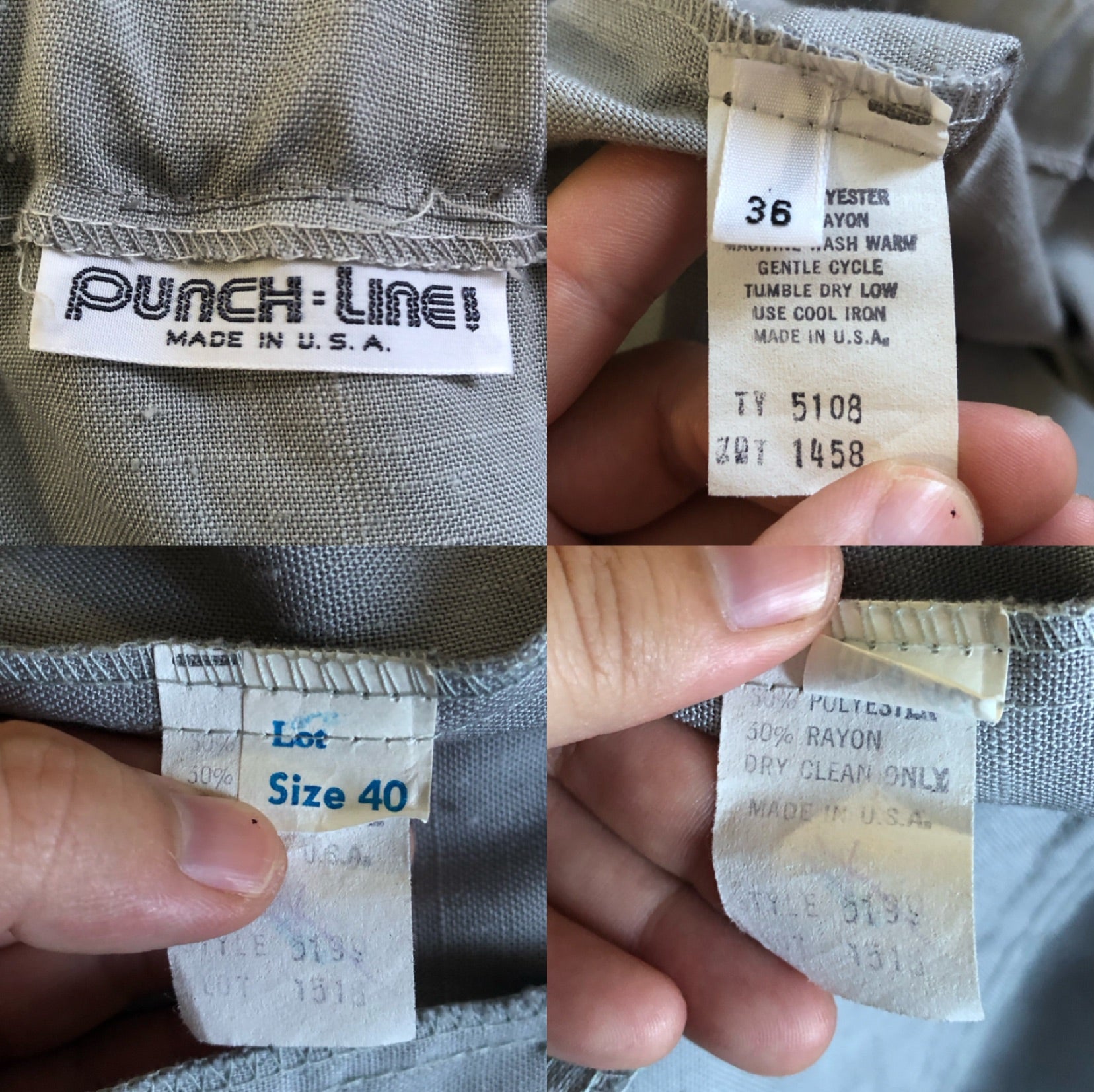 blazer has shoulder pads + front pockets, skirt has a semi-elastic waistband, double side button closure, + side pockets, 50% polyester 50% rayon, made in USA