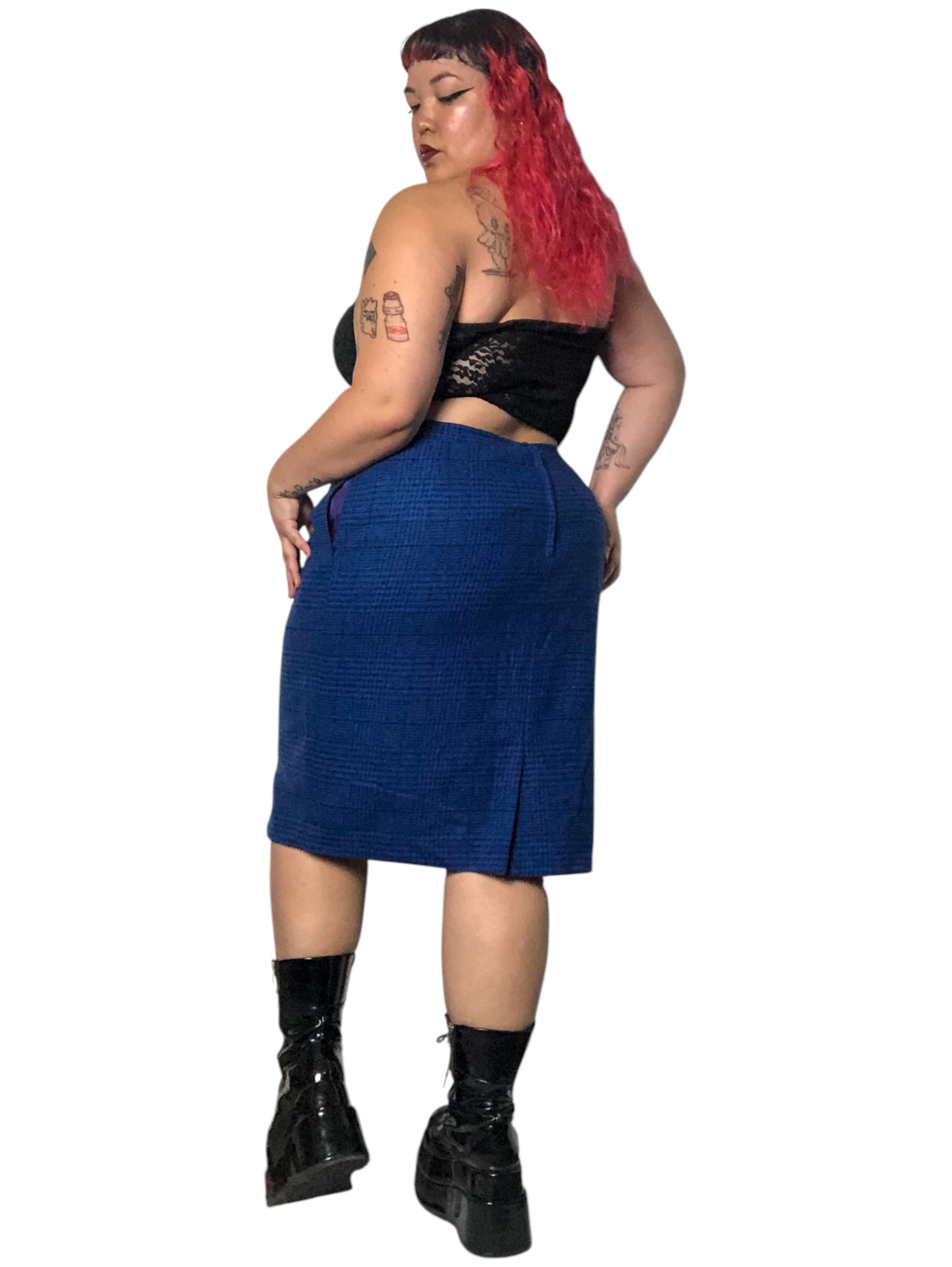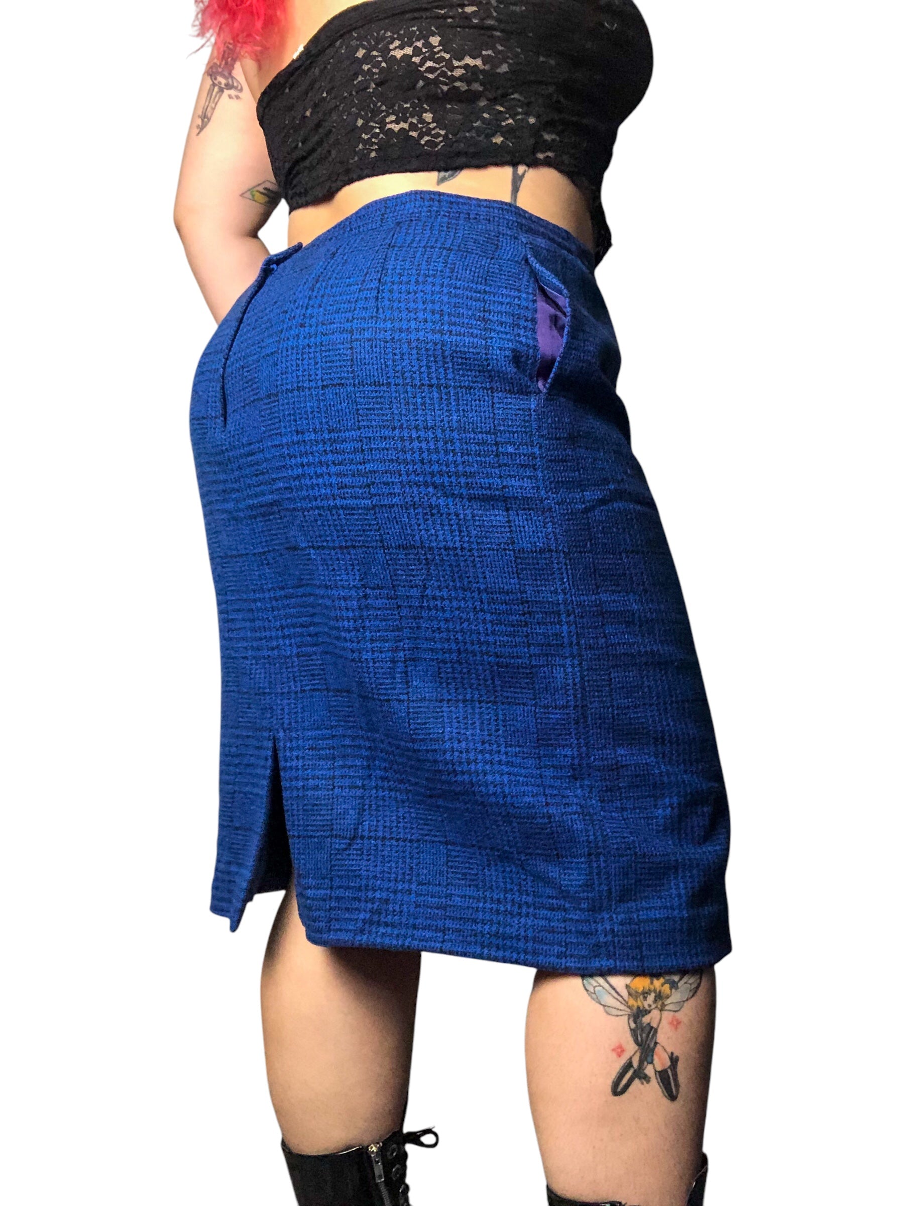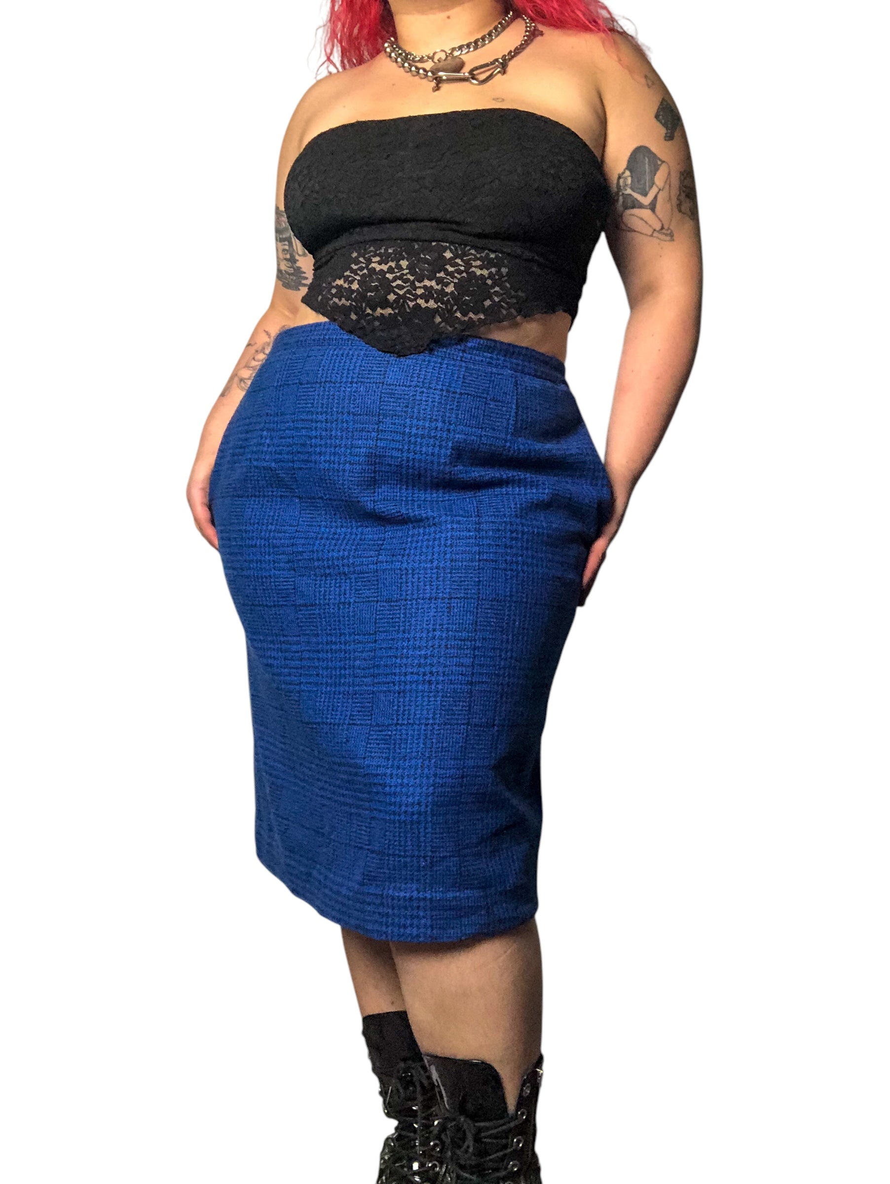 80’s Daniel Niveau Blue and Black Houndstooth Plaid Pencil Skirt (2X)