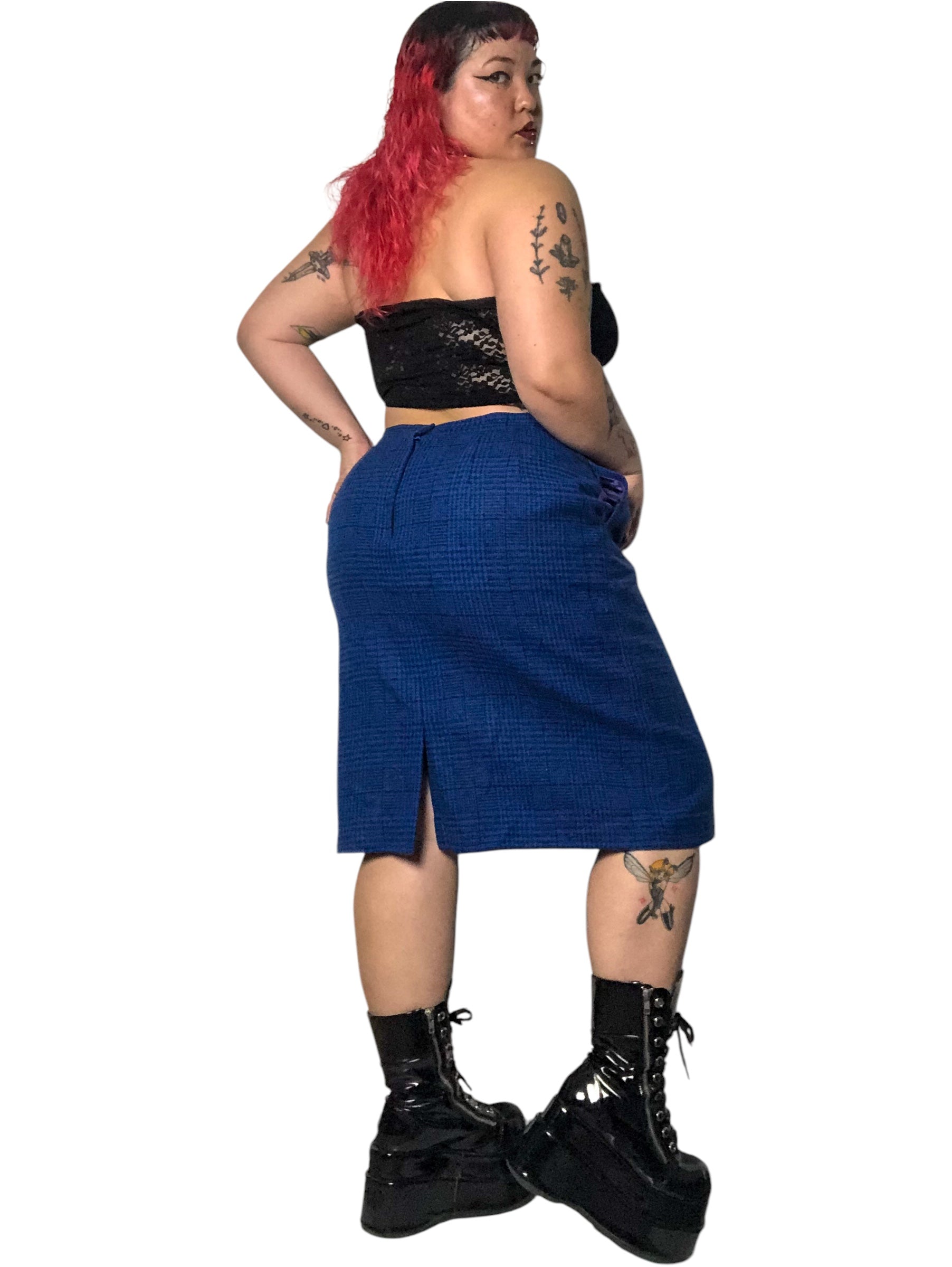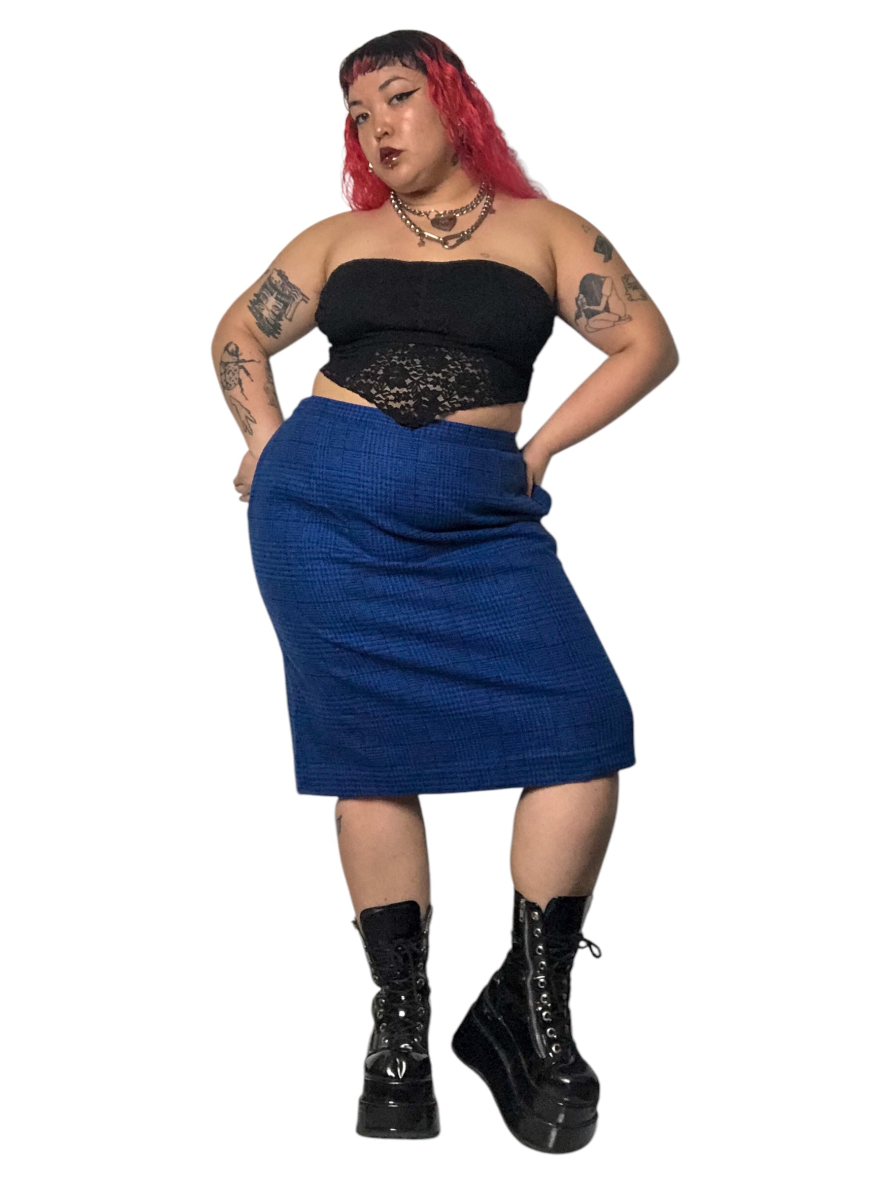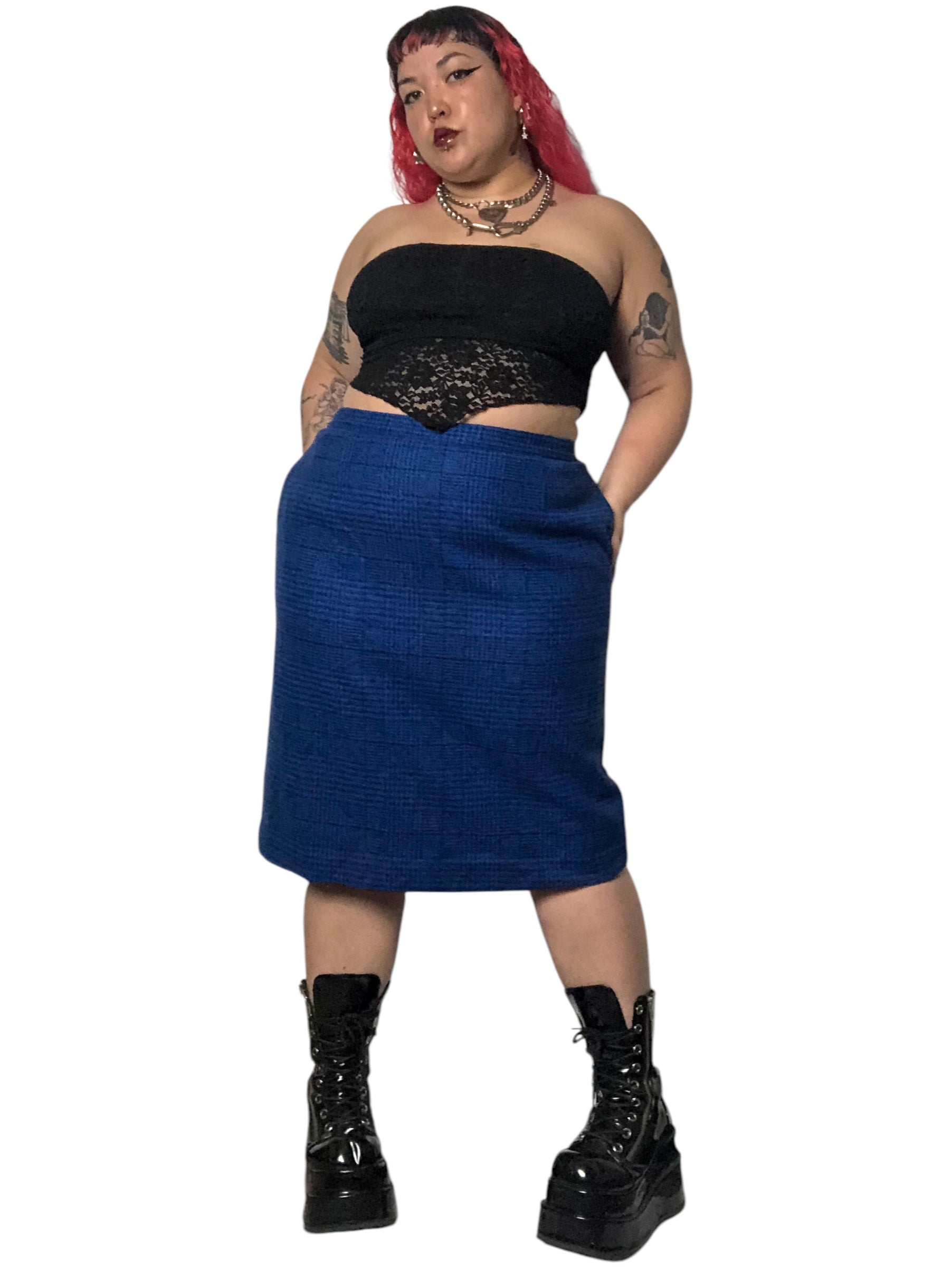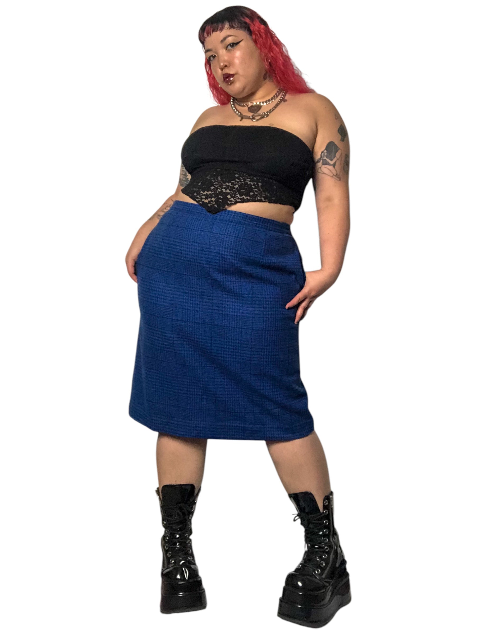 80’s Daniel Niveau Blue and Black Houndstooth Plaid Pencil Skirt (2X)