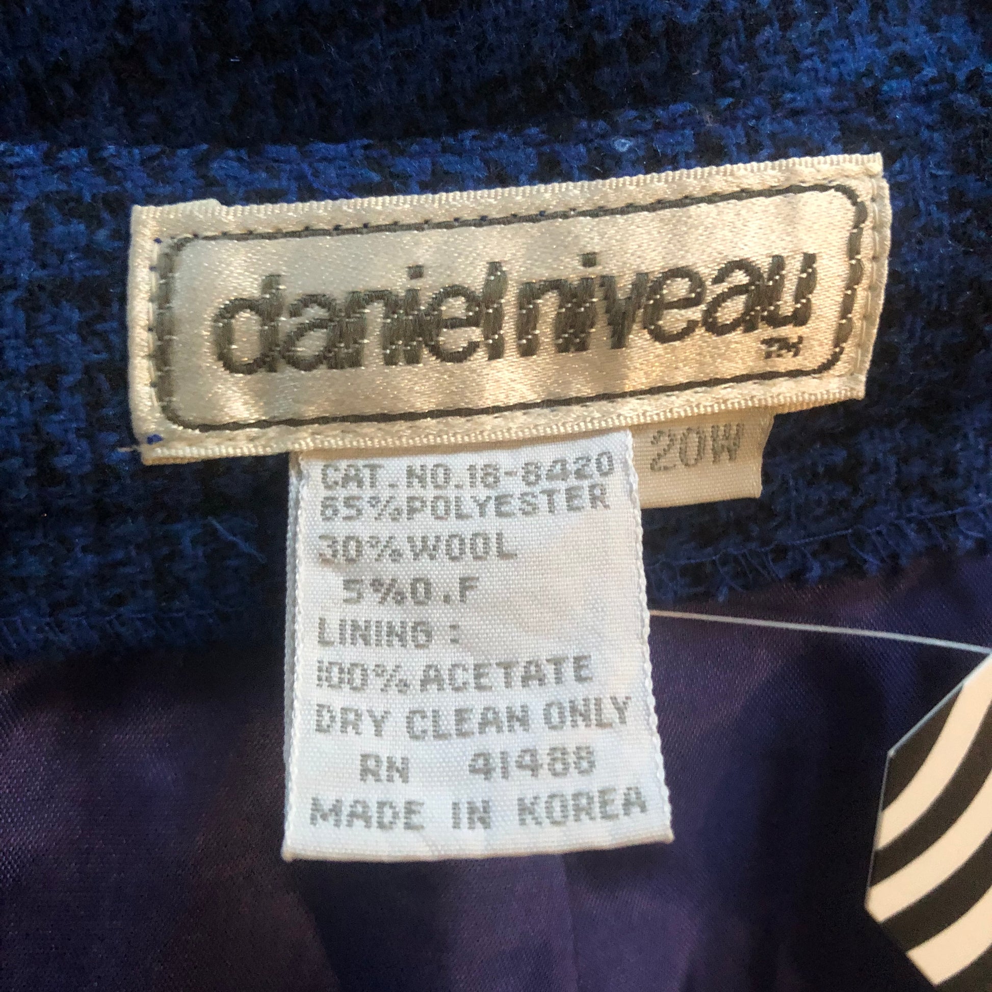 knit shell (65% polyester 30% wool 5% other fibers), acetate lining, rear button + zipper closure, side pockets, made in Korea