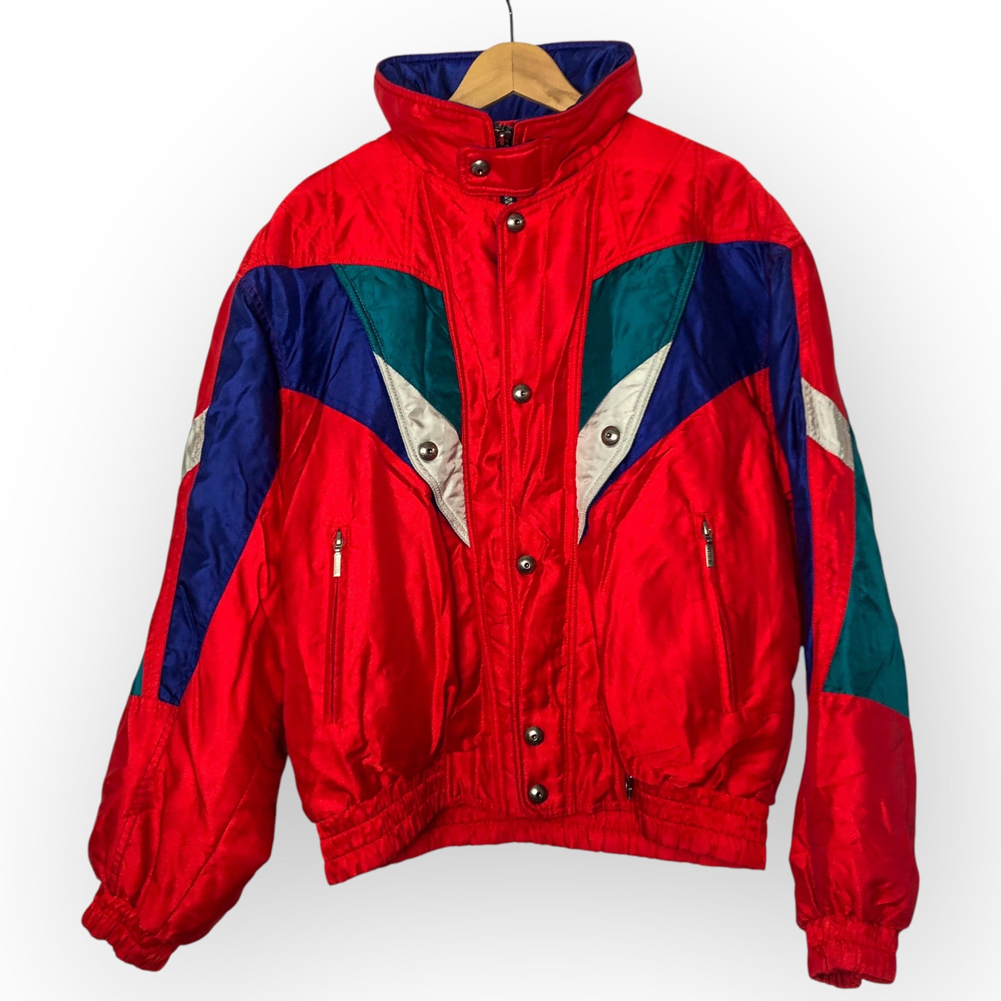 retro winter outerwear! zipper + snap button closures, elastic cuffs + waistband, blue, green & white accents, logo embroidery on the sleeves, lightweight hood w/ adjustable drawstring, side zippered pockets, 100% nylon lining & shell, 100% polyester insulation, made in Hong Kong