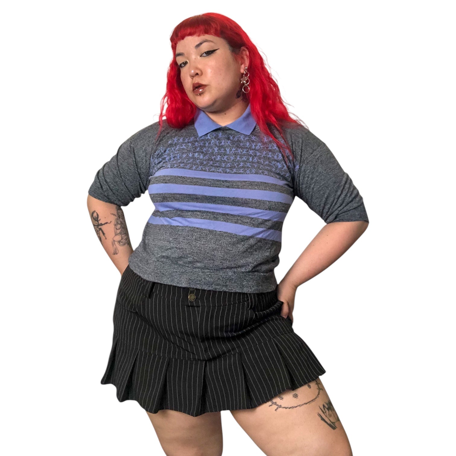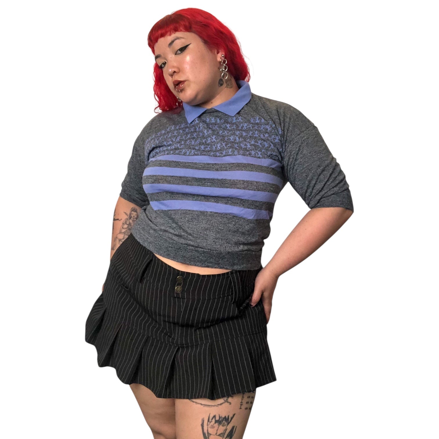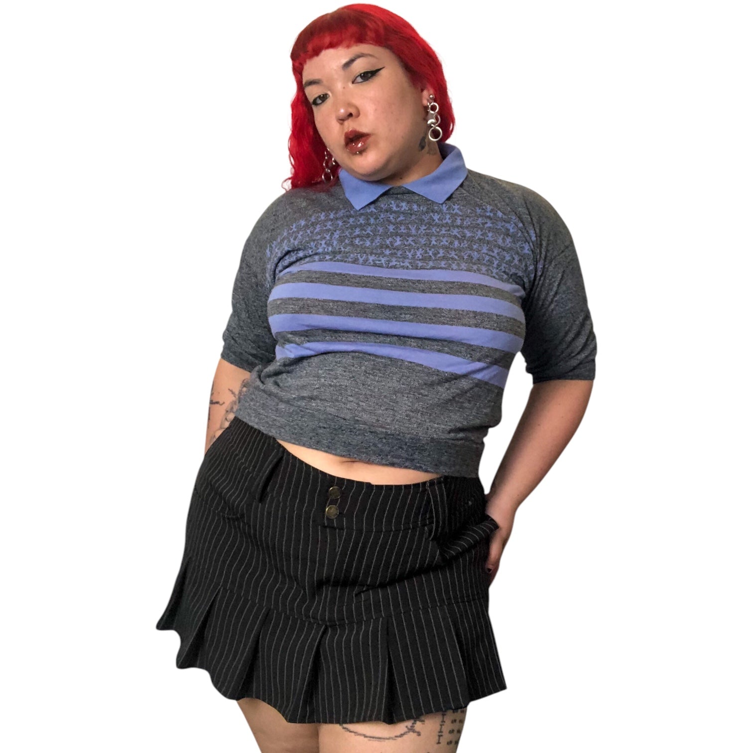 really cool periwinkle blue collar + ‘X’ and stripes print on the front, stretch waistband + some stretch throughout (50% polyester 50% acrylic), made in USA