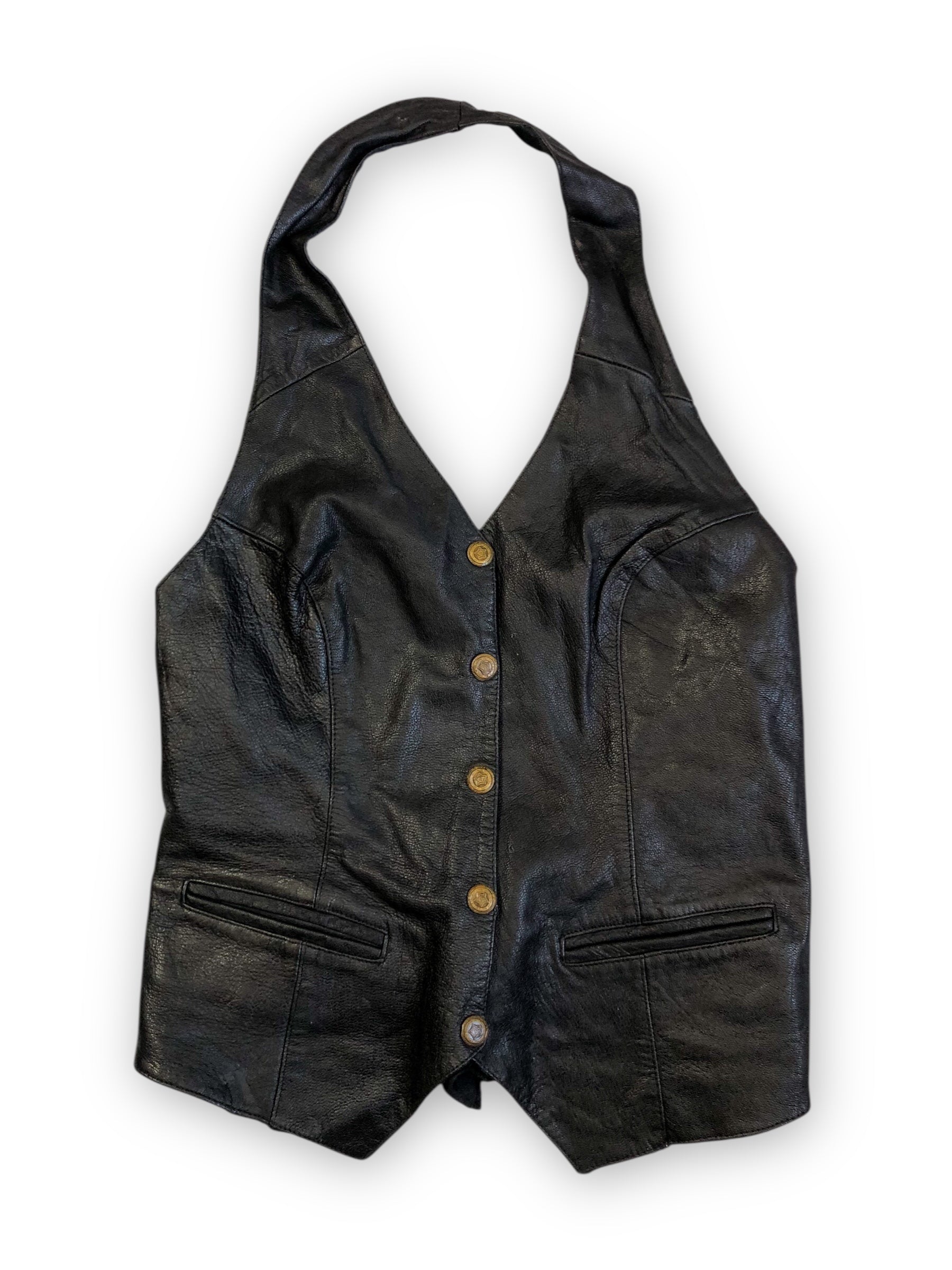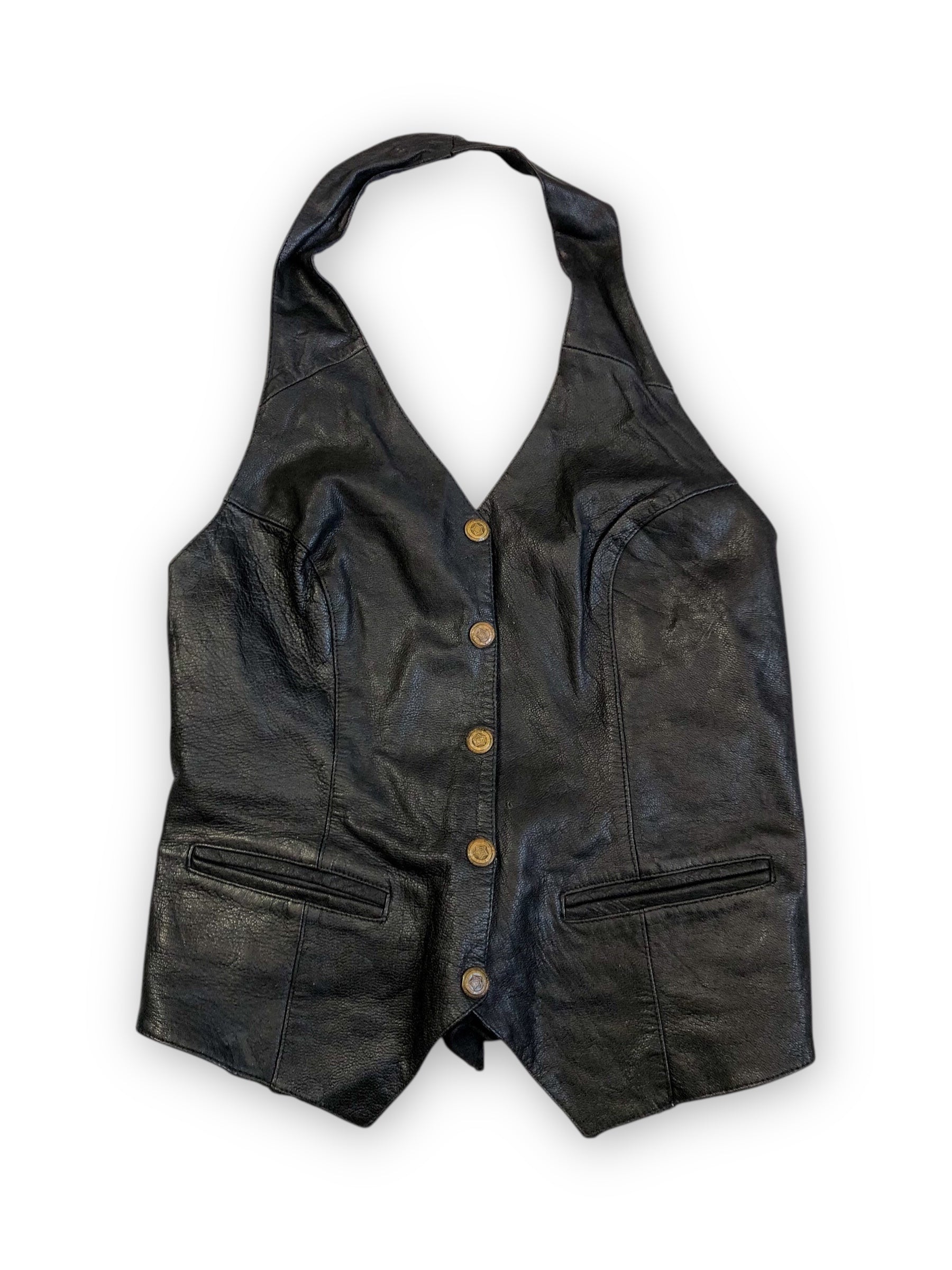 polyester backing w/ waist tie, metal snap buttons down the front, mini pockets, genuine leather shell
