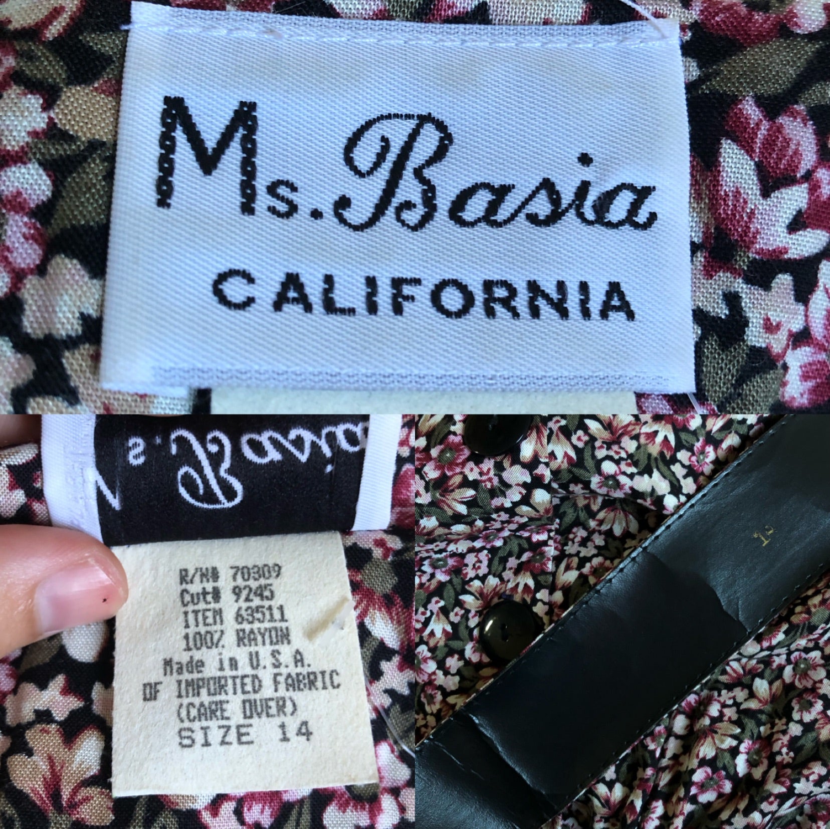 detachable matching belt, chunky black buttons down to the waist, shoulder pads, stretchy elastic waistband, lightweight non-stretch fabric (100% rayon), made in USA