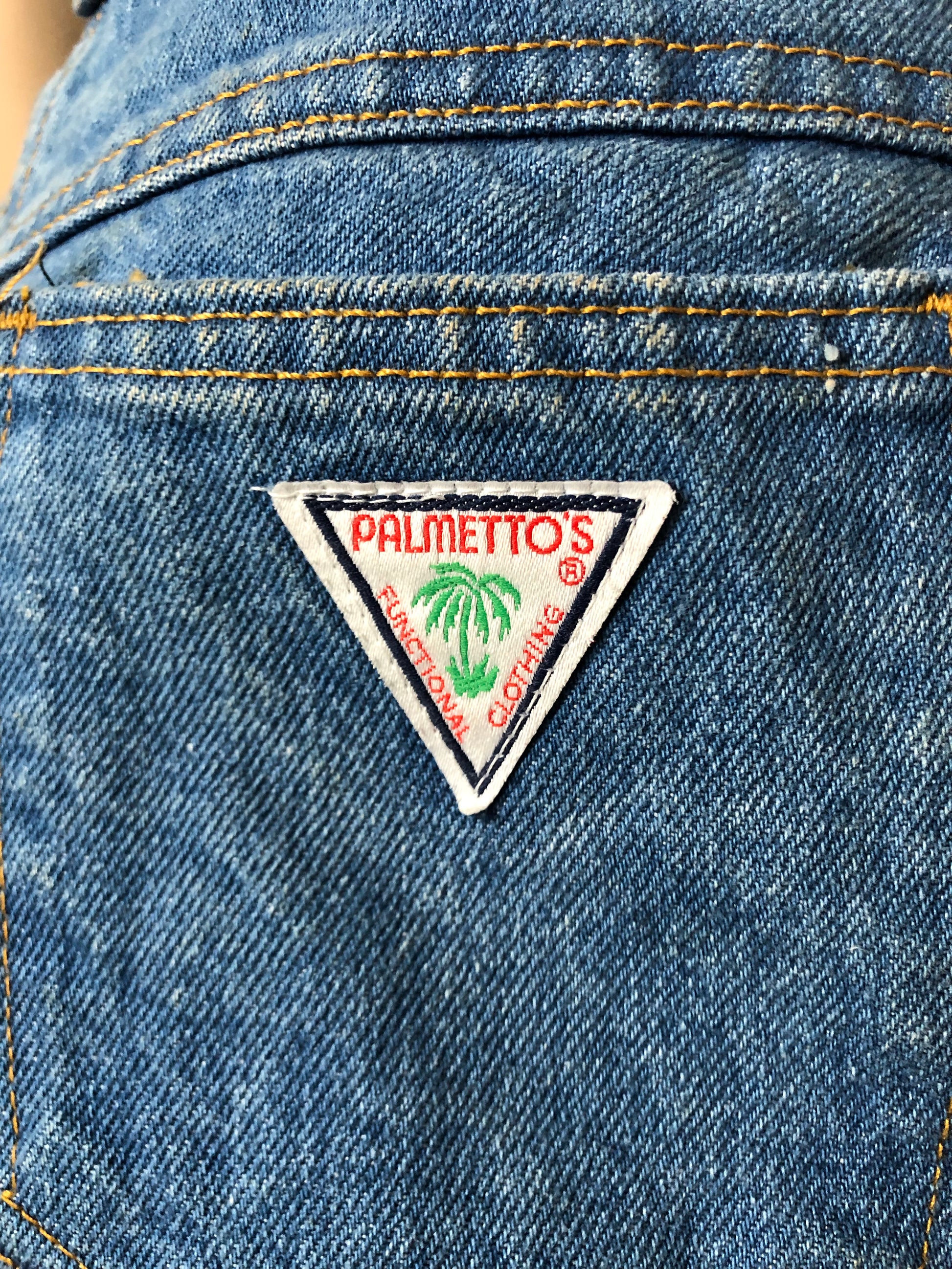 fun studs and bedazzling along the front pockets — it’s giving glam western! belt loops, rear pockets (brand logo on one of them), no stretch (seems like 100% cotton), made in USA