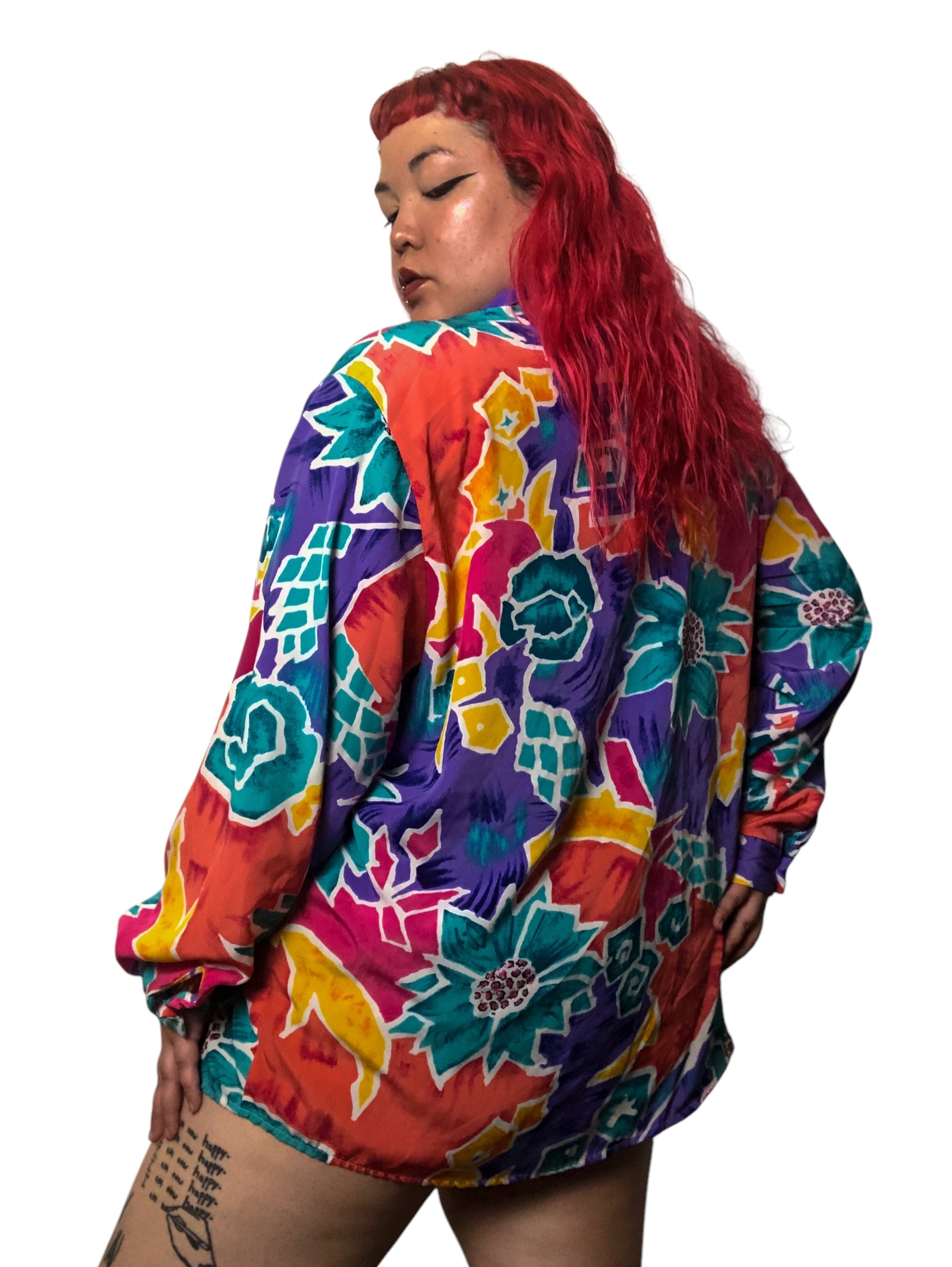 funky floral + geometric patterns throughout! purple buttons down the front + at the cuffs, single stitching, feels like polyester