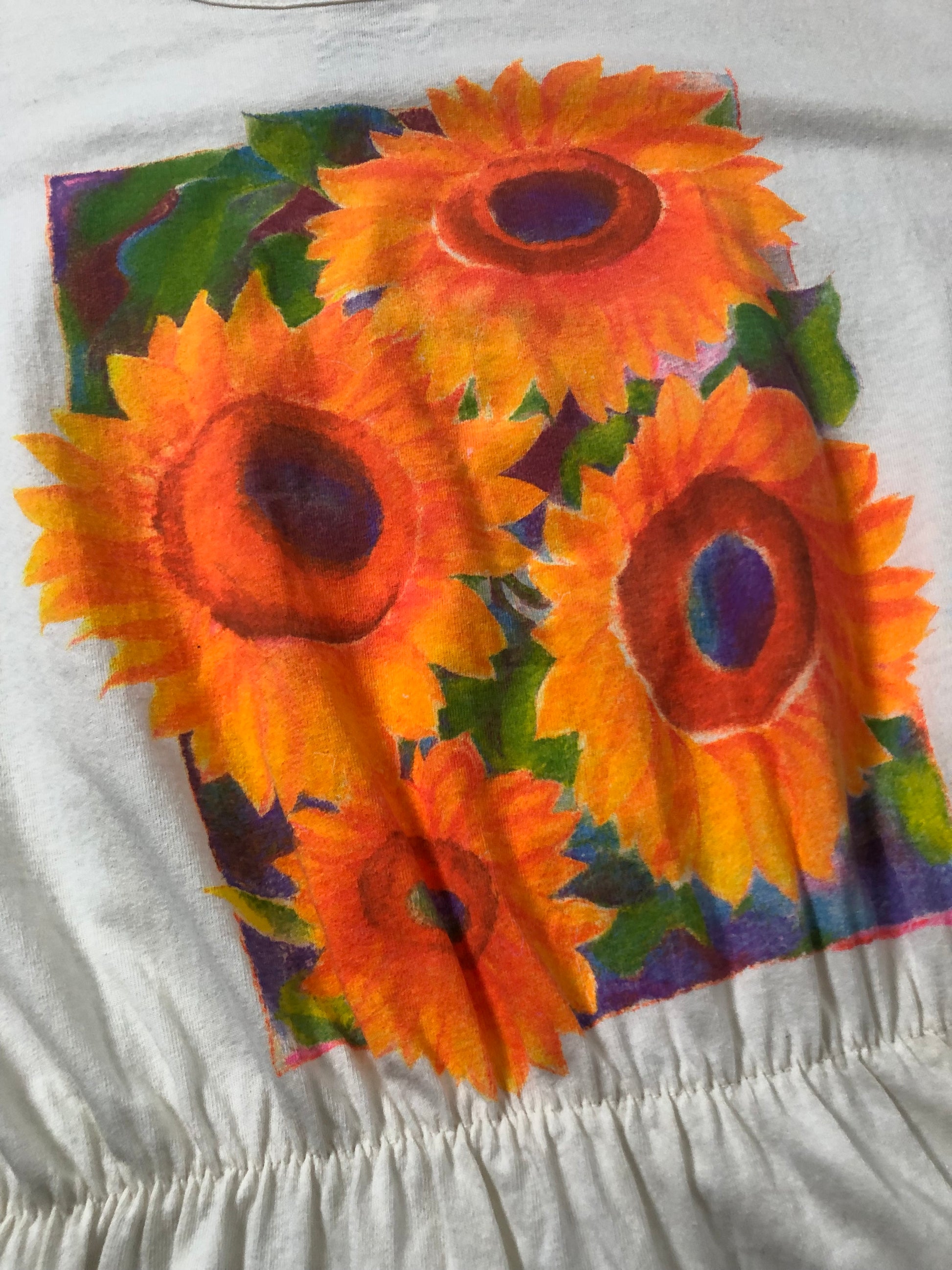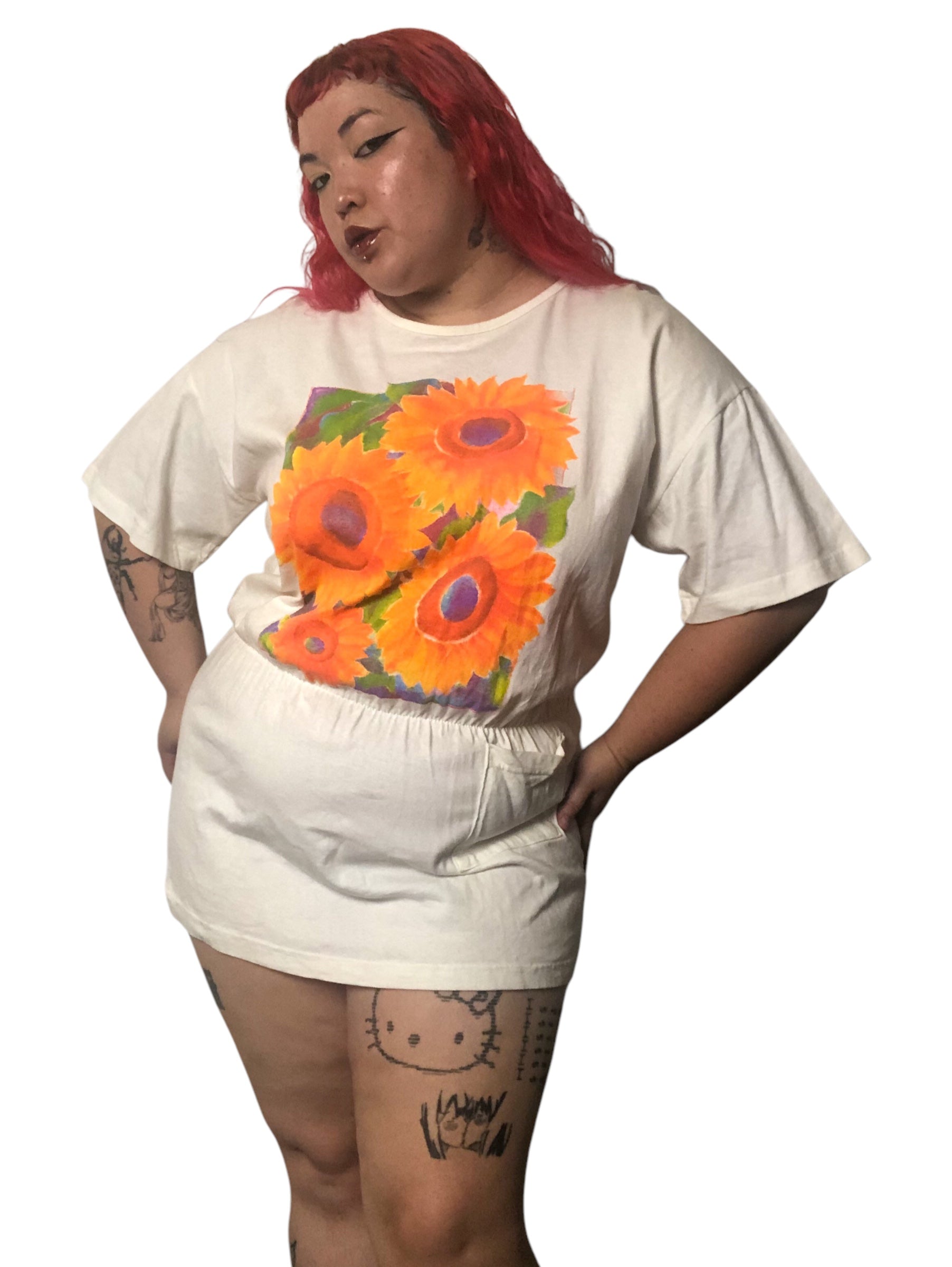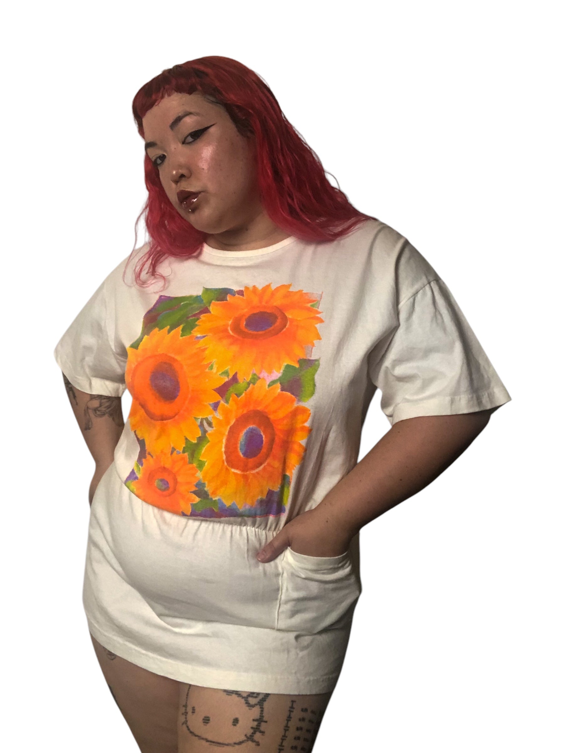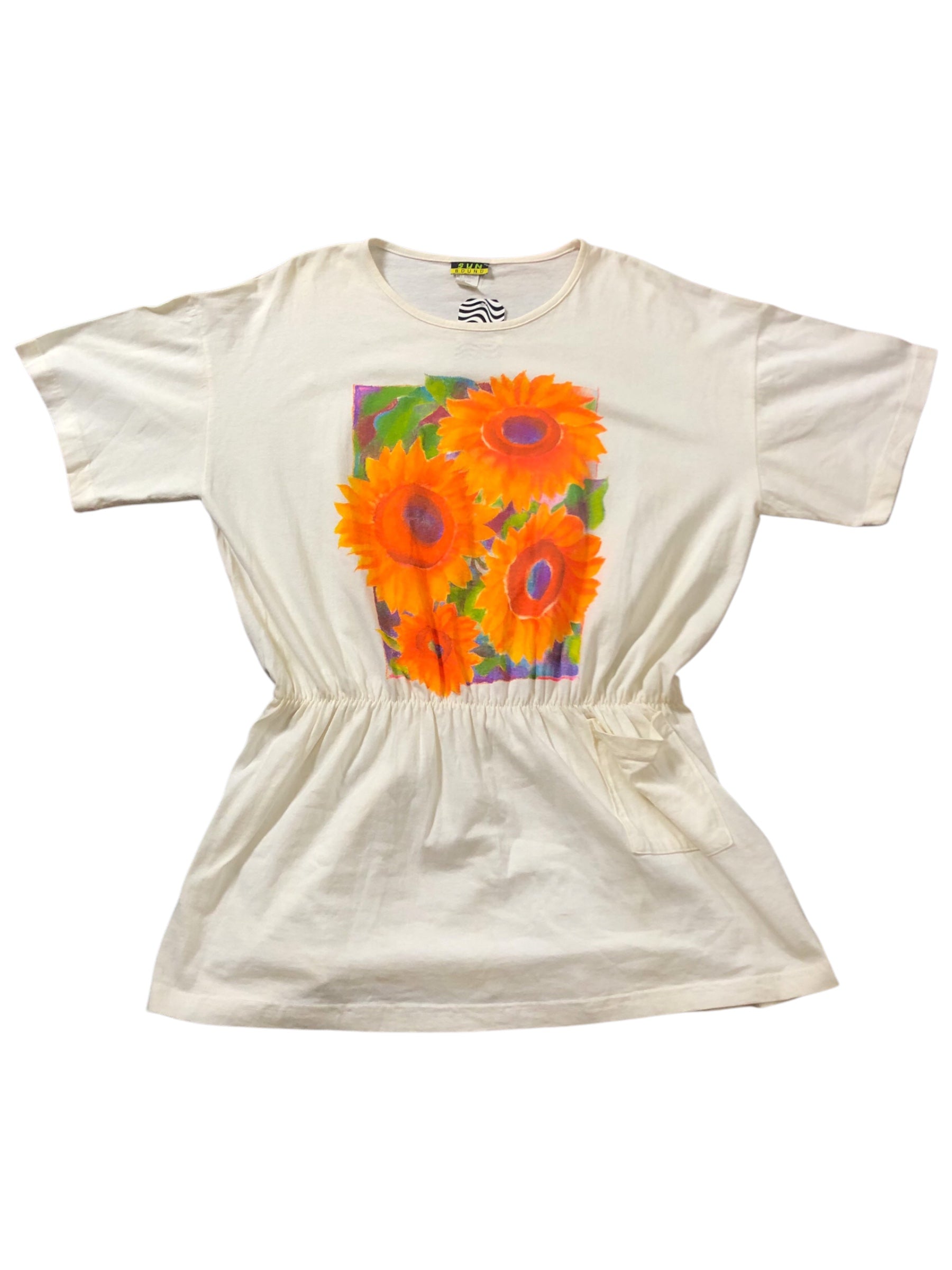 perf as a coverup at the pool or beach! pretty watercolor sunflower print on the front, elastic drop waist, front pocket, 100% cotton, made in USA