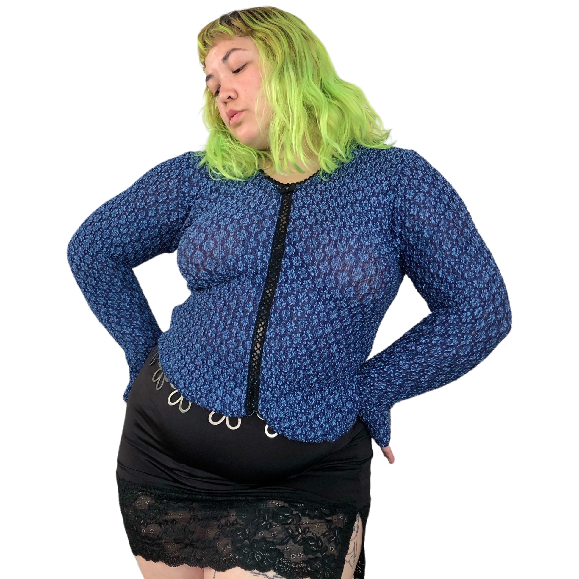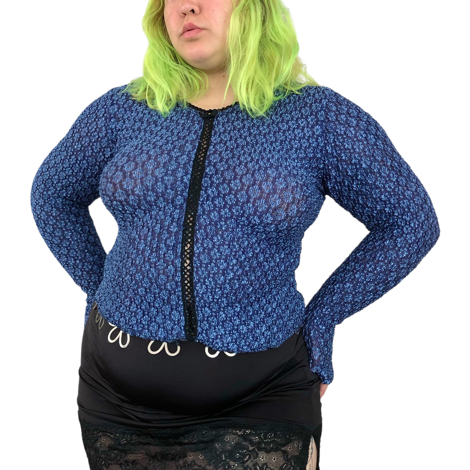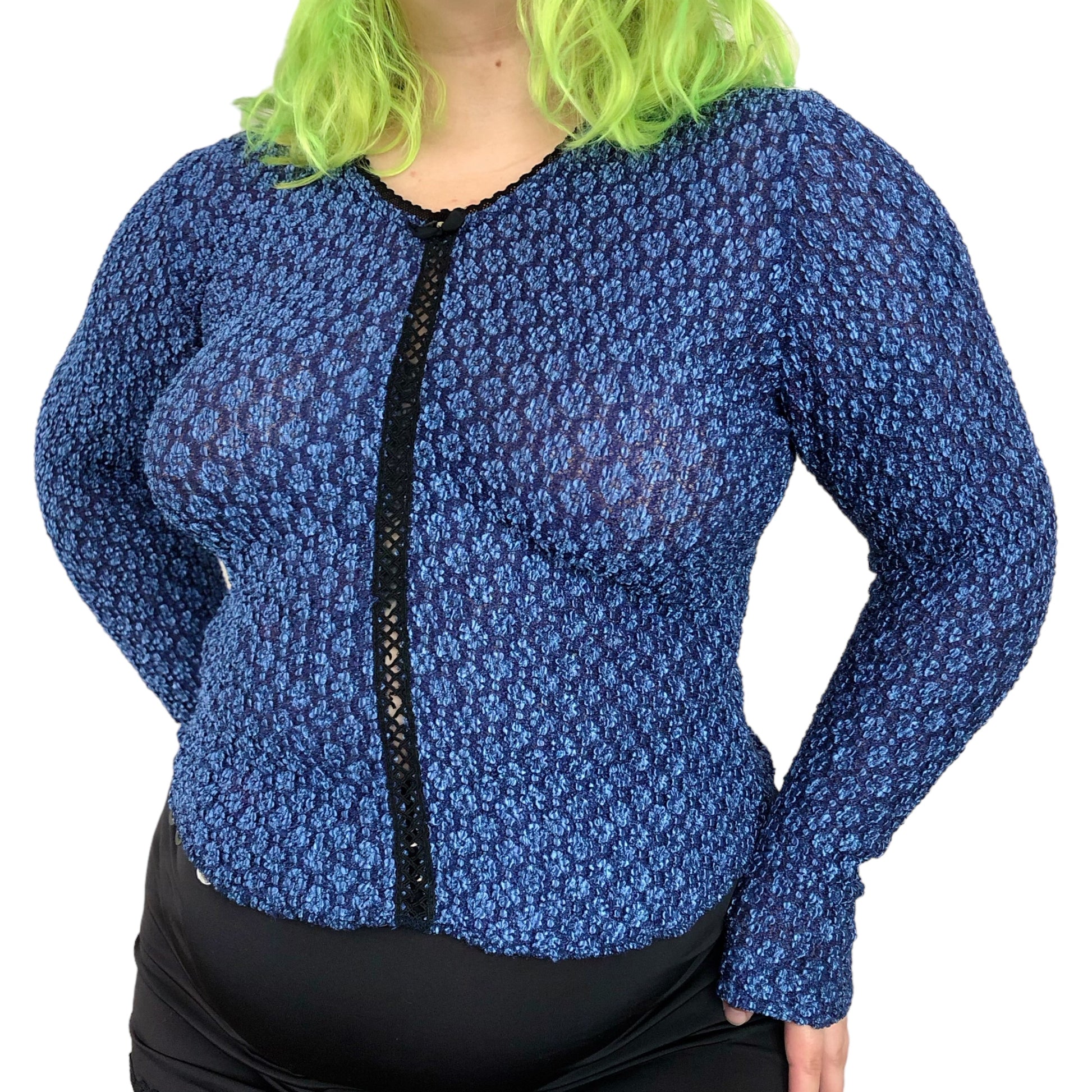 gothic grunge top <3 small velvet bow + rhinestone in the front, criss cross panel down the front, lace trim, super stretchy (63% nylon 22% rayon 15% spandex), made in USA