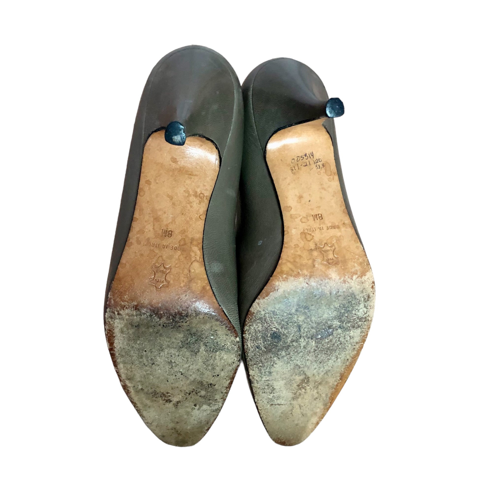 very minimal wear, staple heel for any business or casual fit! seems genuine leather, made in Italy