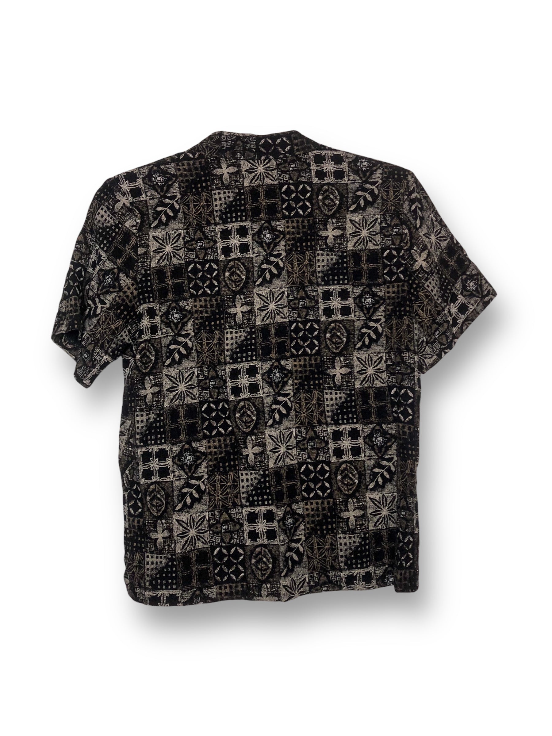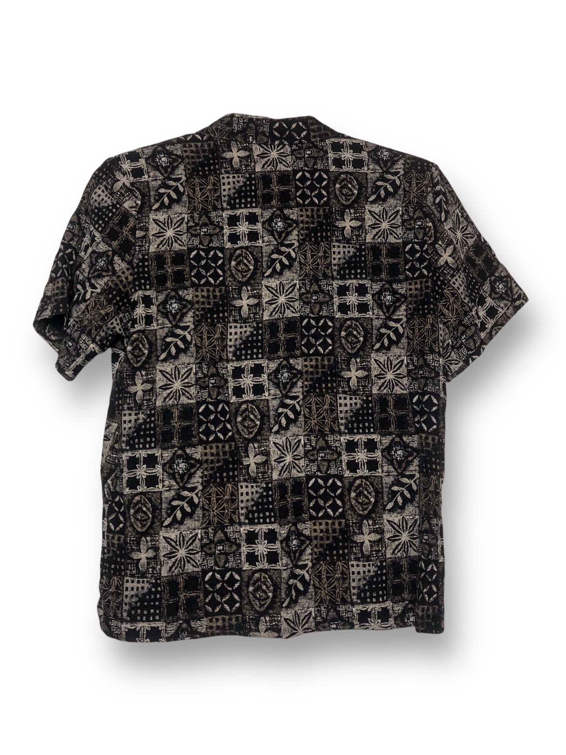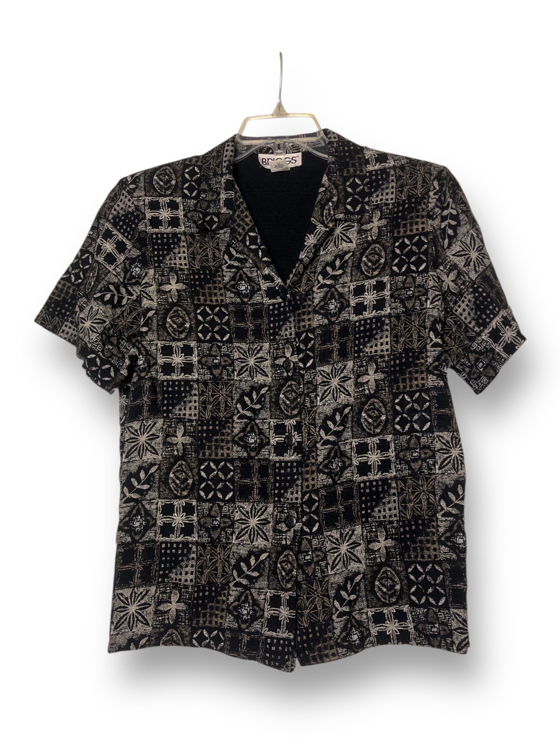 retro floral + geometric checkerboard pattern throughout, buttons down the front, shoulder pads, no stretch (64% rayon 46% acetate), made in USA