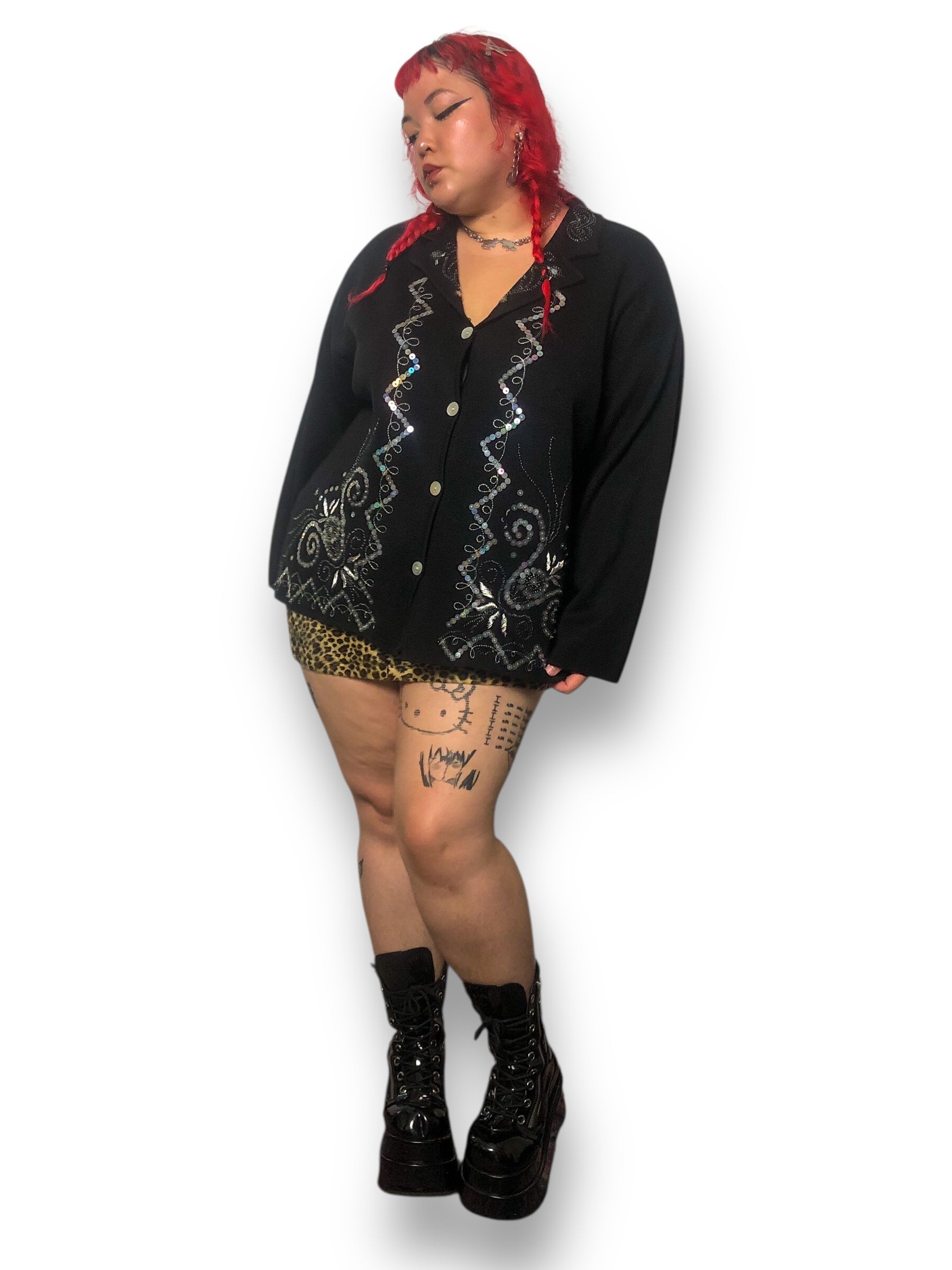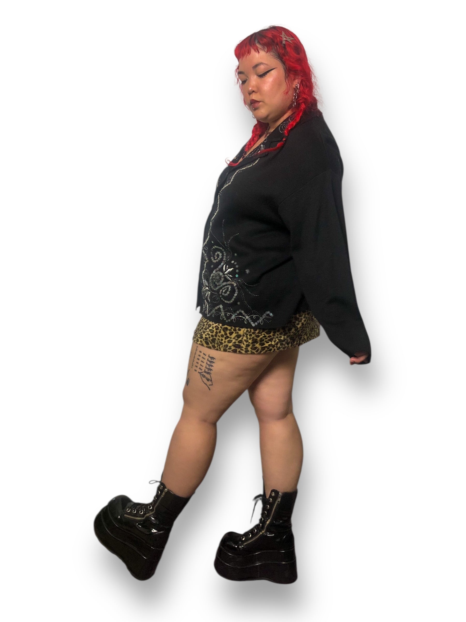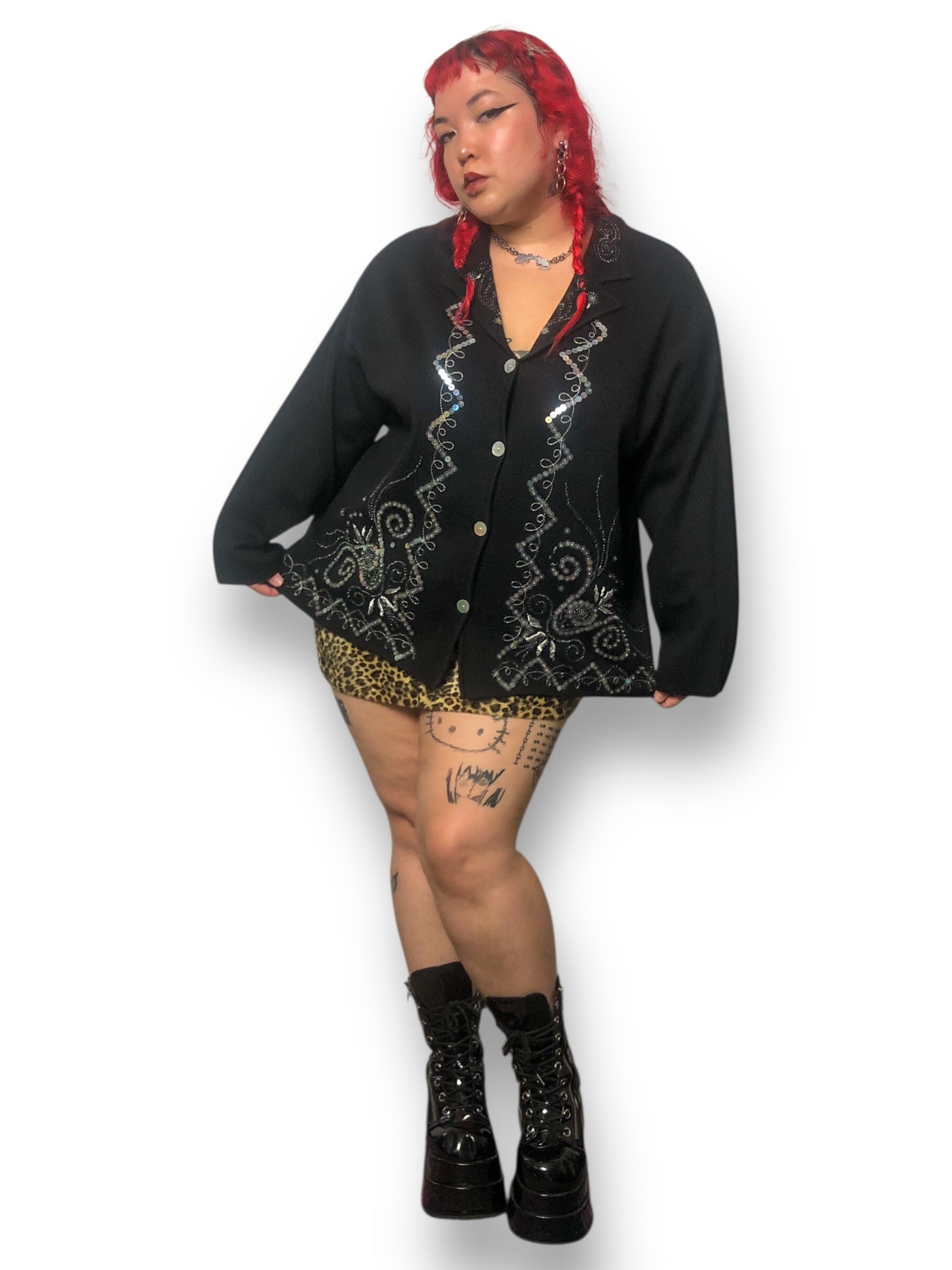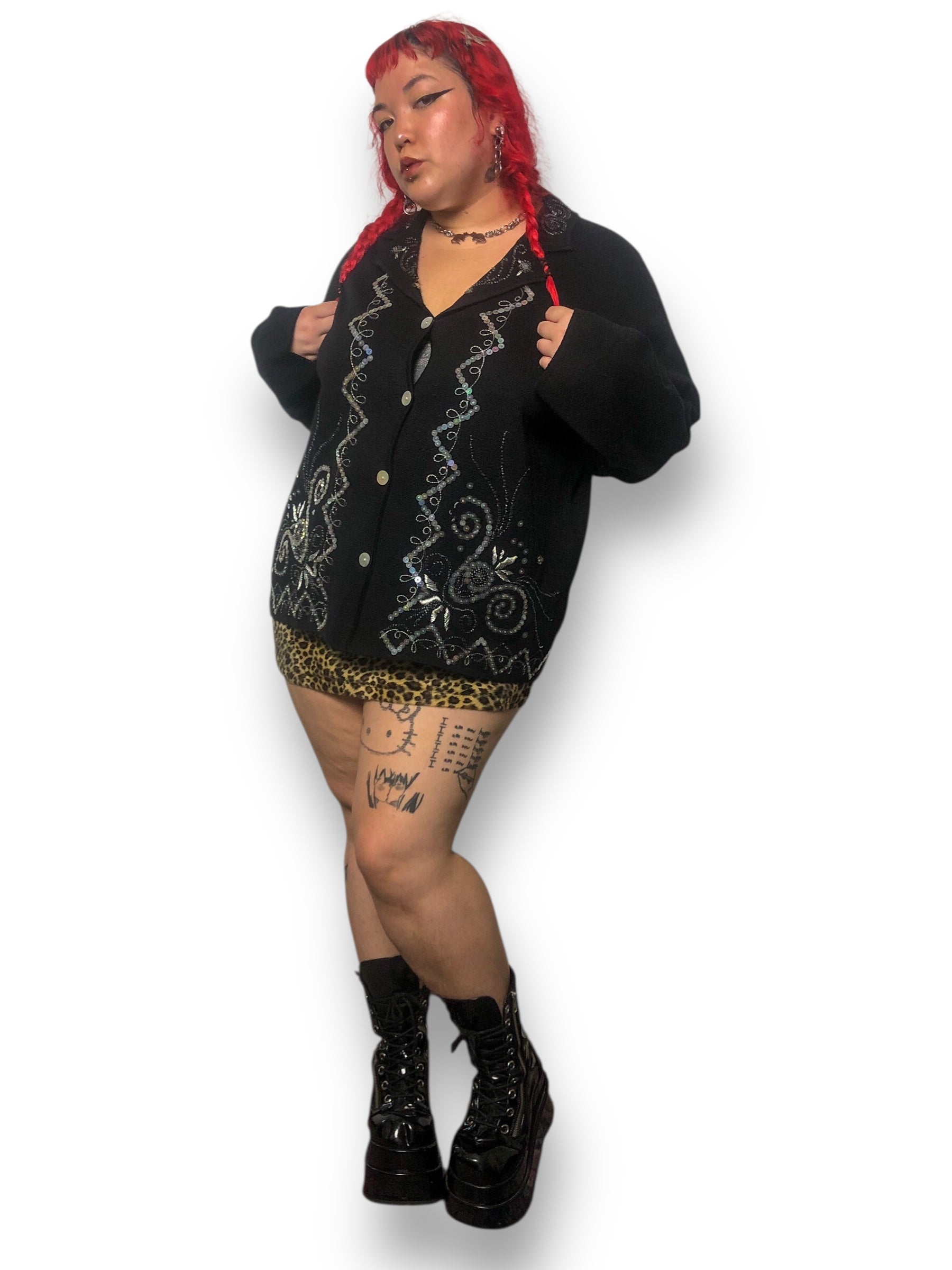 perfect whimsy goth piece <3 iridescent buttons down the front, gorgeous sequin, beaded, + embroidery detailing throughout the front and collar! has some stretch (70% acrylic 30% wool), made in Hong Kong