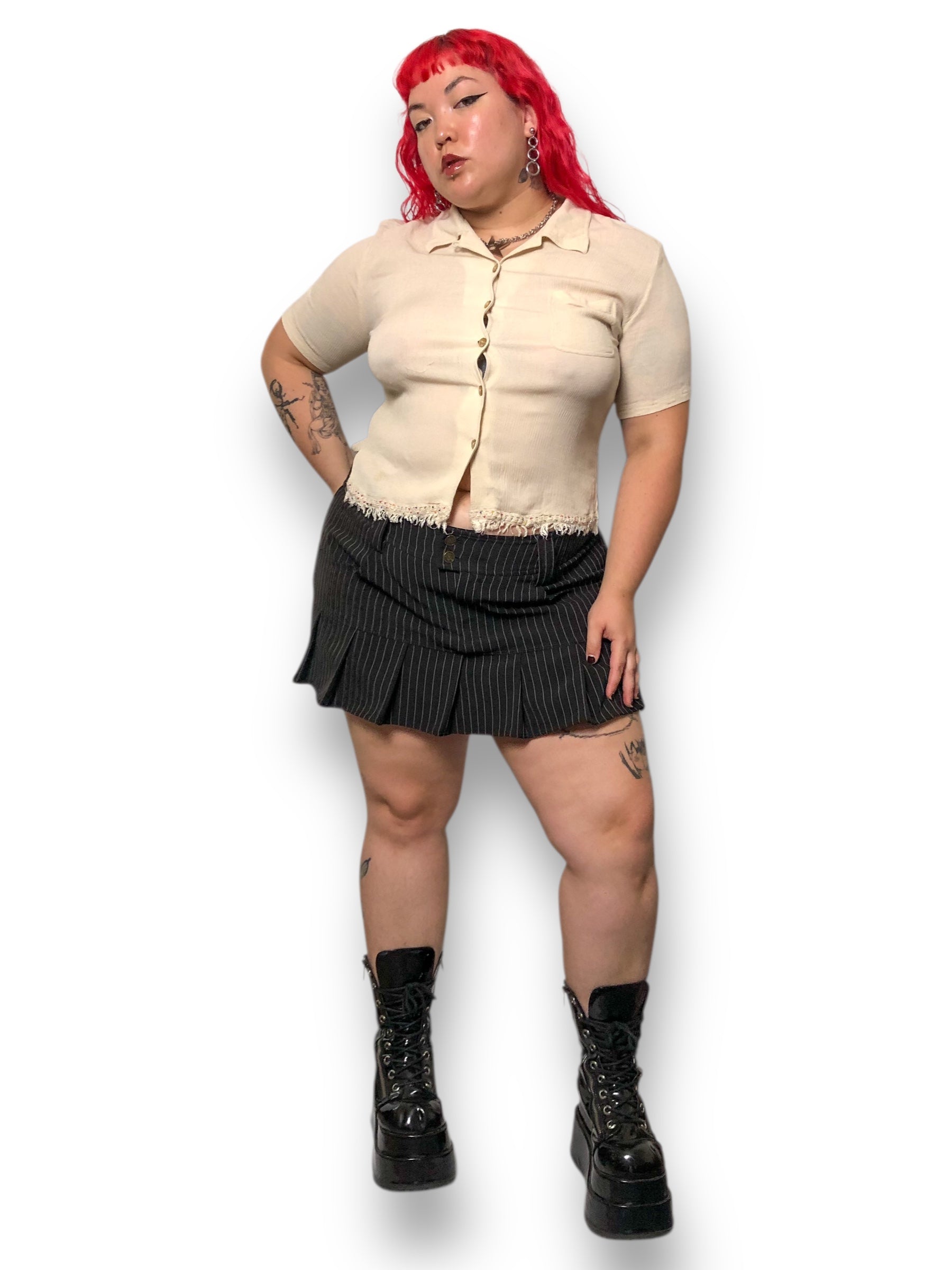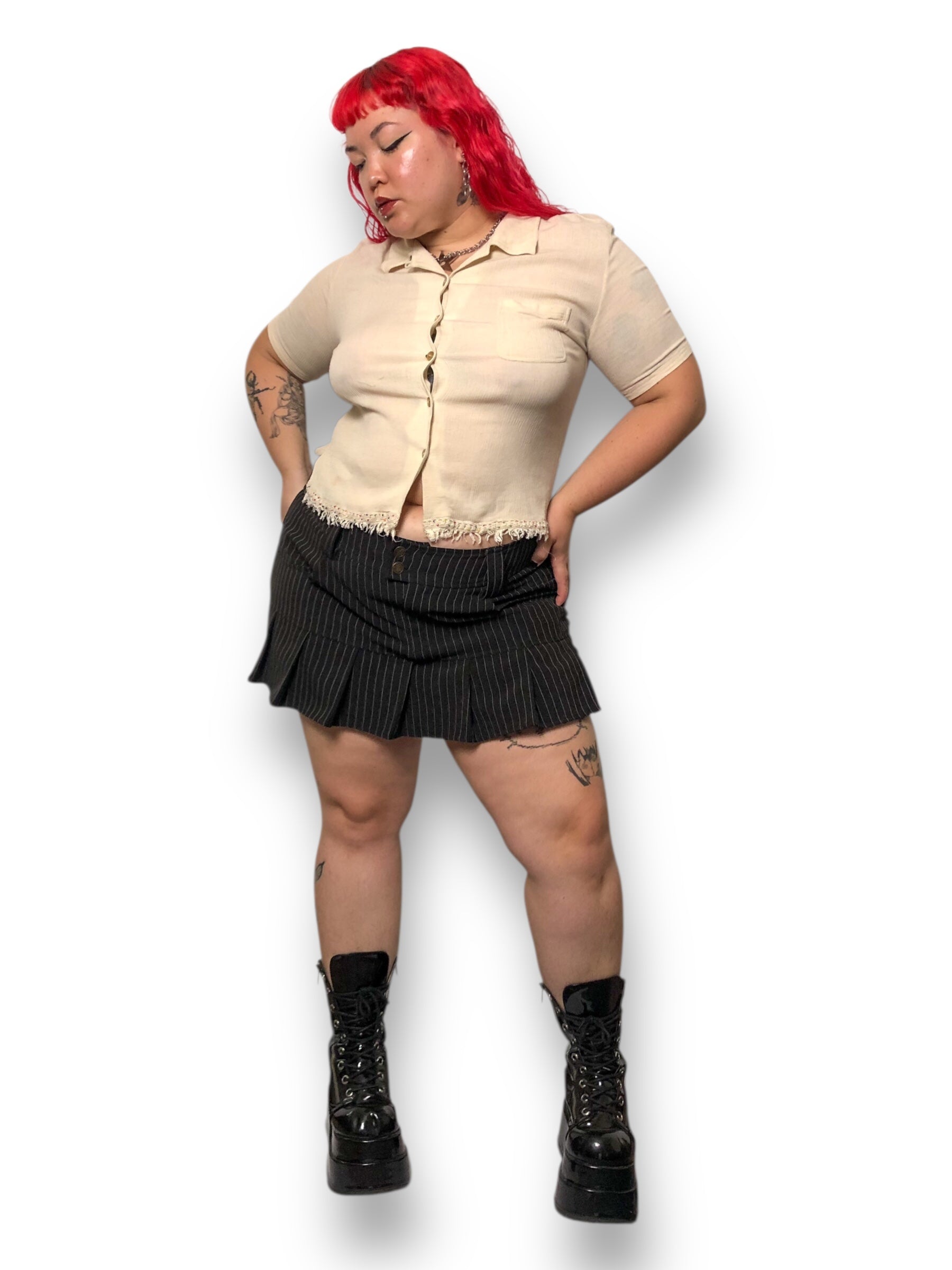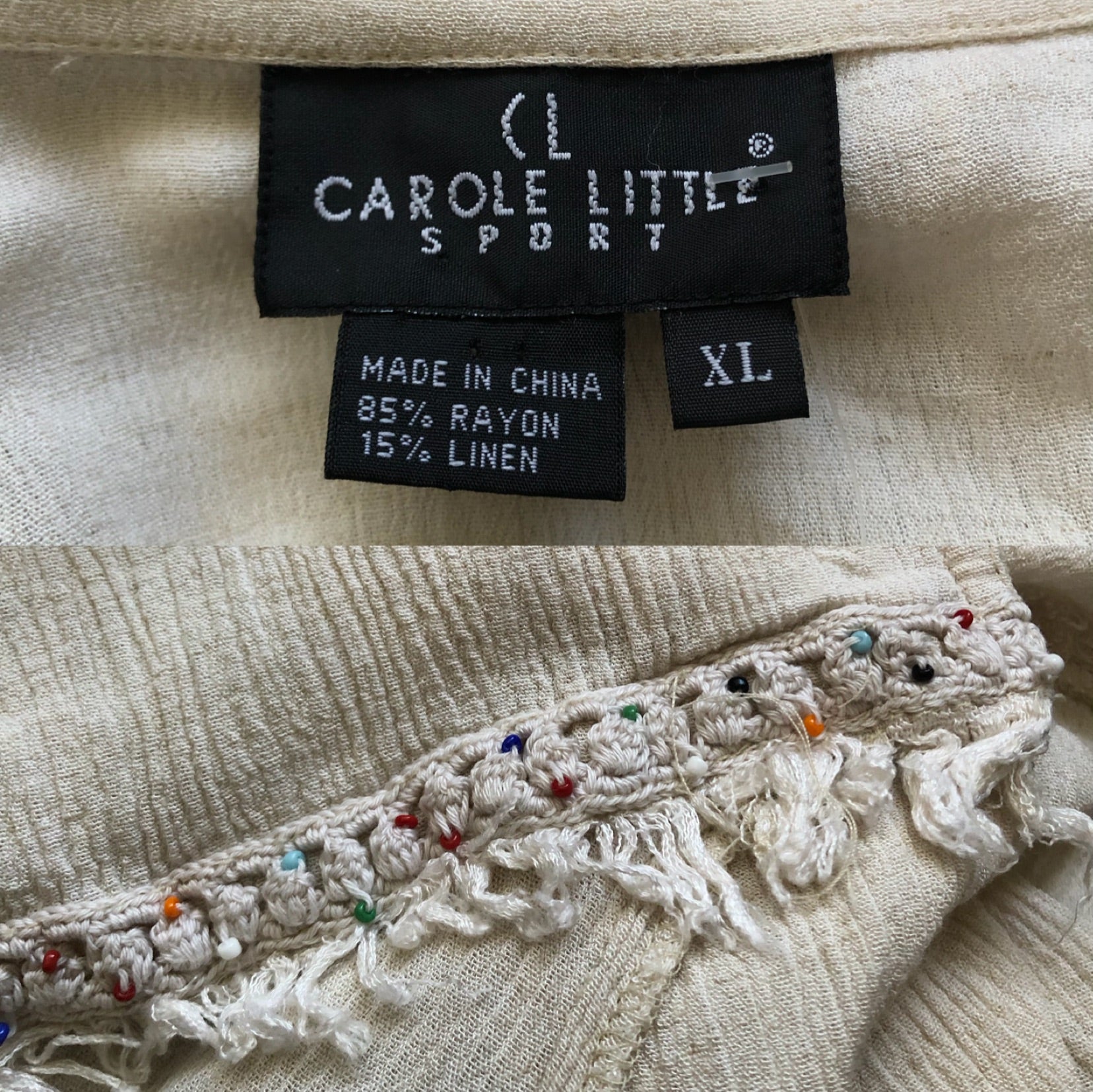 buttons down the front, adorable crochet fringe along the bottom hem w/ colorful beads, shirt pocket, crinkled textured fabric w/ minimal stretch (85% rayon 15% linen)