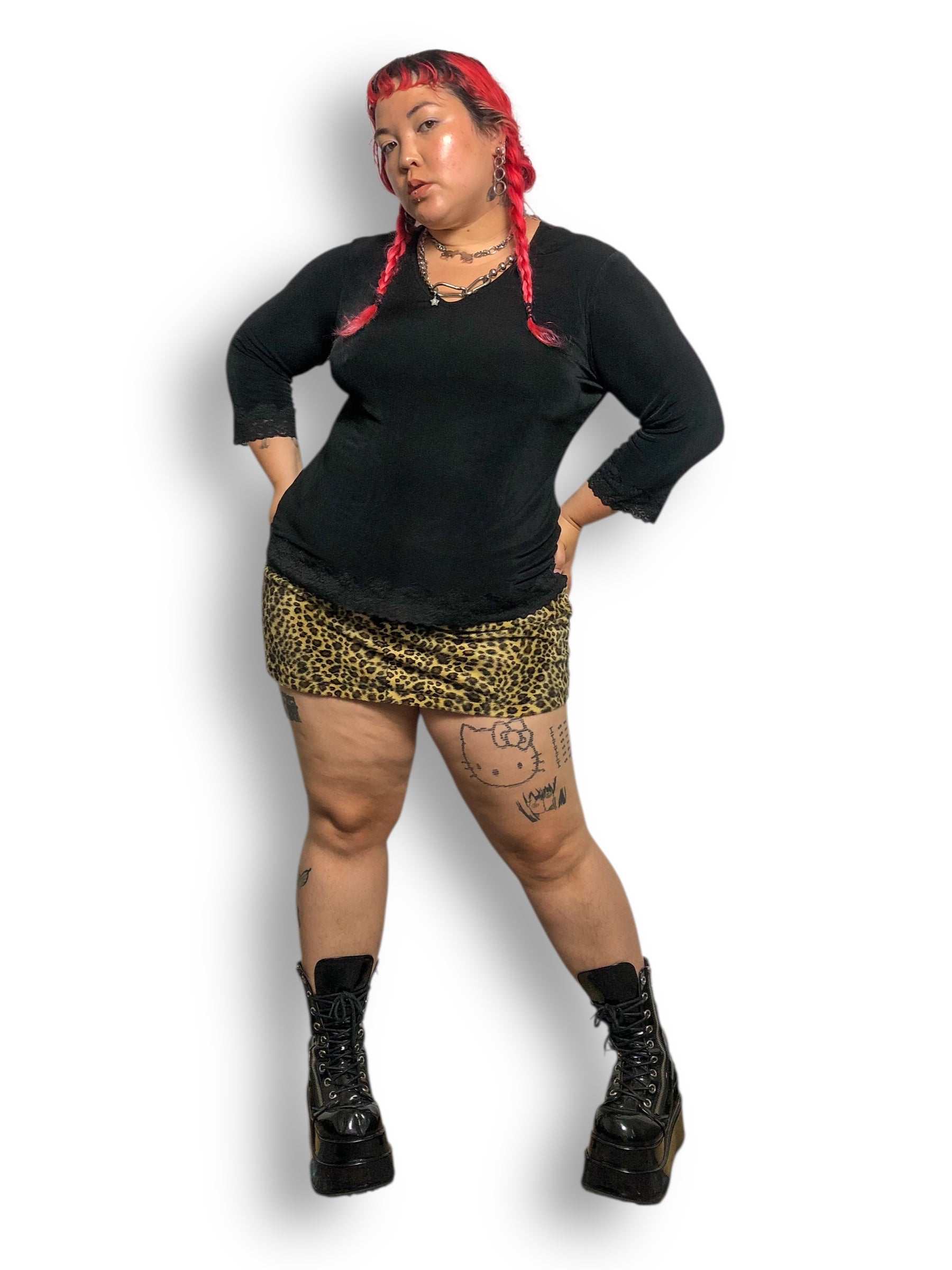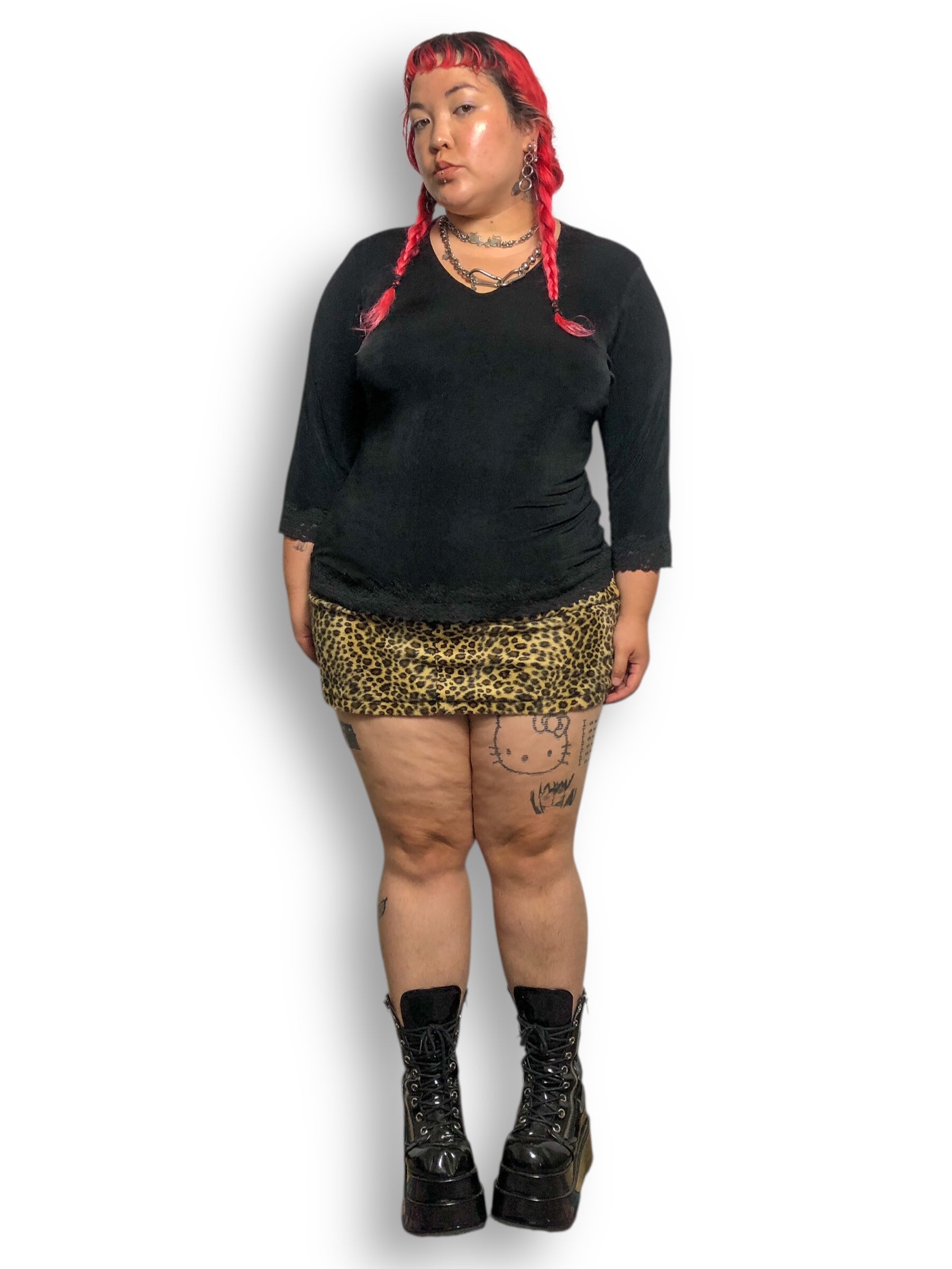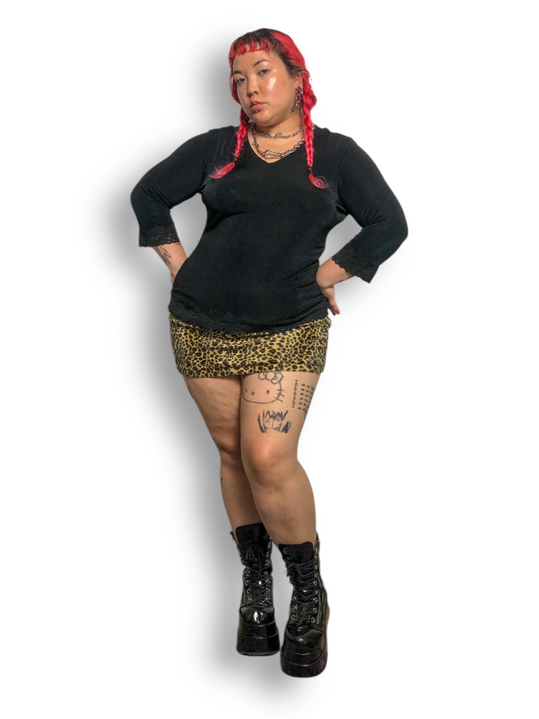 staple romantic goth piece! lace trim along the bottom hem + cuffs, v-neckline, 3/4 sleeves, stretchy (95% acetate 5% spandex), made in USA