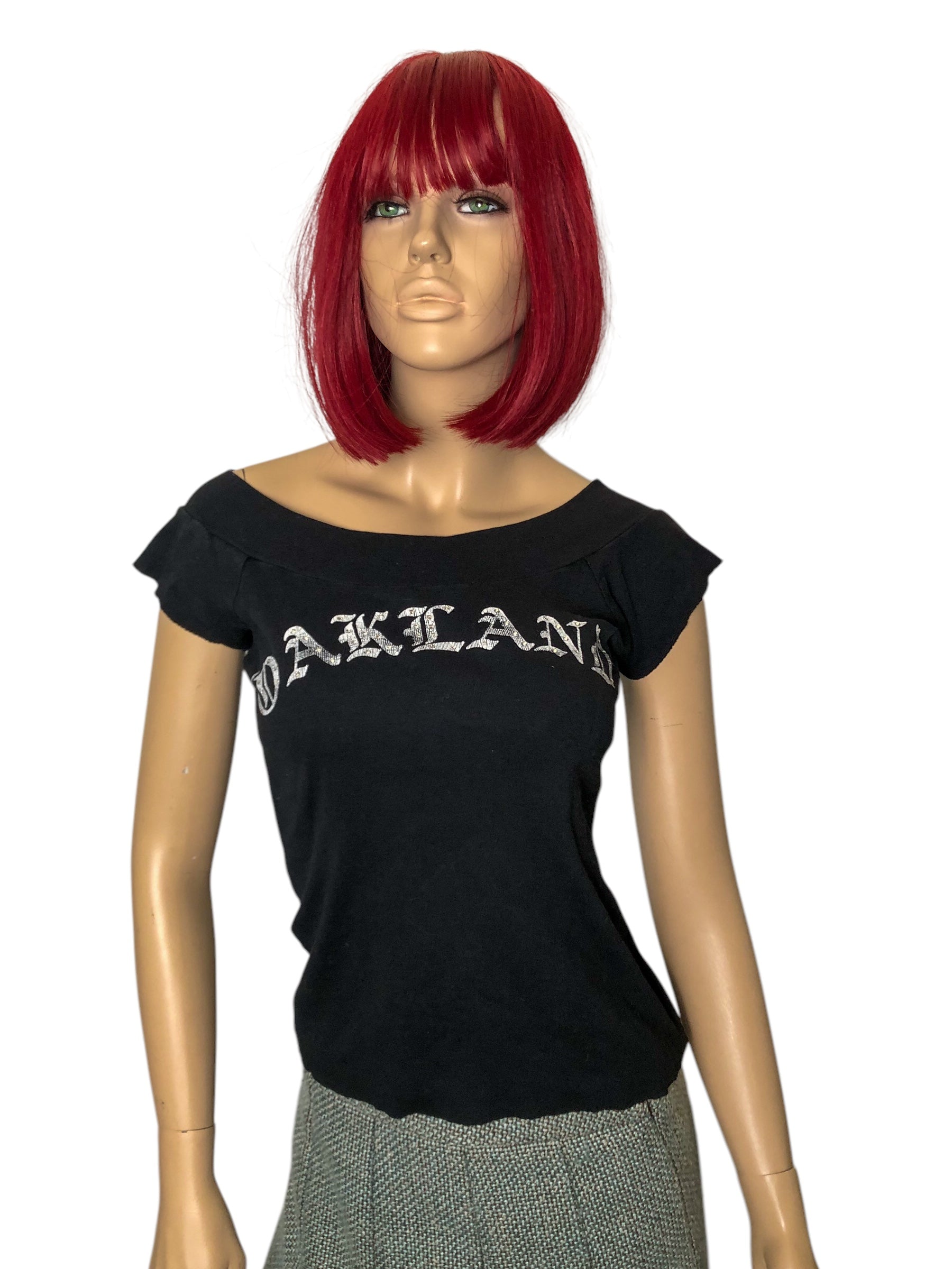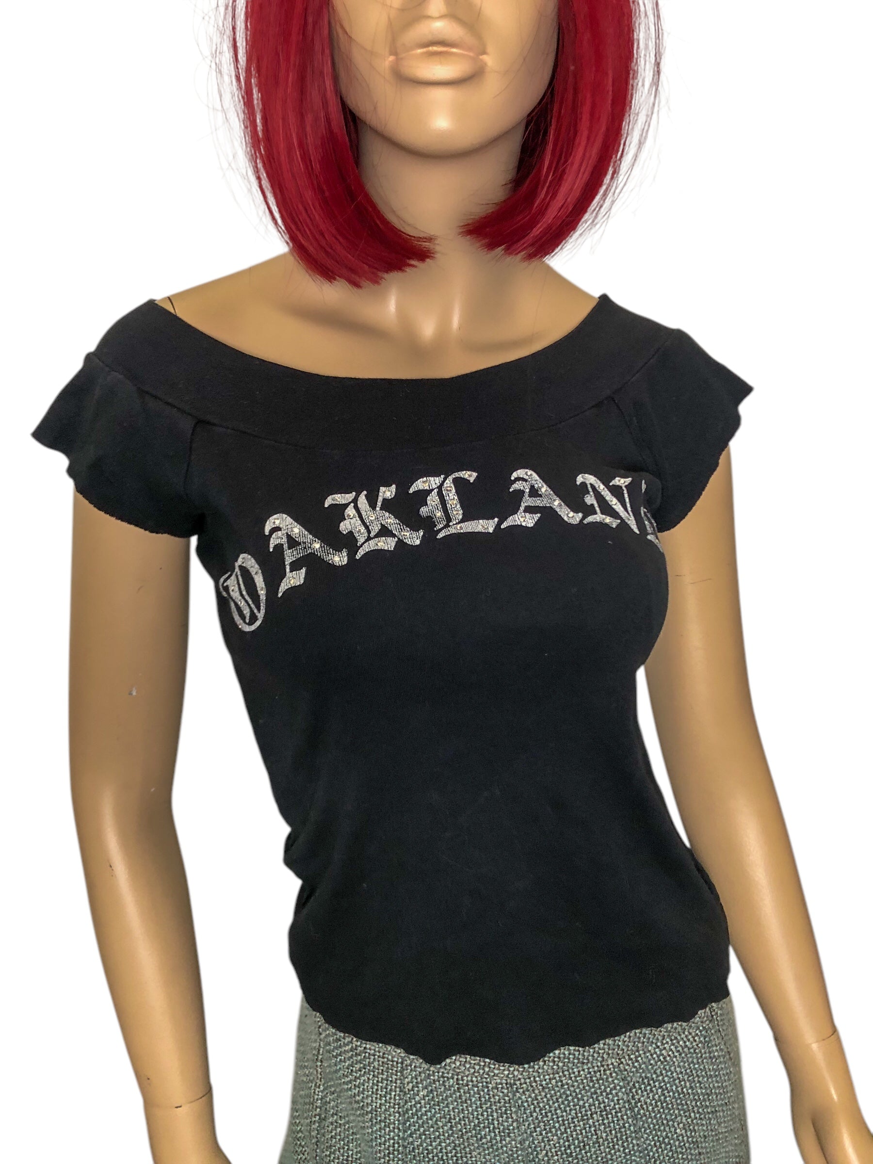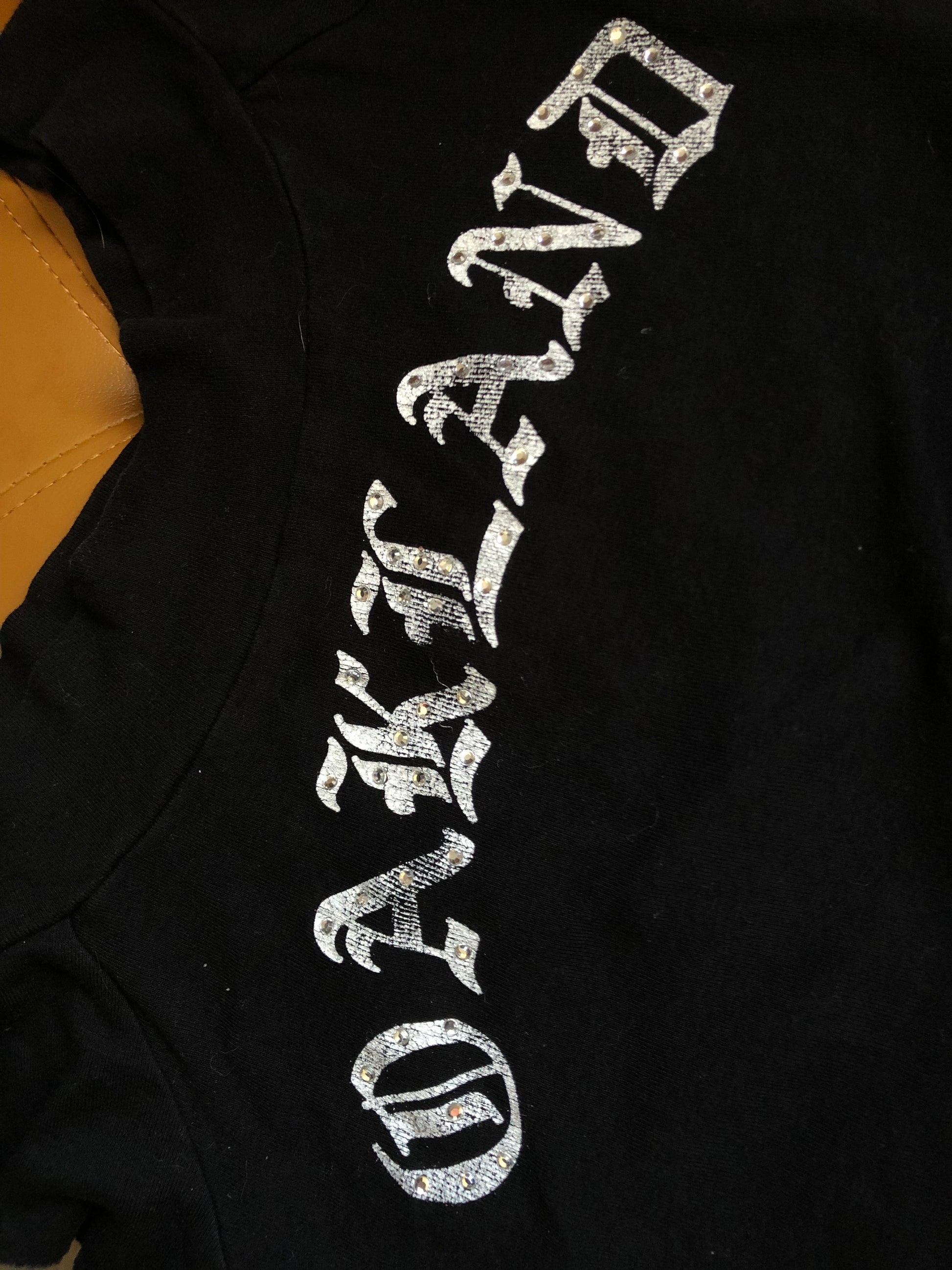 slightly cracked white print ‘OAKLAND’ w/ rhinestones, scoop neckline, stretchy (feels like cotton), raw hems