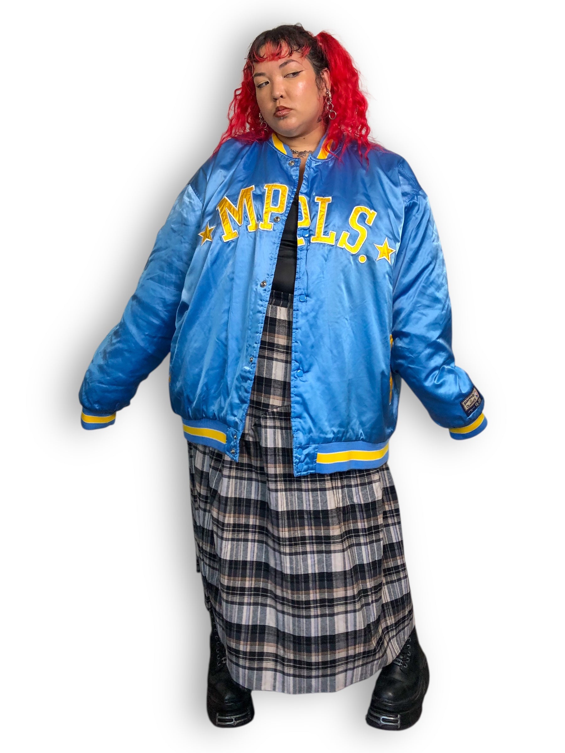 vintage statement piece! ‘MPLS’ and ‘LAKERS’ yellow embroidery, rib knit collar, cuffs, and waistband, snap buttons down the front, 2 outer + 1 inner pocket, 100% nylon shell & quilted lining, 100% polyester filler, made in Korea