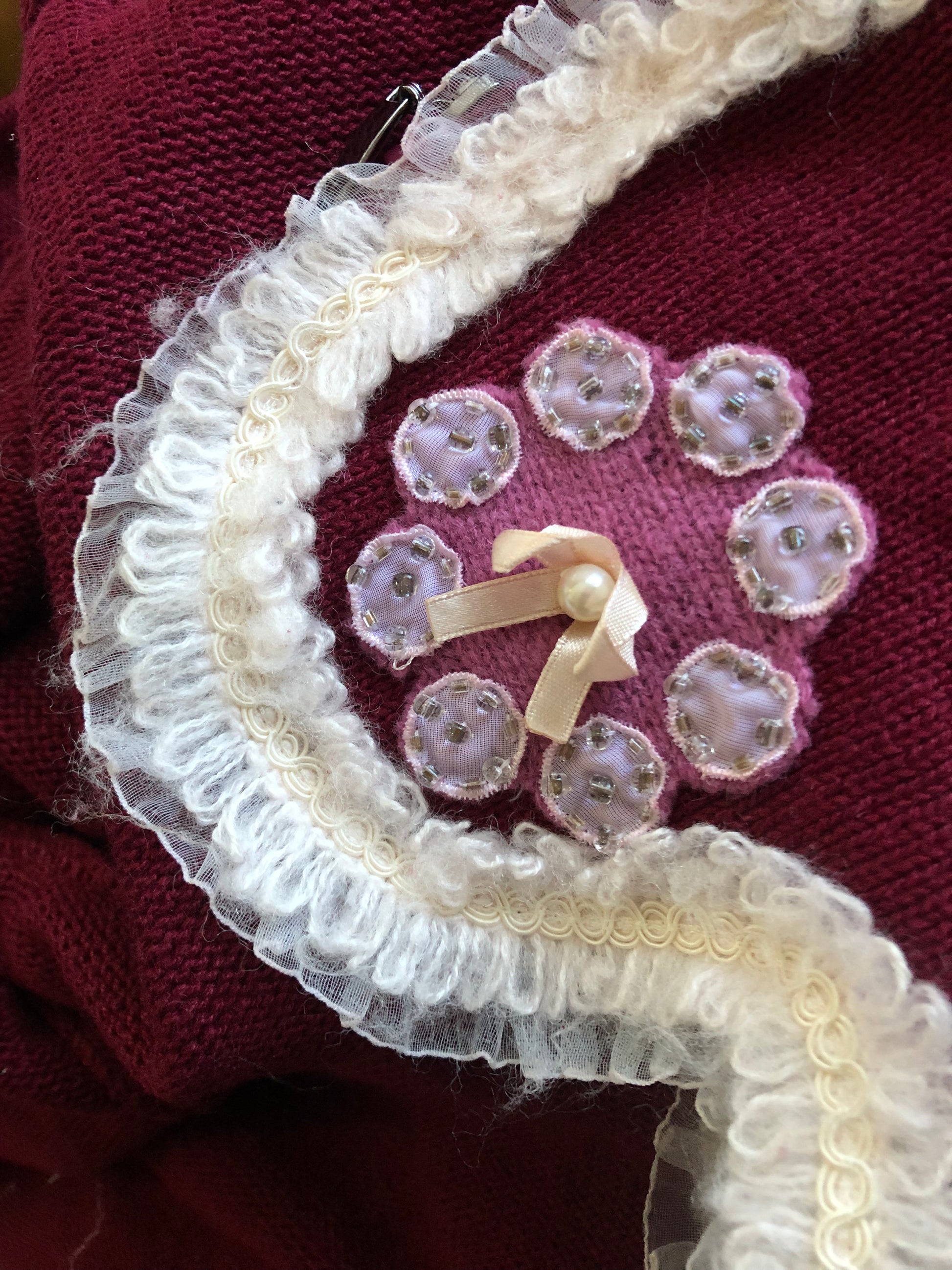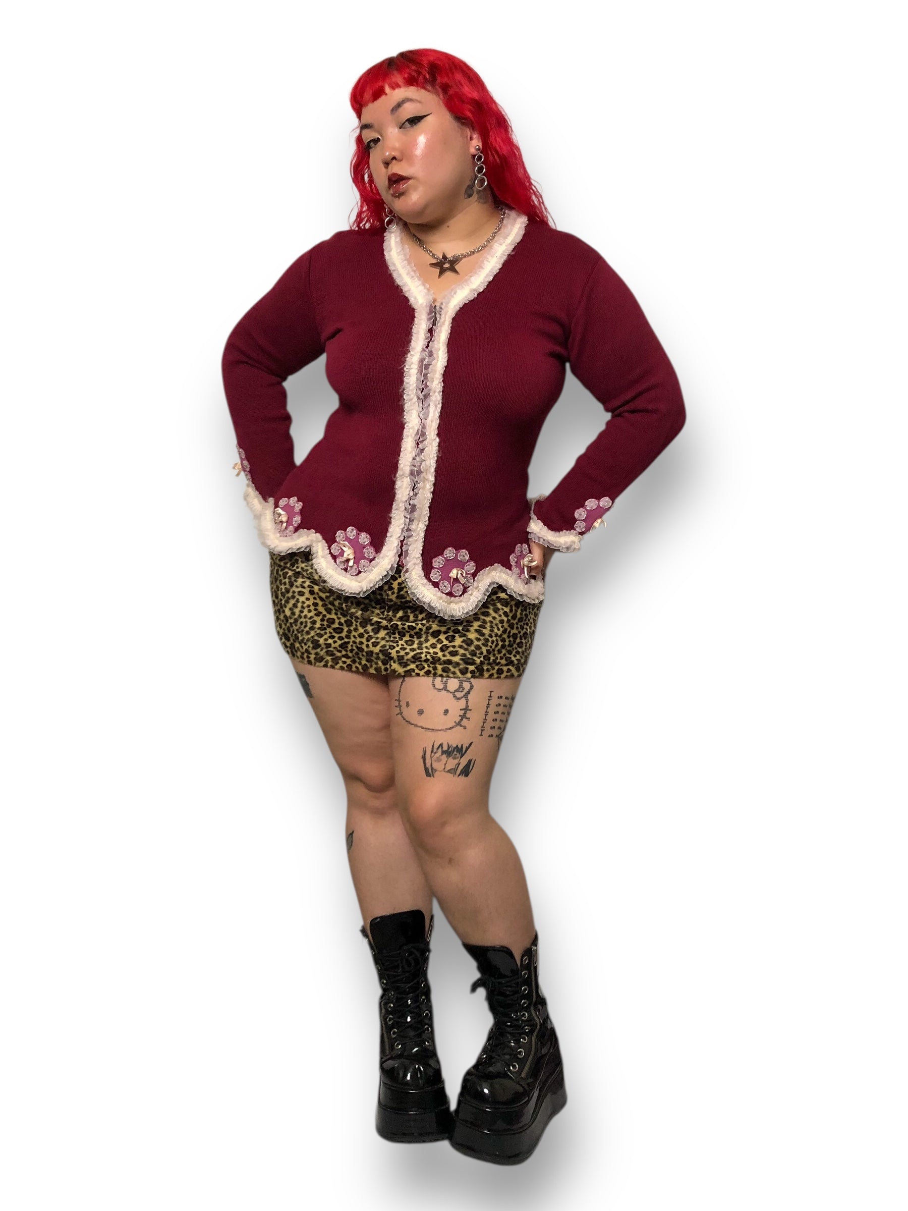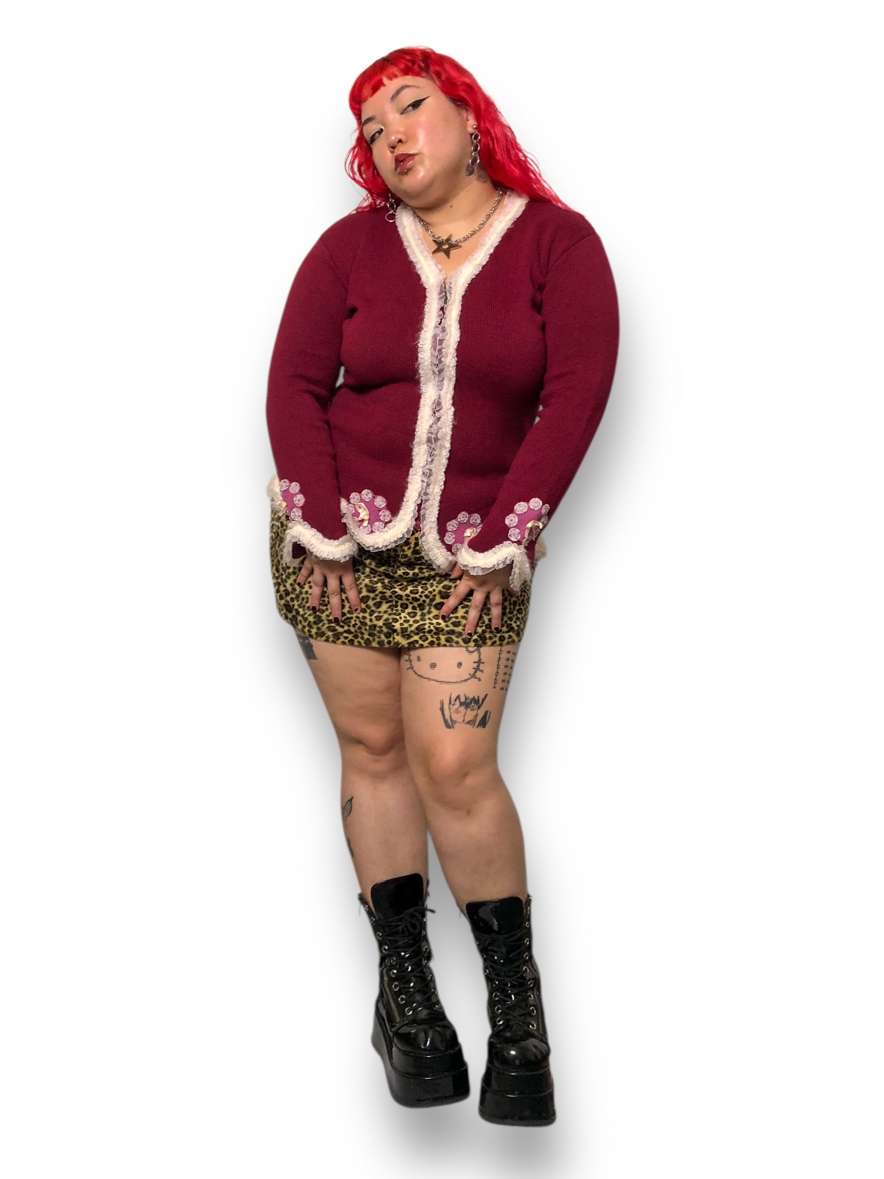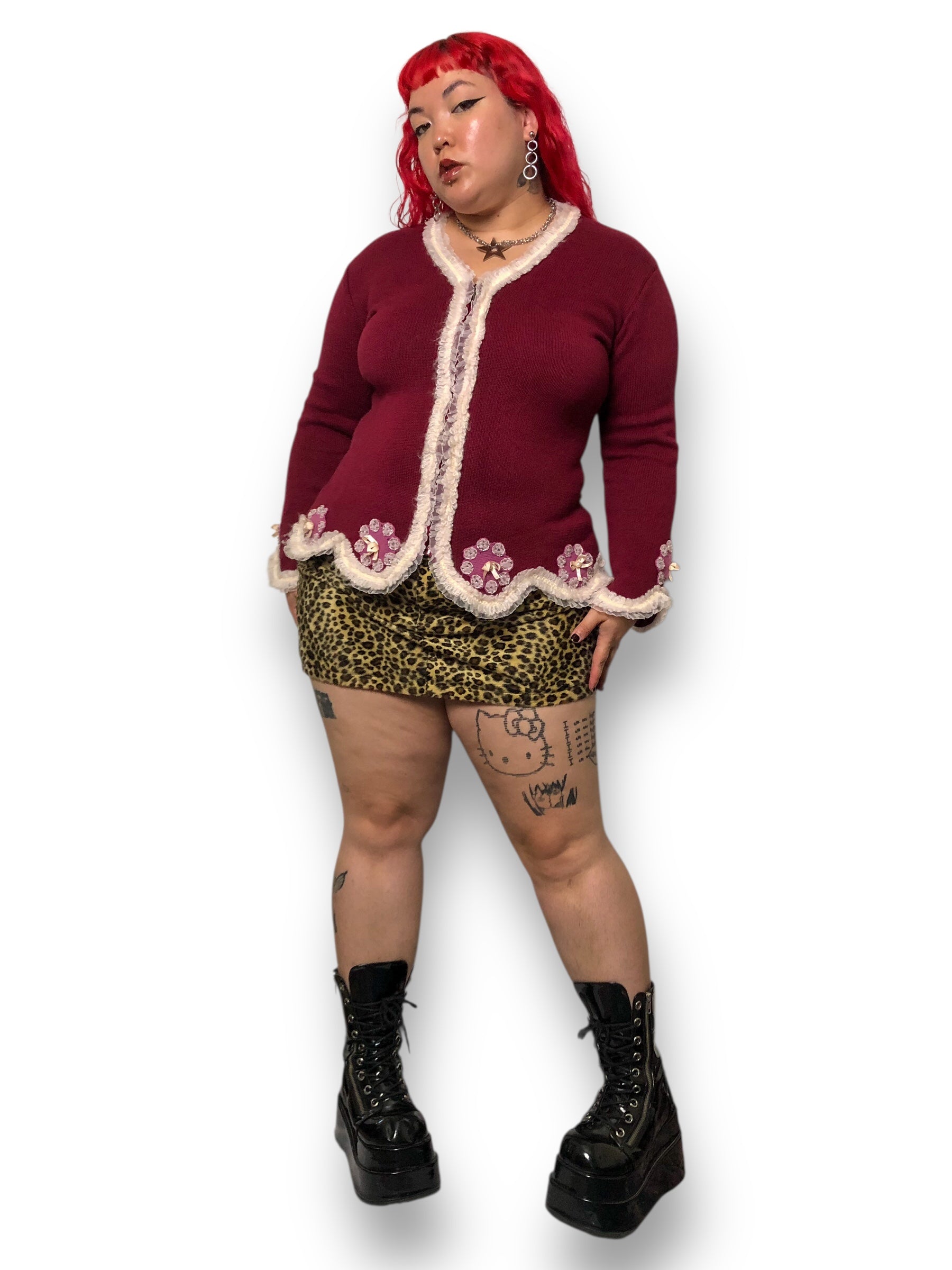 whimsygoth meets coquette <3 adorable white ruffled trim along scalloped hems, pink embellished knit patches along the bottom hem + cuffs, front zipper closure, some stretch (53% ramie 40% cotton 7% acrylic)
