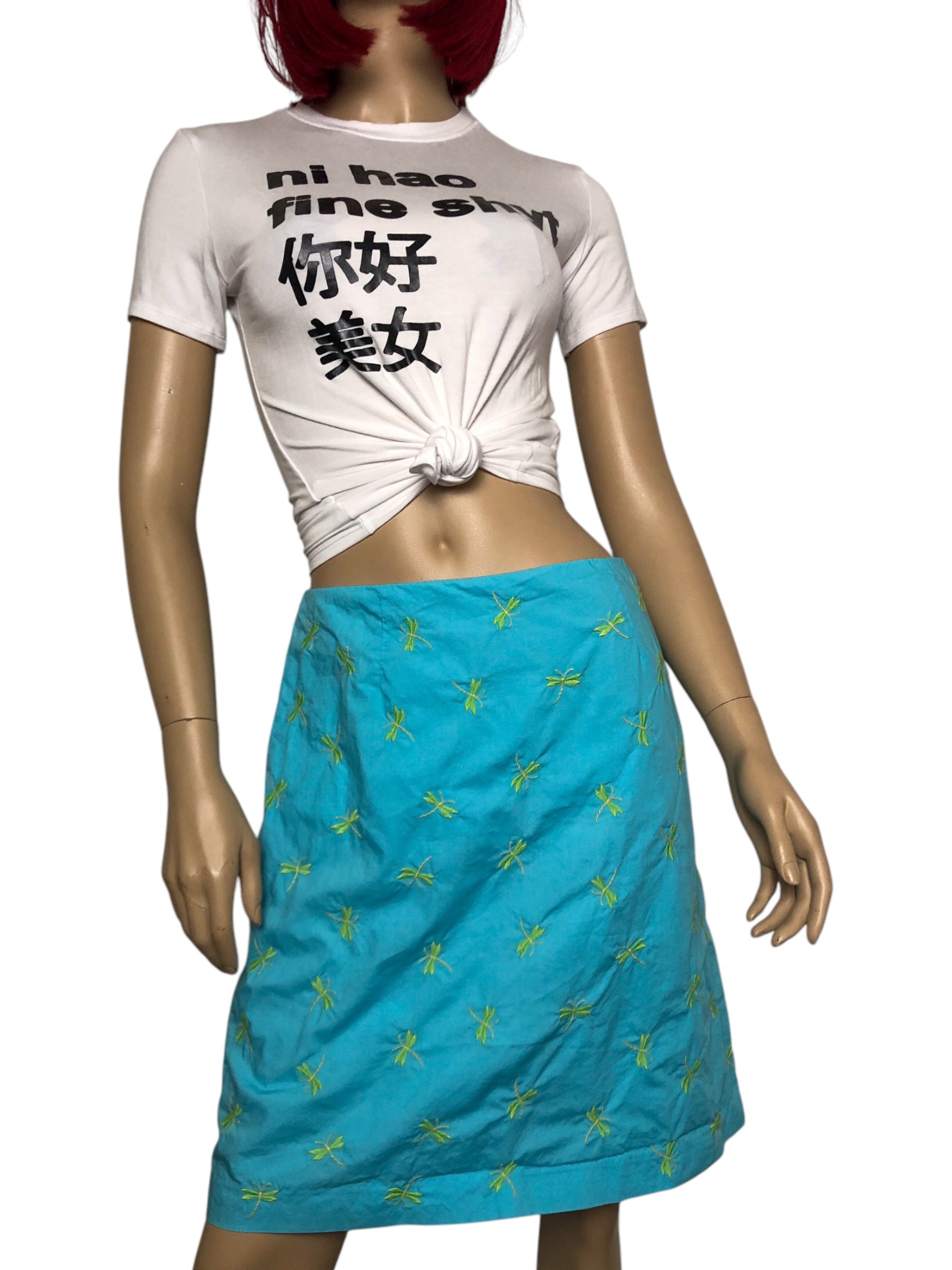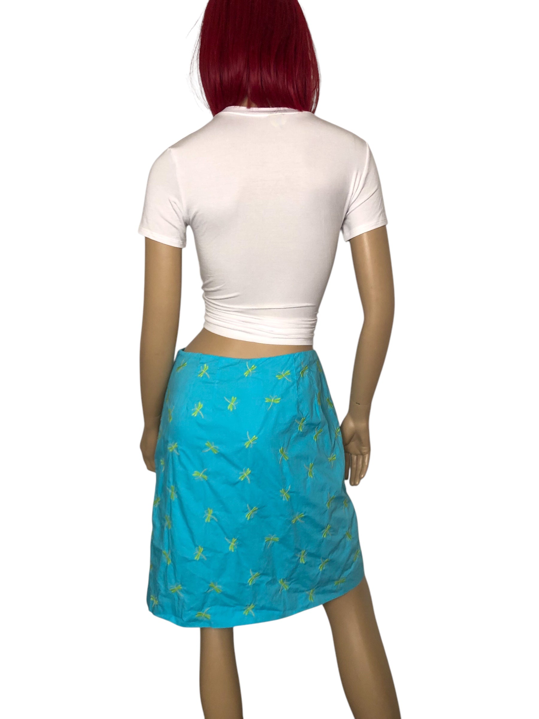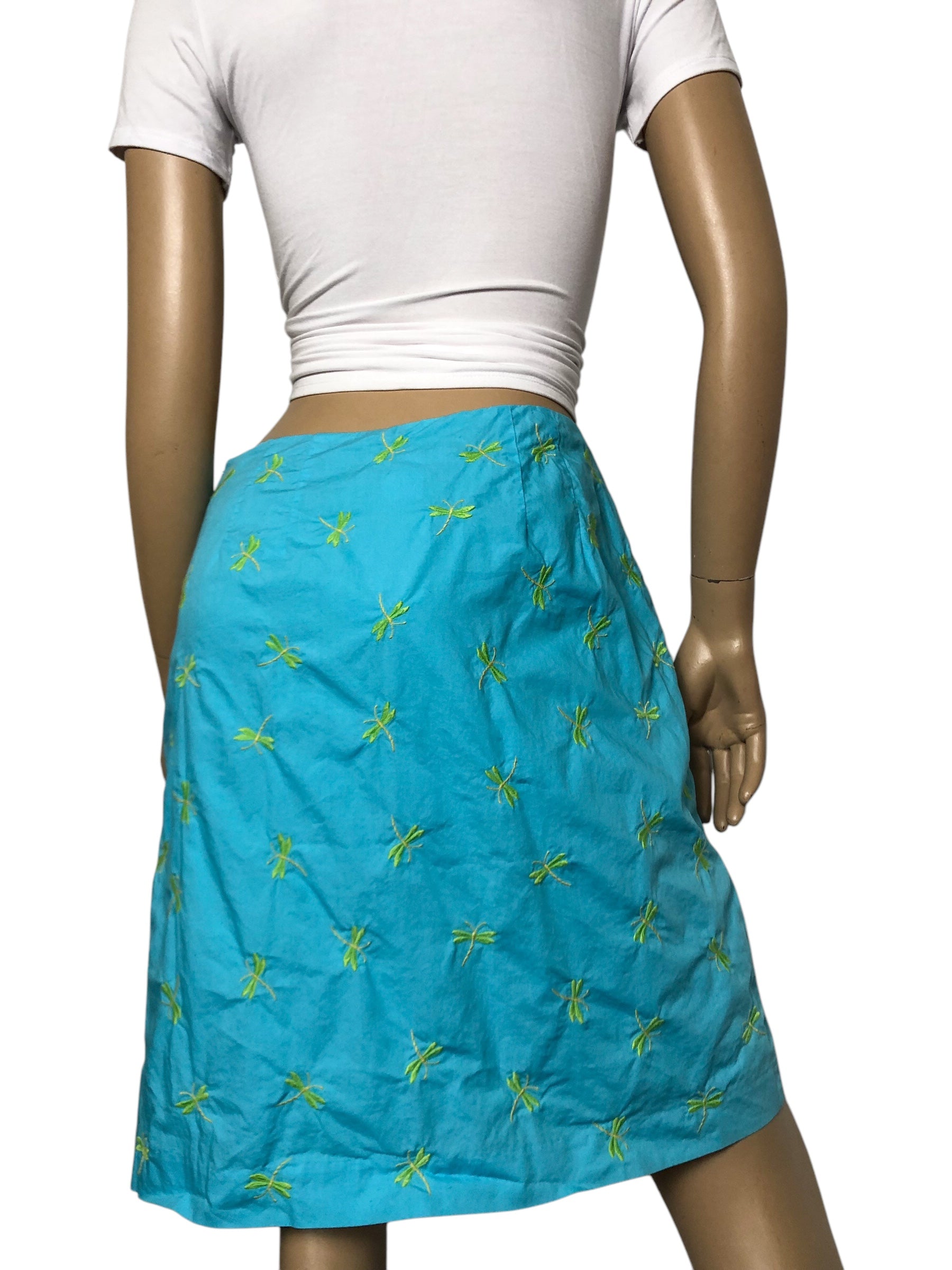 cute green dragonfly embroidery throughout! side button + zipper closure, no stretch - 100% cotton lining & shell