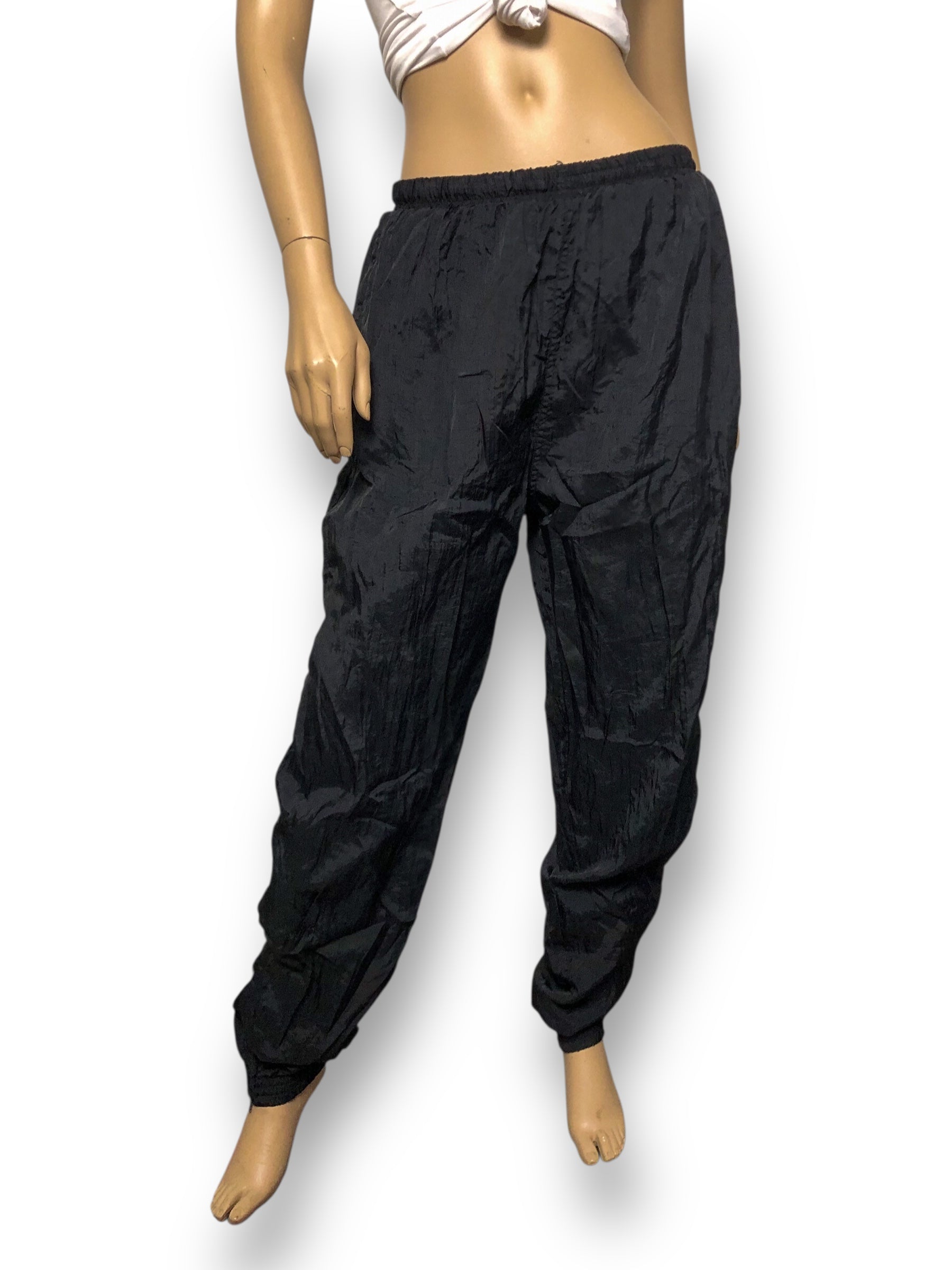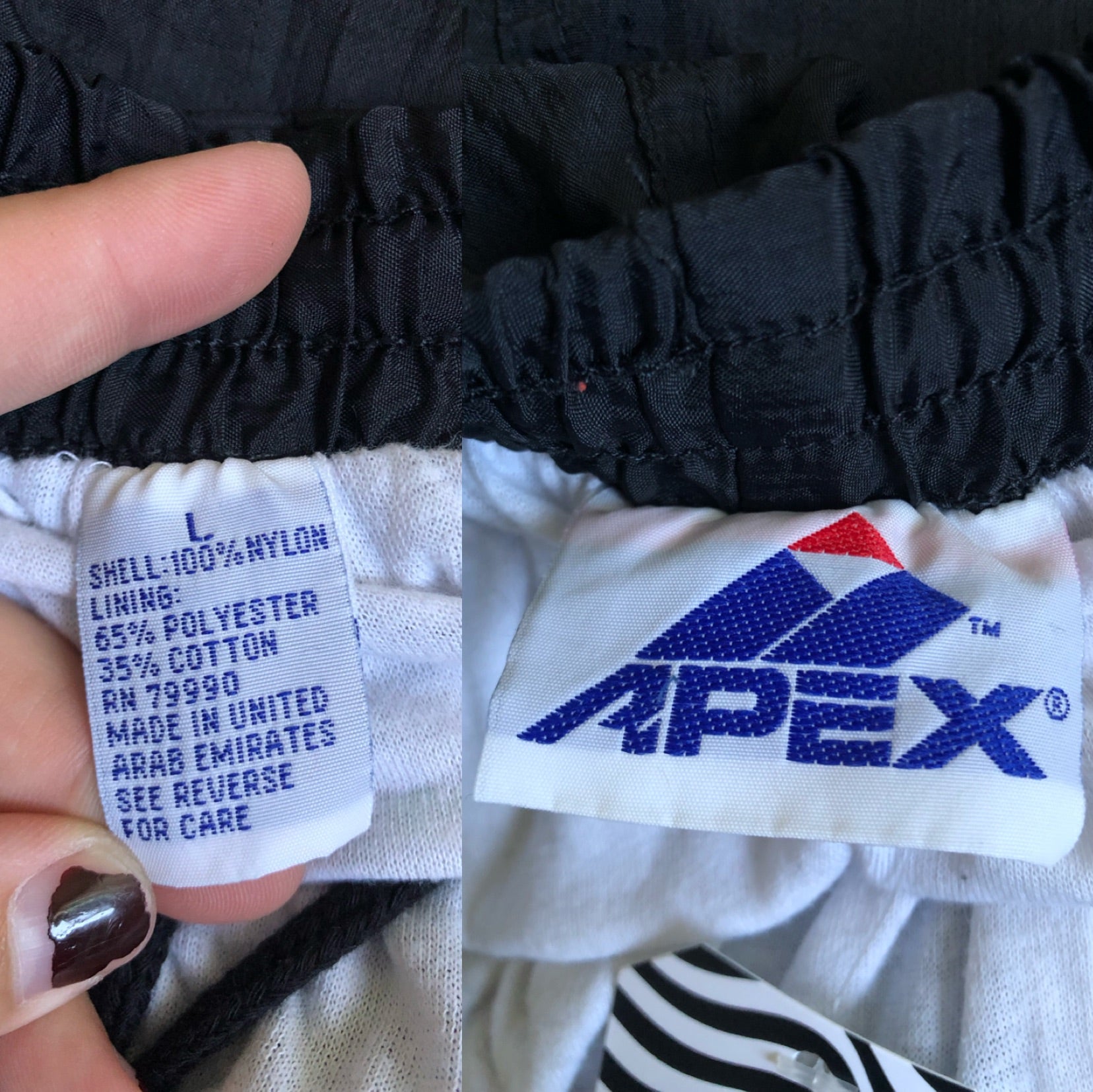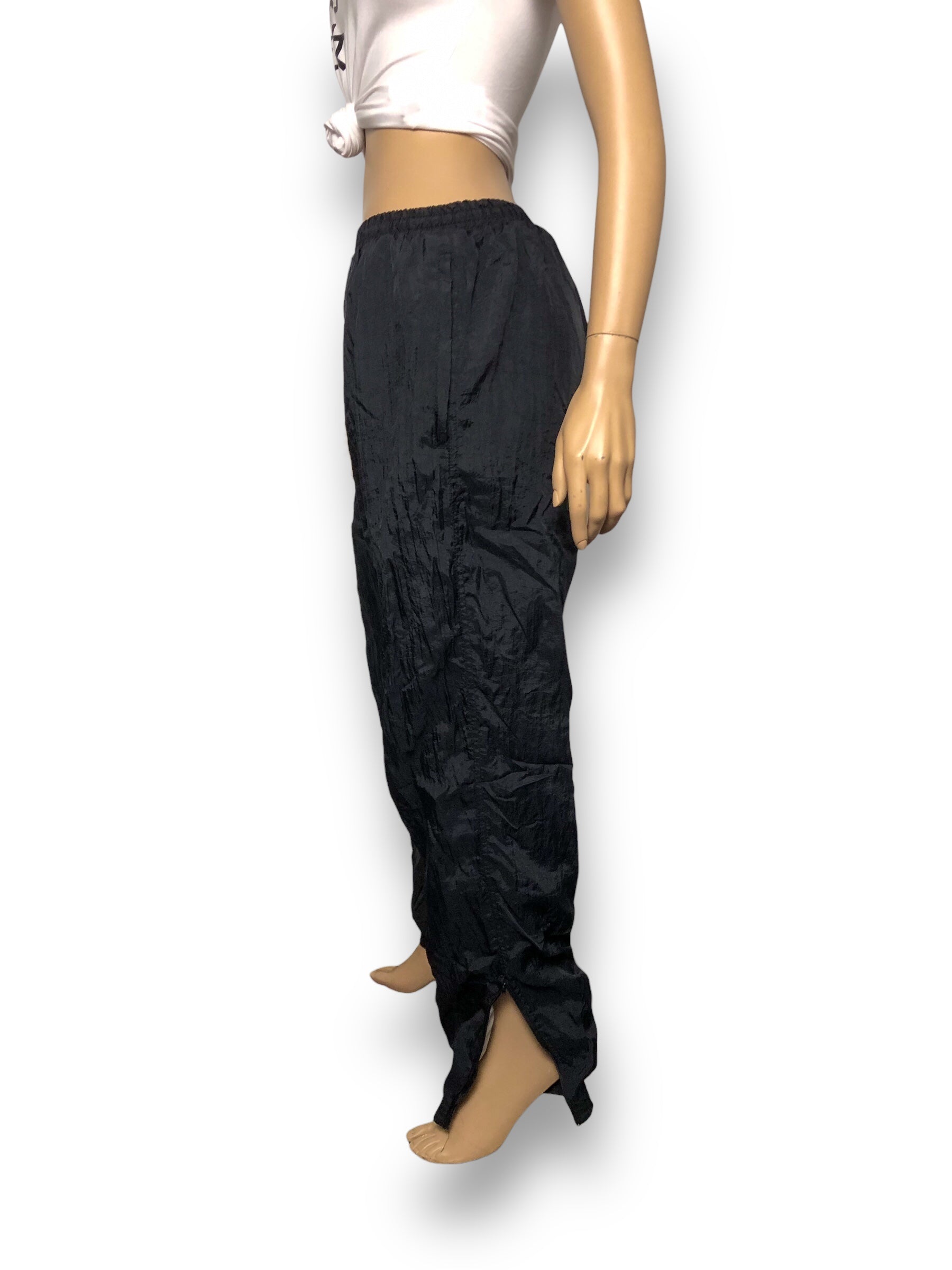stretchy elastic waistband + pant hems, side zippered pockets, inner waist drawstring, zippers on the pant legs, lining is 65% polyester 35% cotton, shell is 100% nylon