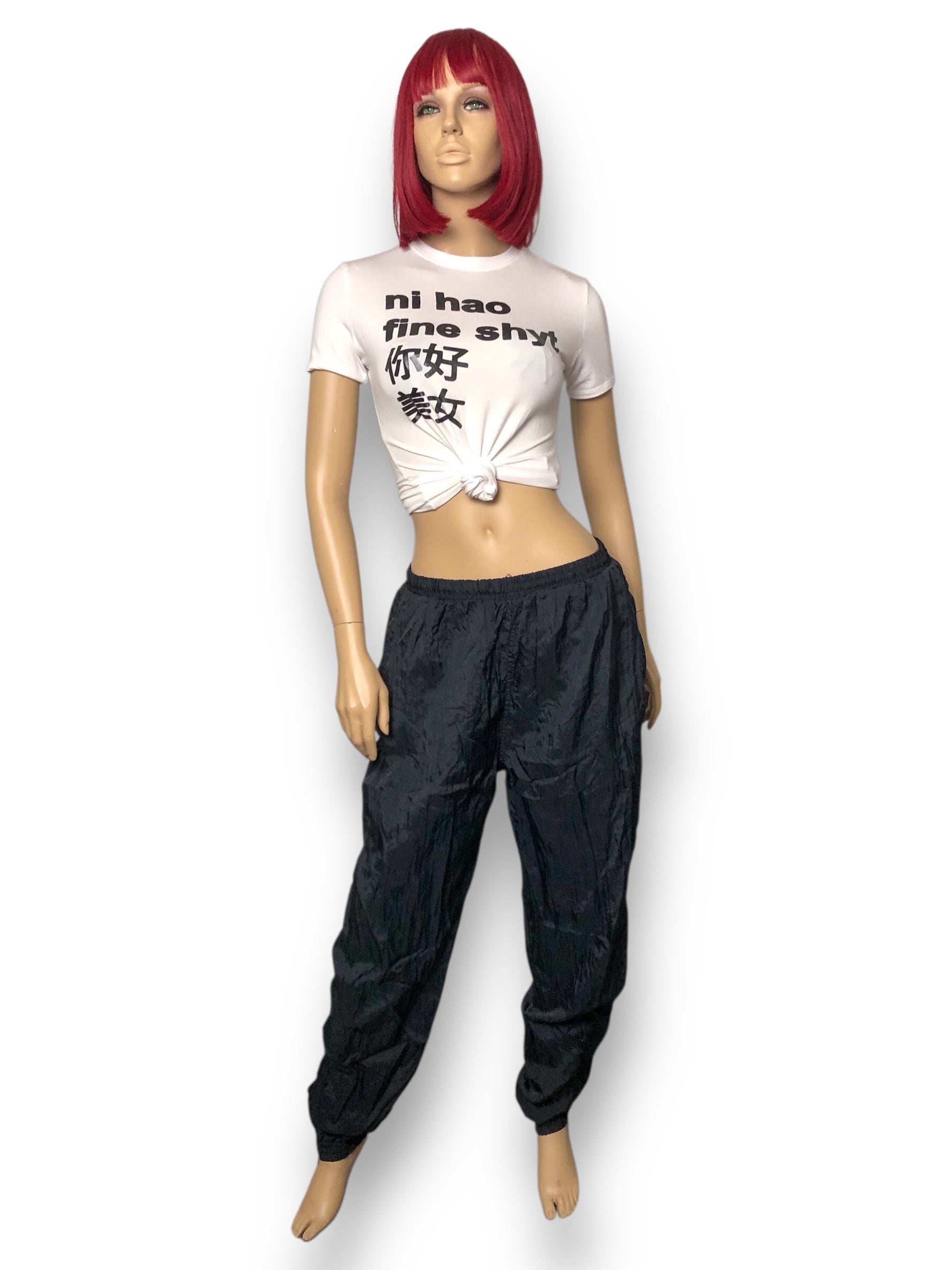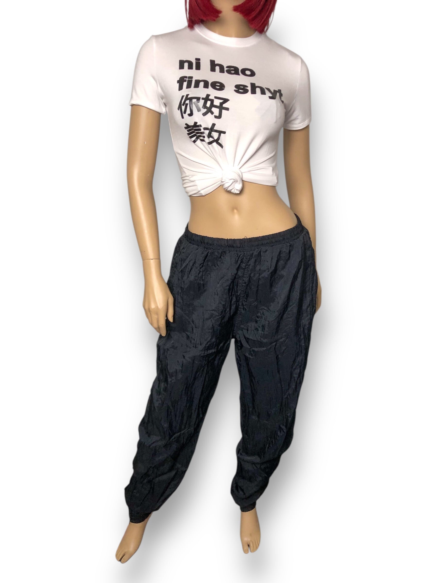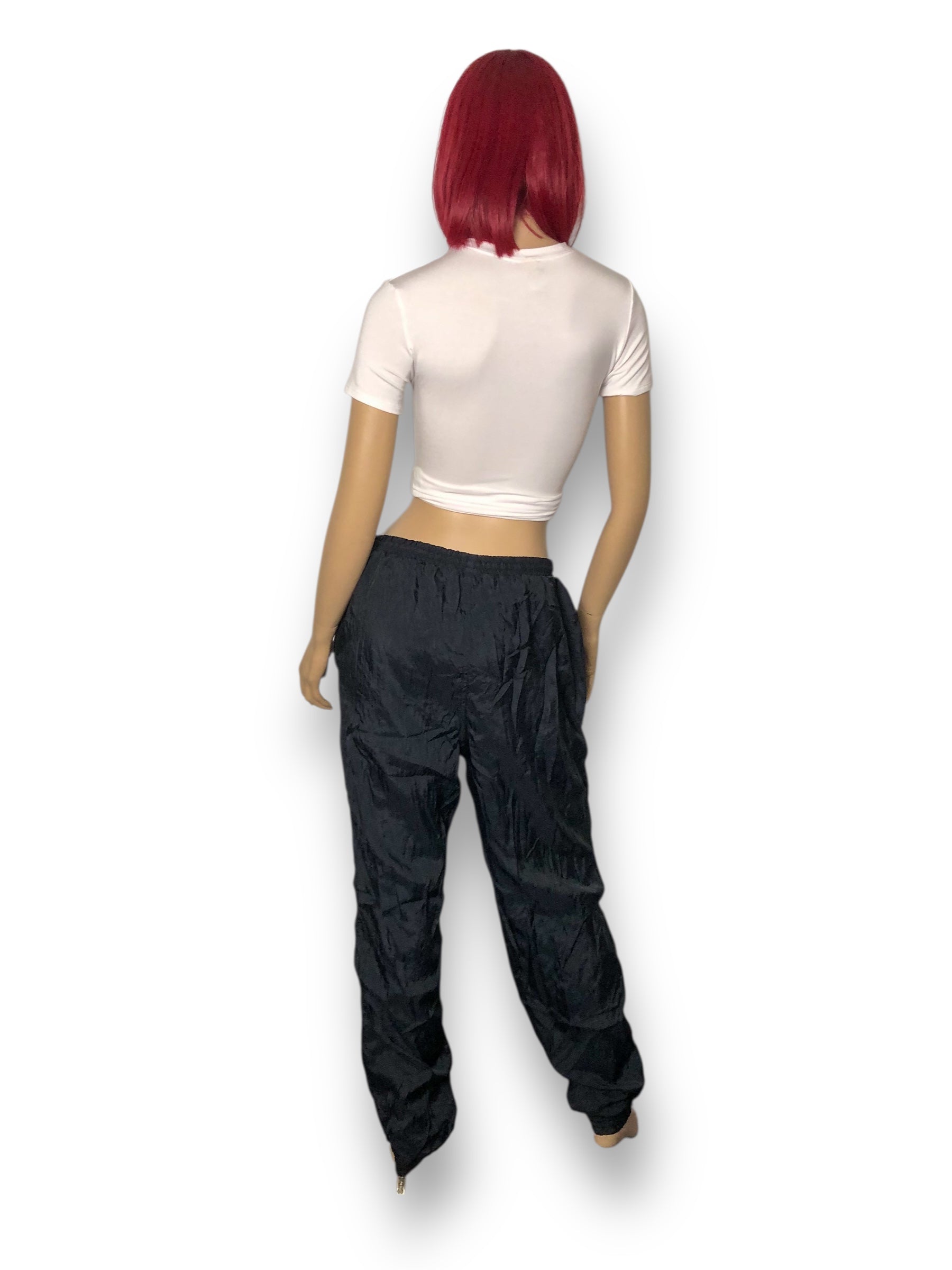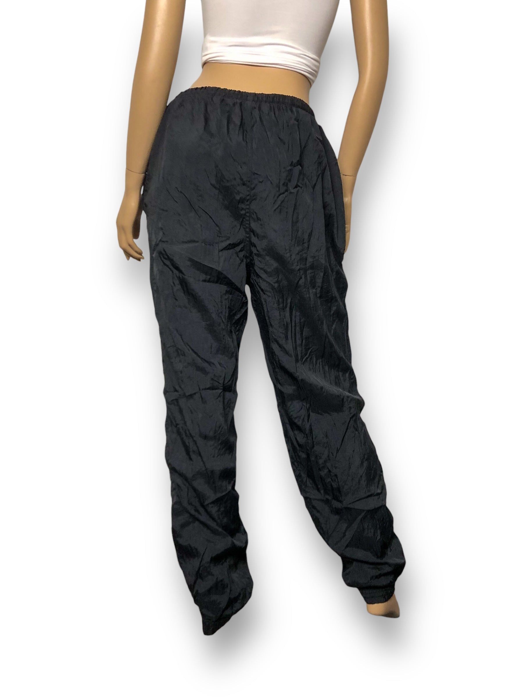 stretchy elastic waistband + pant hems, side zippered pockets, inner waist drawstring, zippers on the pant legs, lining is 65% polyester 35% cotton, shell is 100% nylon