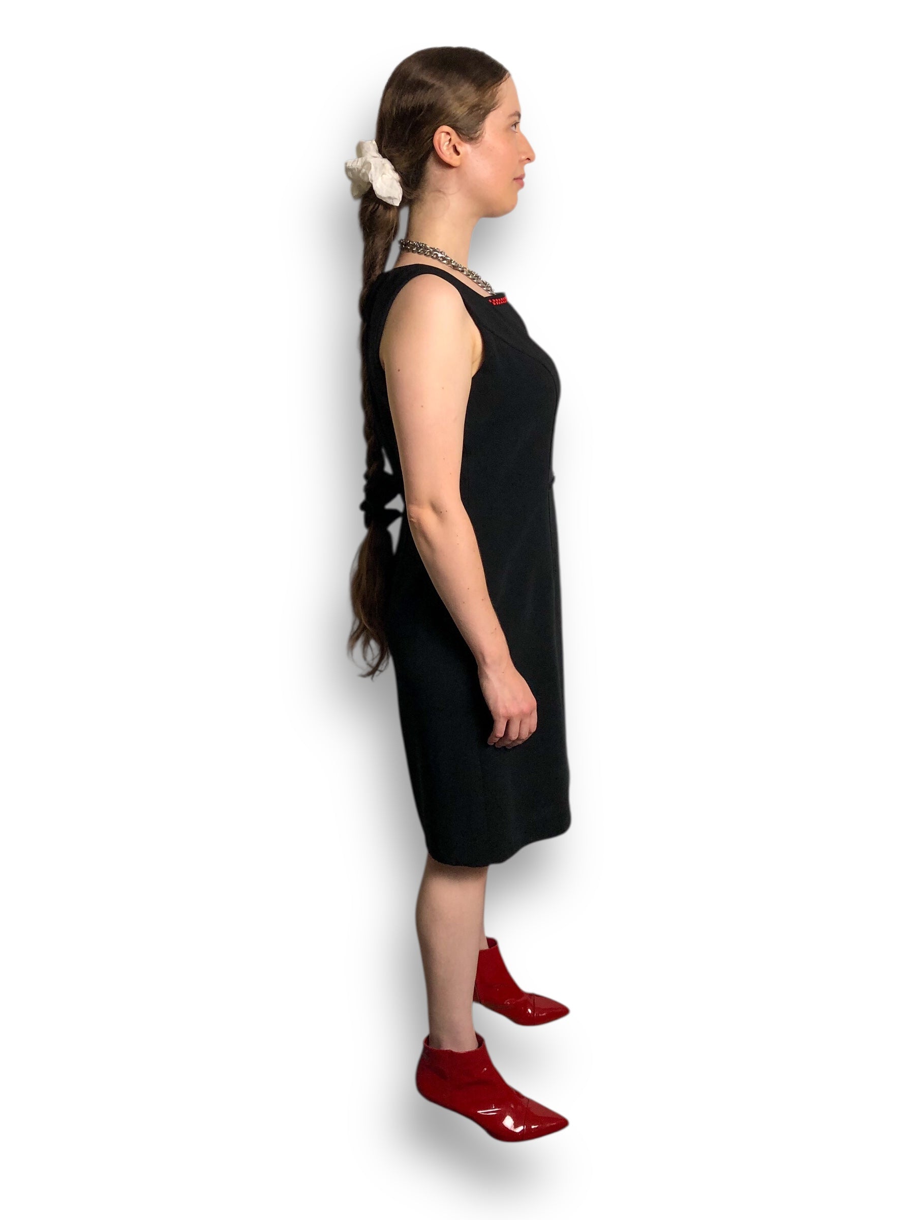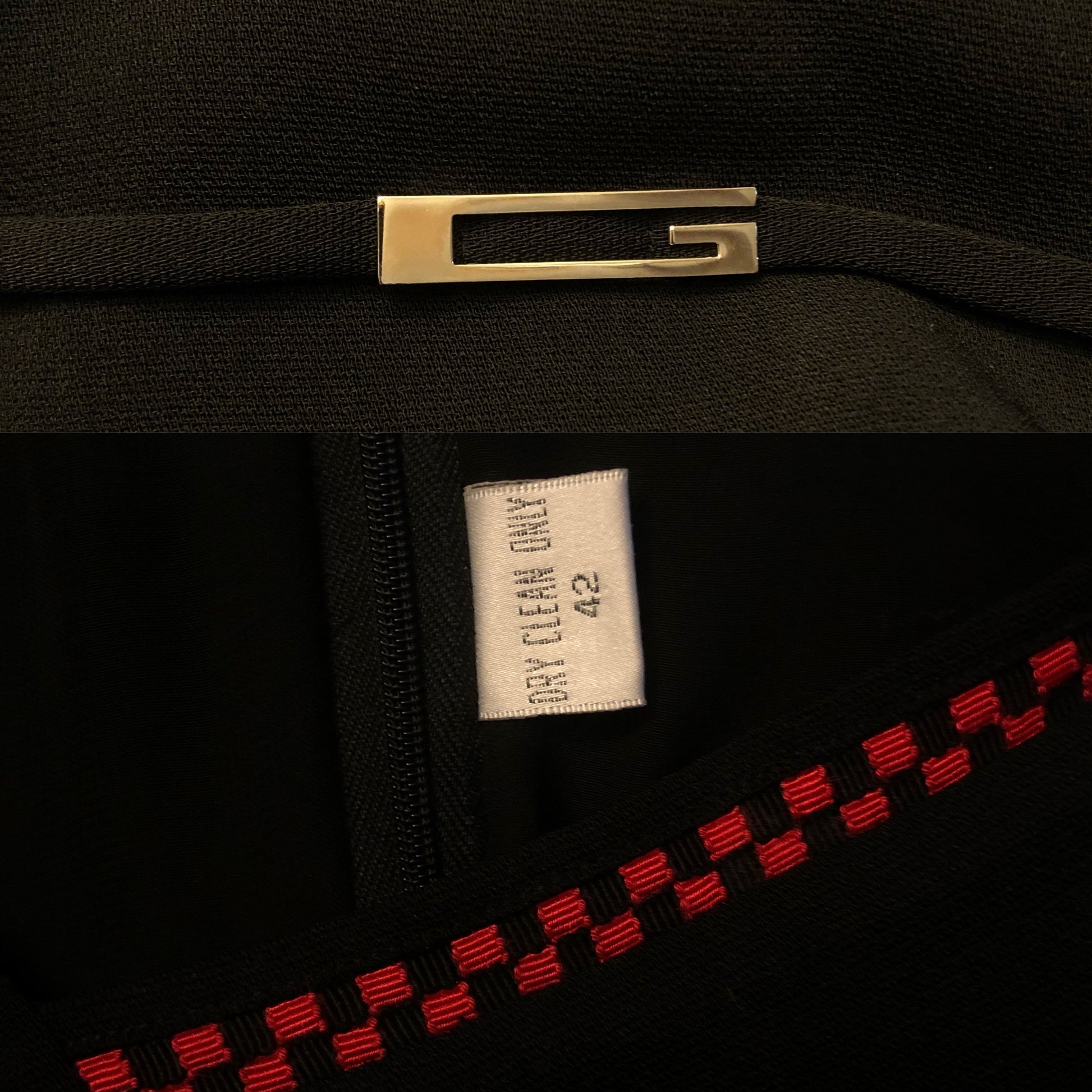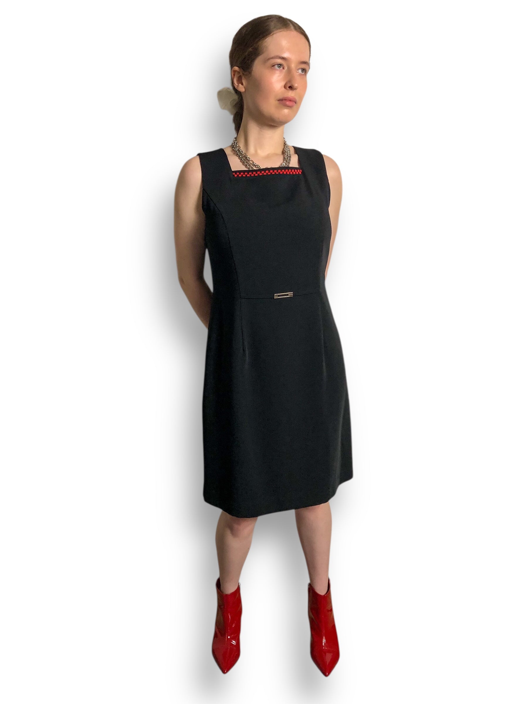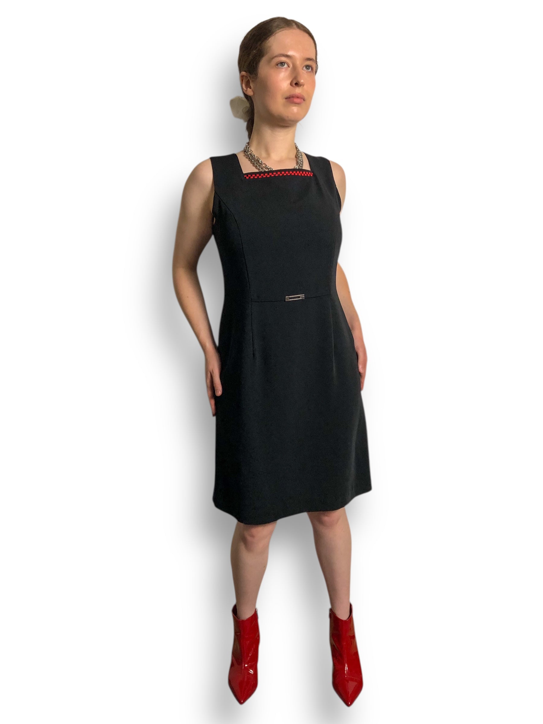 red and black checkerboard embroidery along the square neckline, zipper closure down the back, metal buckle detailing at the waist, no stretch (feels like polyester)