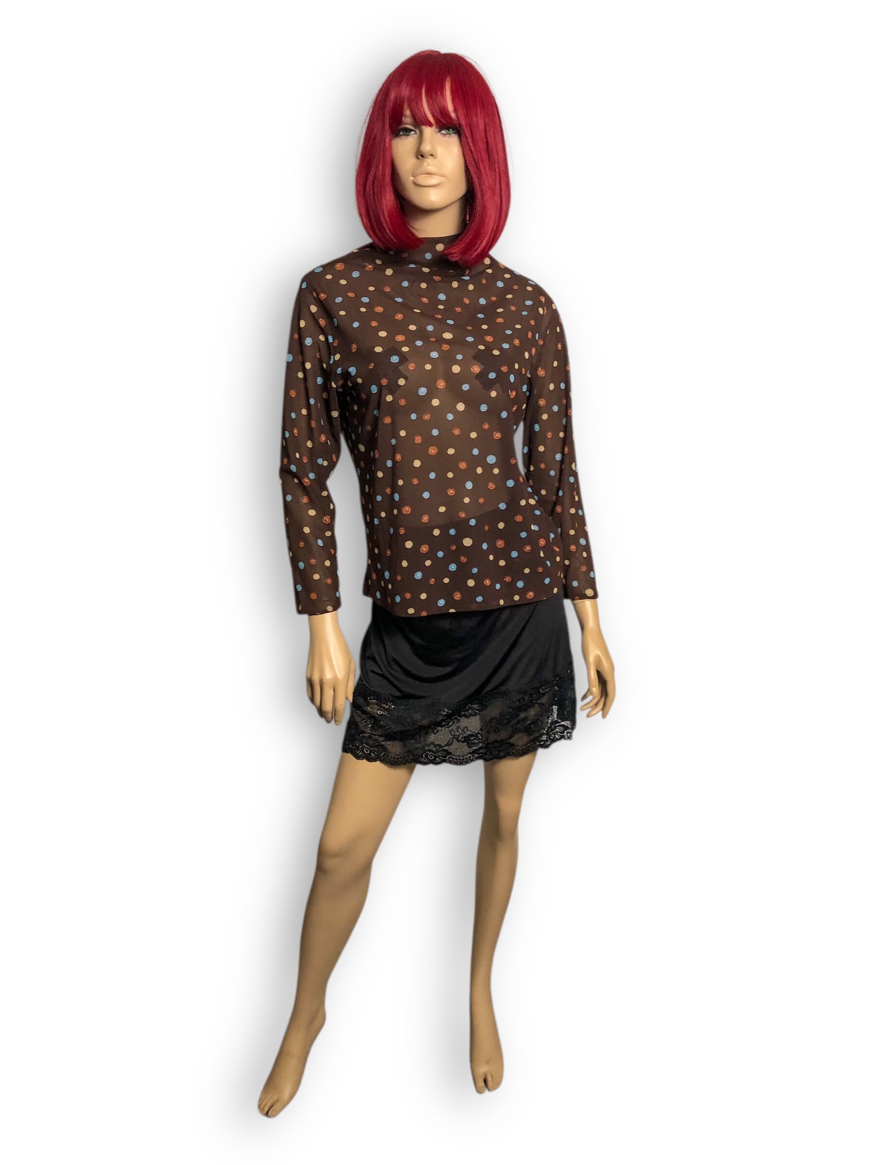 mock turtleneck, blue, brown, and tan polka dot print throughout, slightly sheer, 3/4 sleeves, has stretch throughout