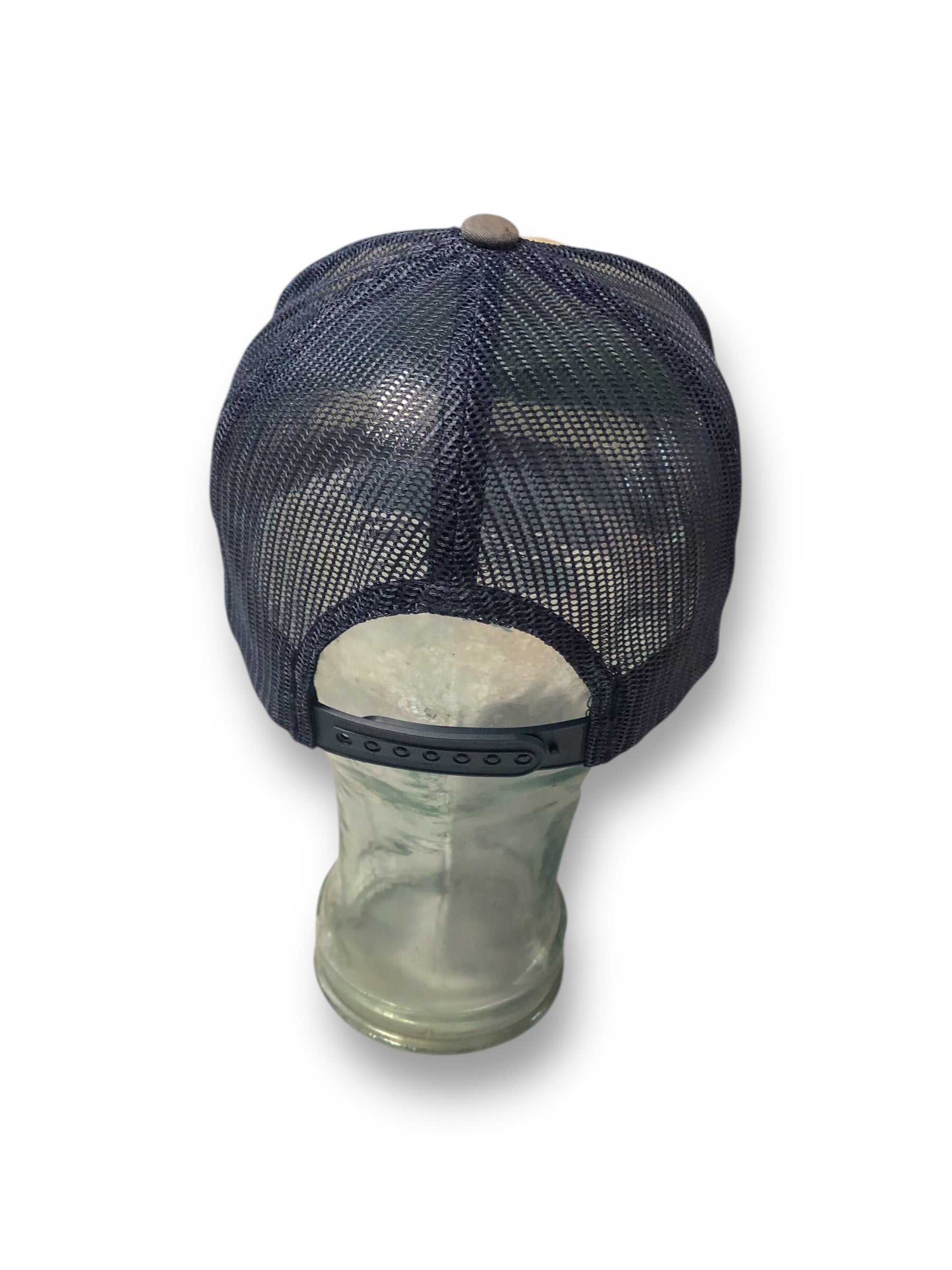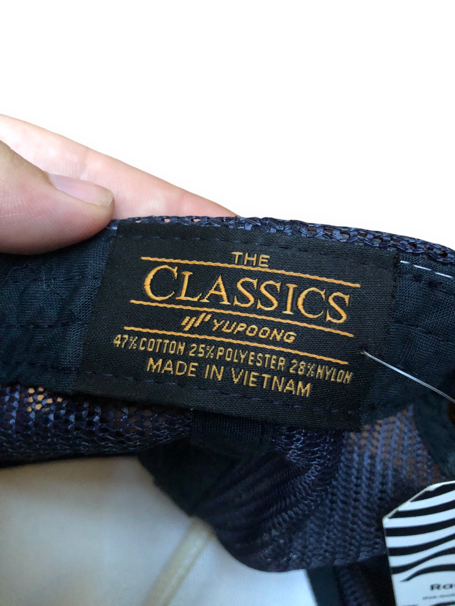 adjustable back, made by The Classics Yupoong, 47% cotton 35% polyester 28% nylon, mesh trucker hat (small hole, pictured)