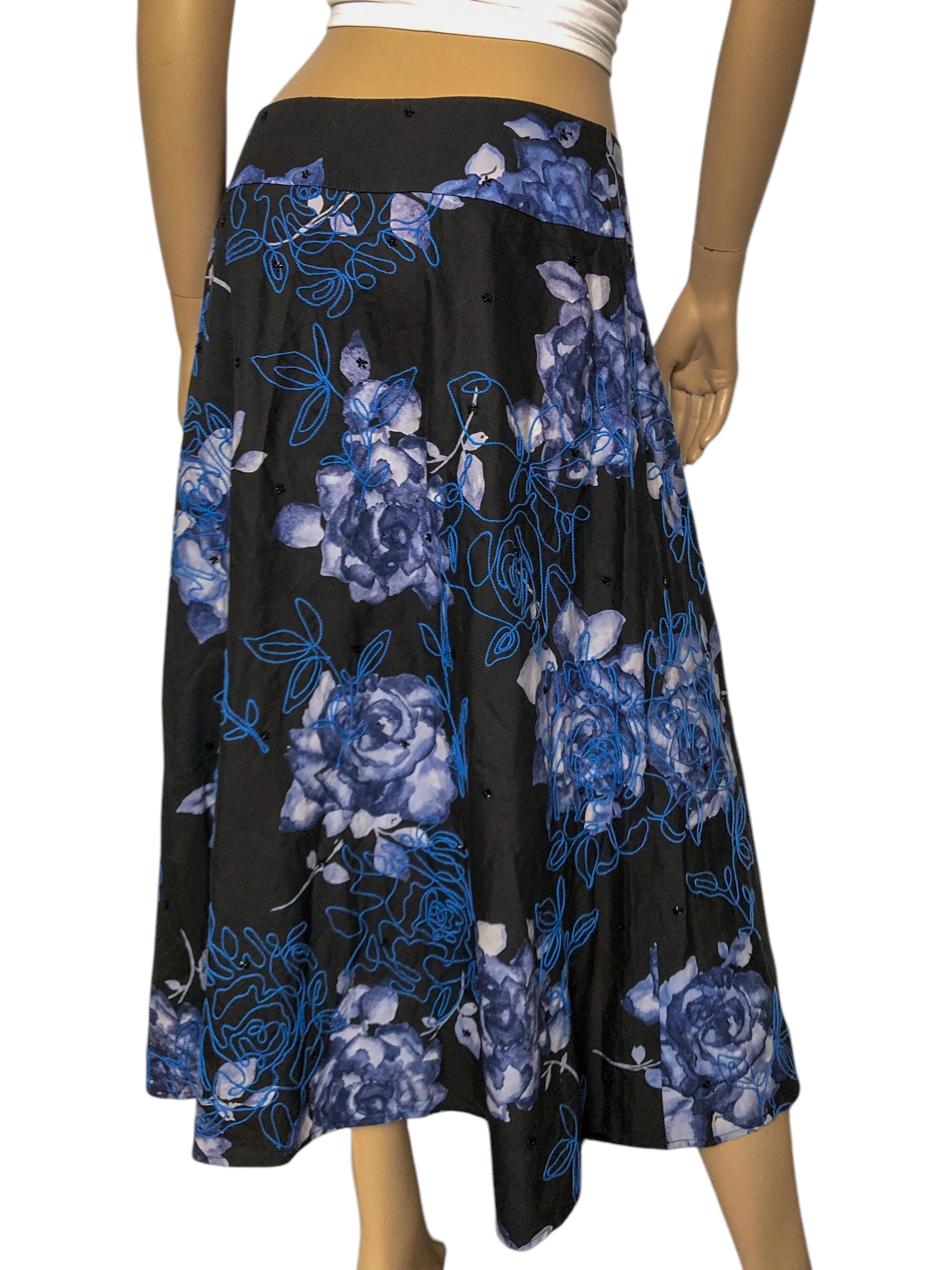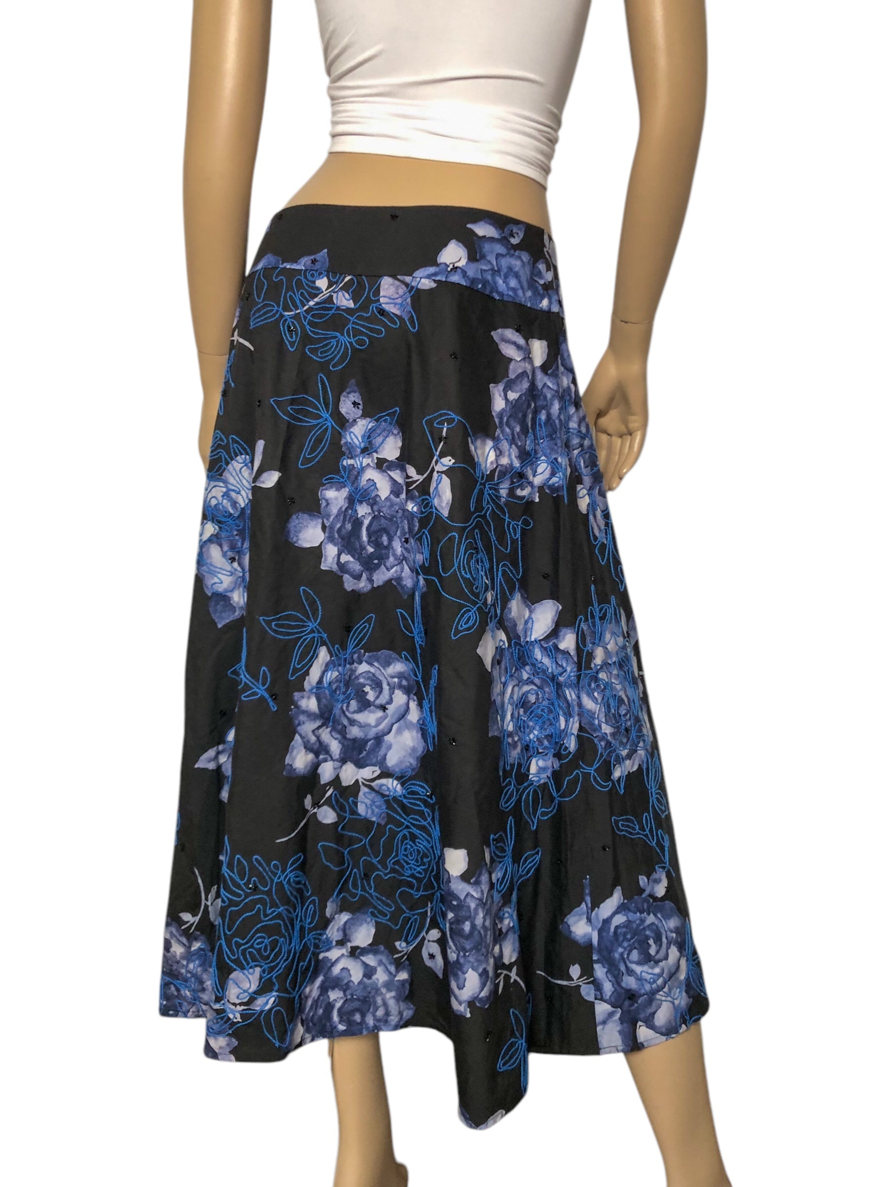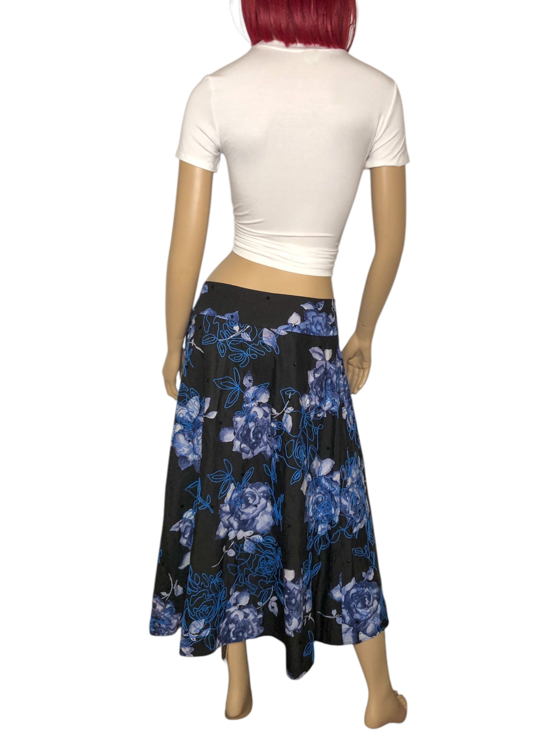 90’s/Y2K Grace Elements Black and Blue Floral Watercolor A-Line Skirt (M)