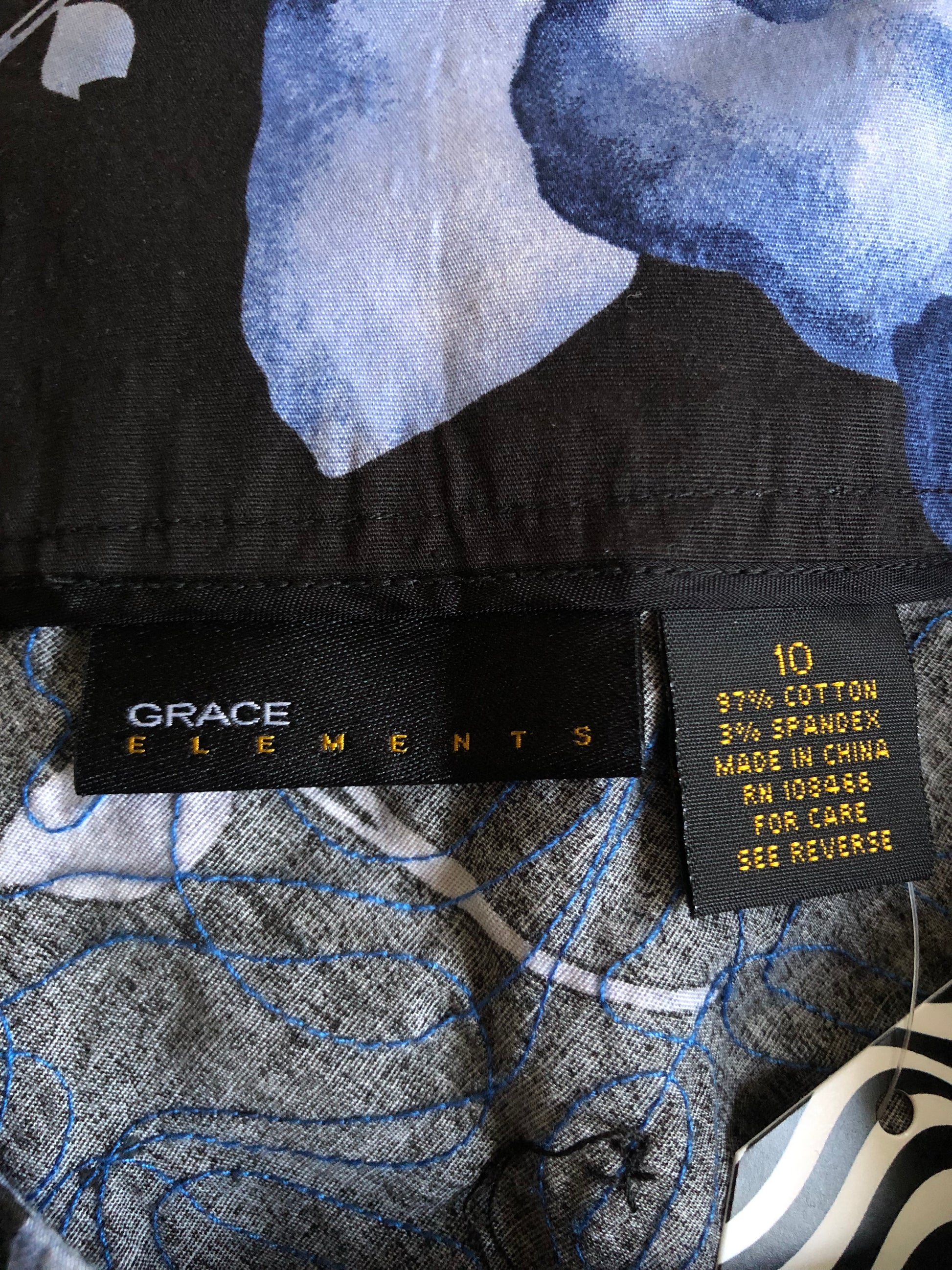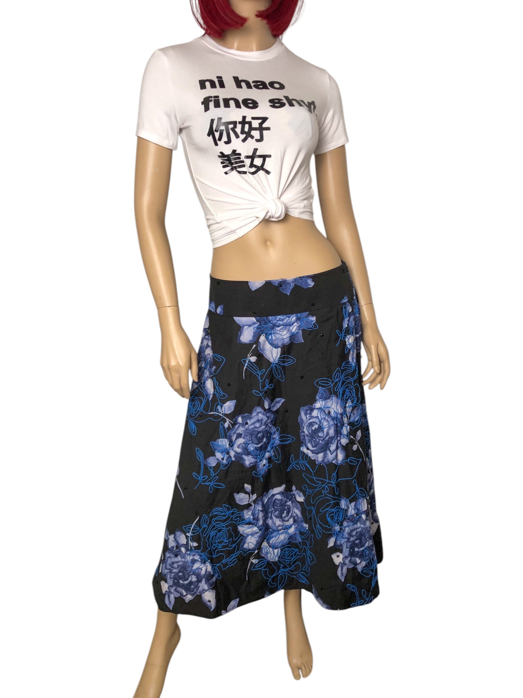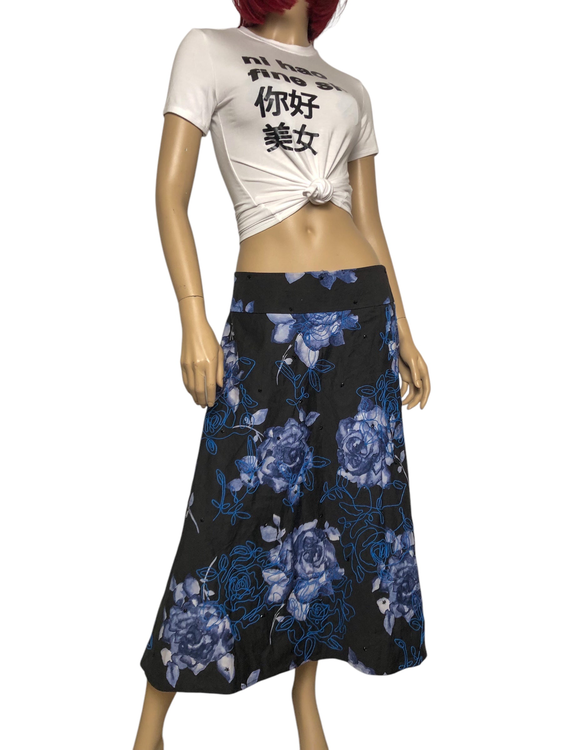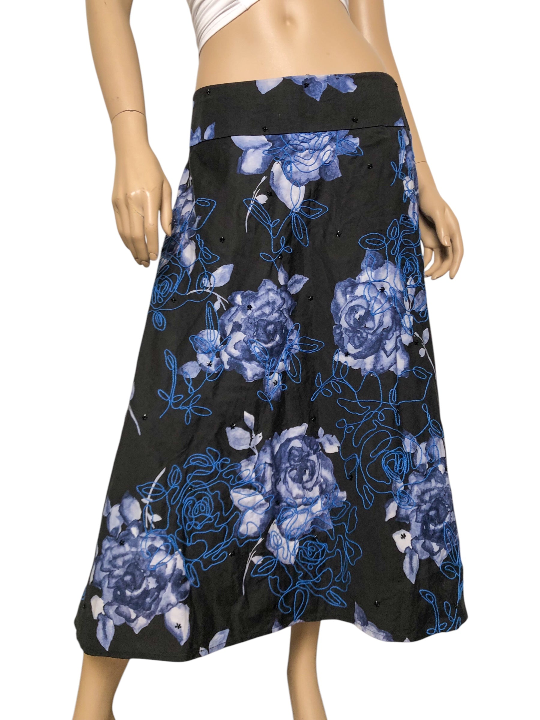 90’s/Y2K Grace Elements Black and Blue Floral Watercolor A-Line Skirt (M)