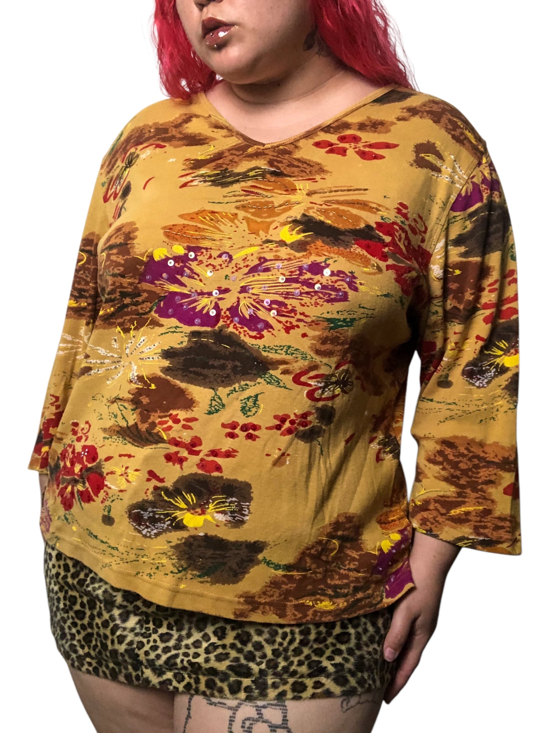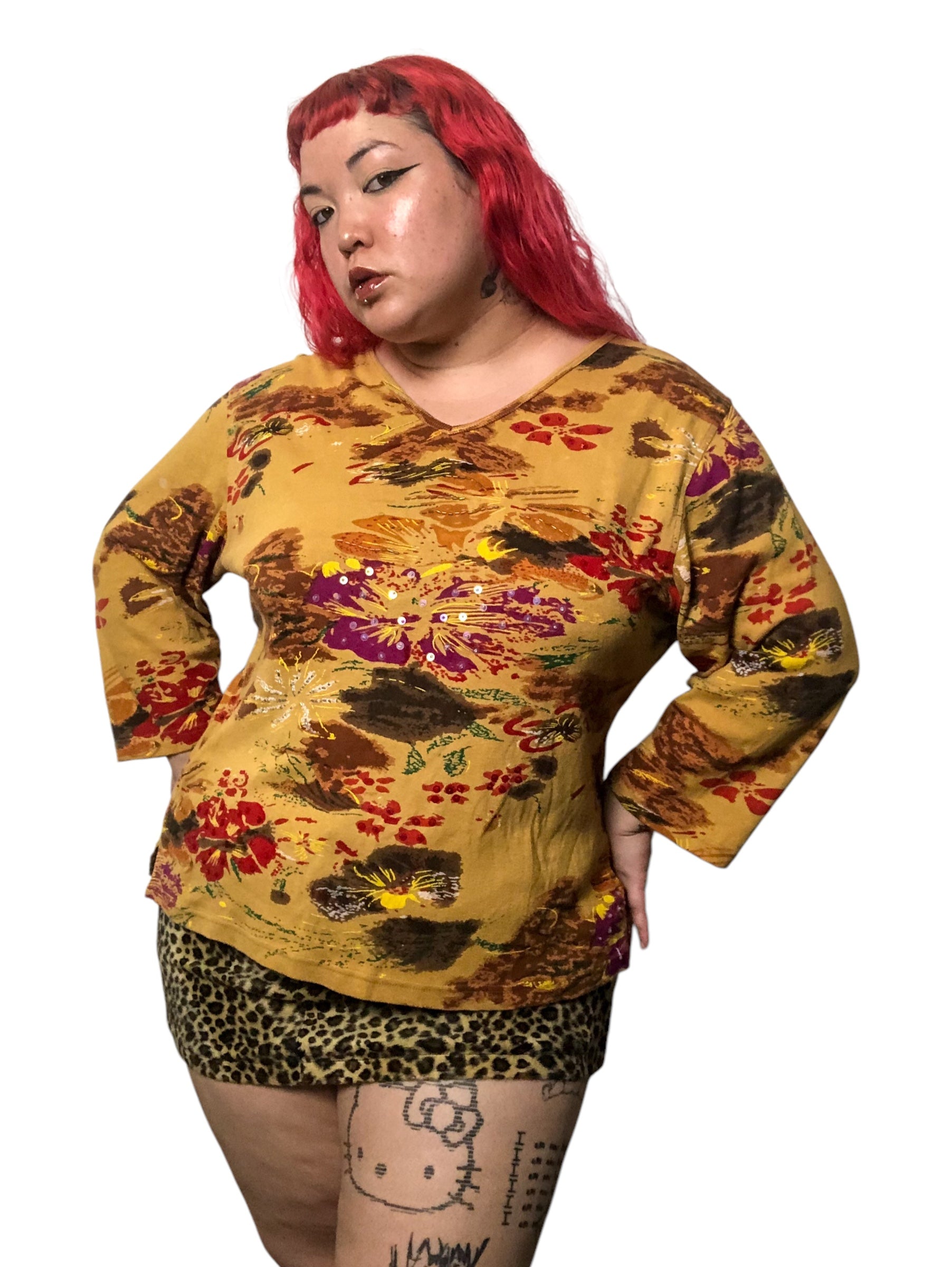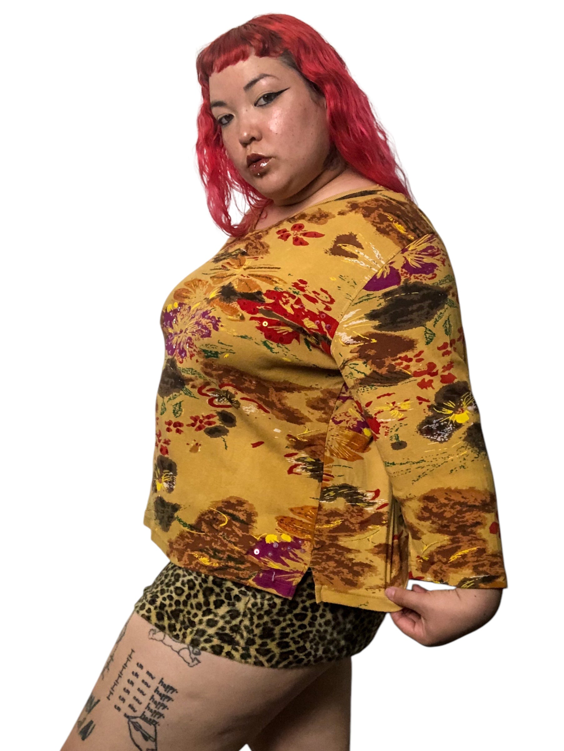 90’s/Y2K Jane Ashley Mustard Floral Print Long Sleeve Shirt (3X)
