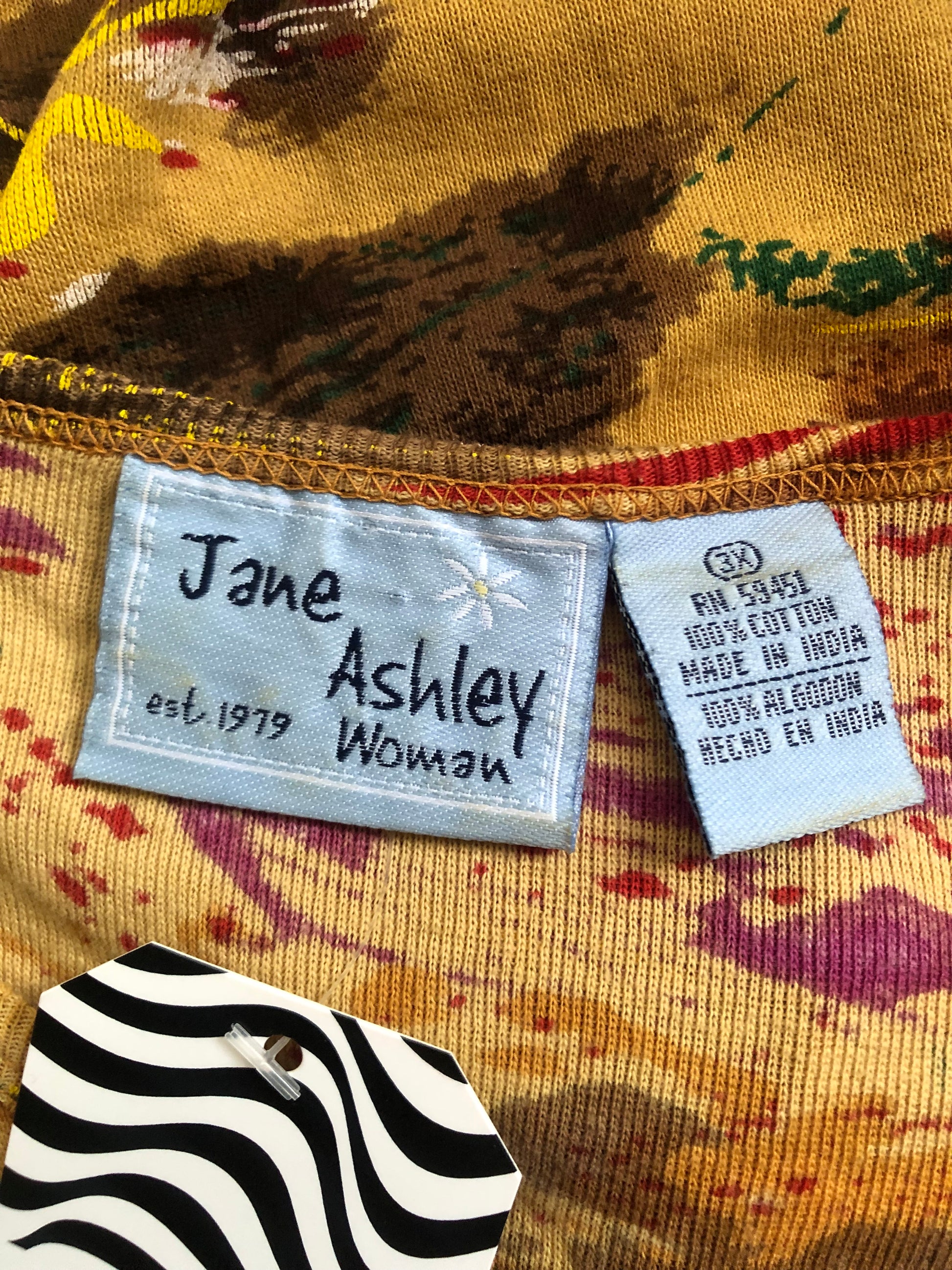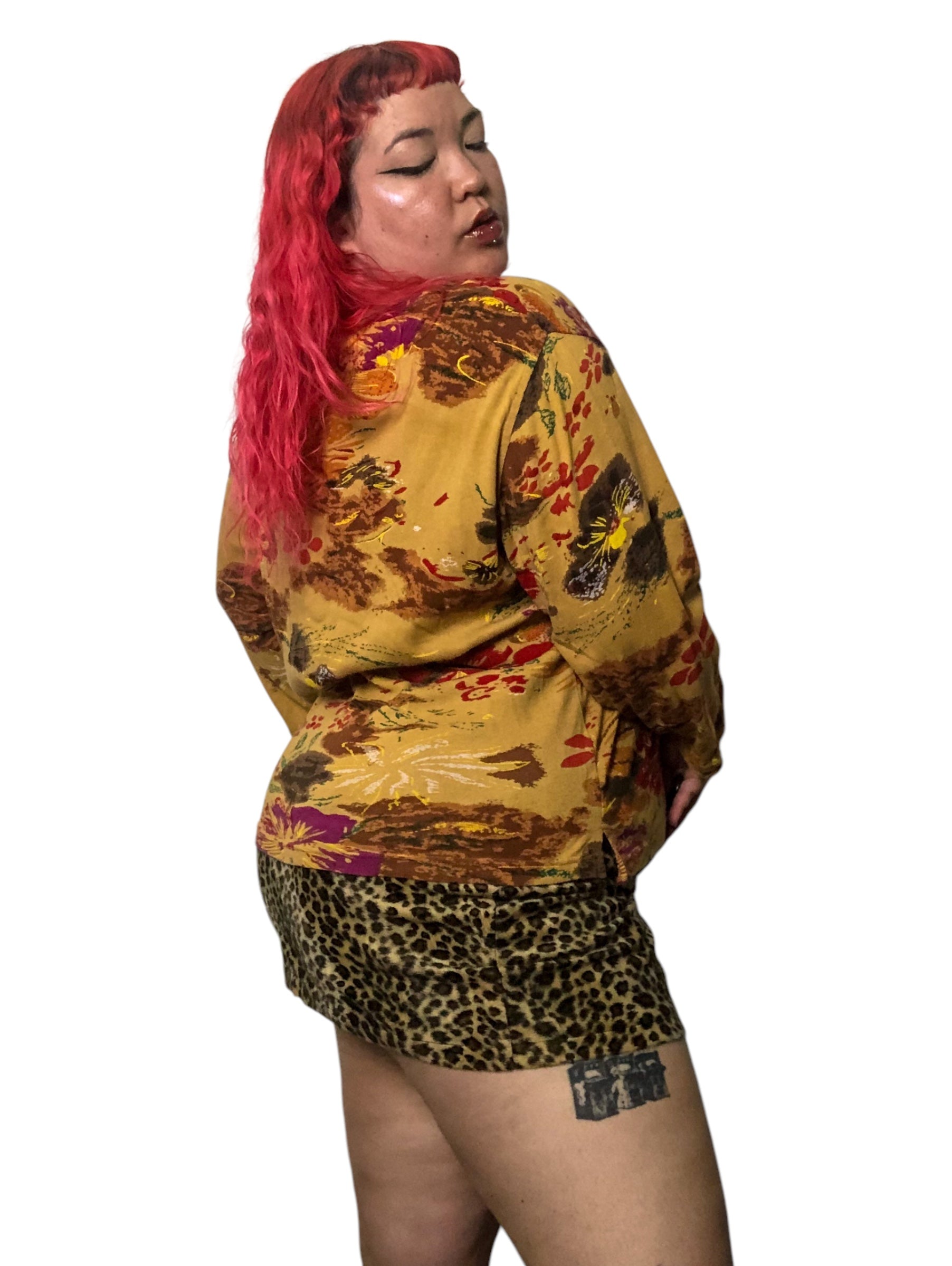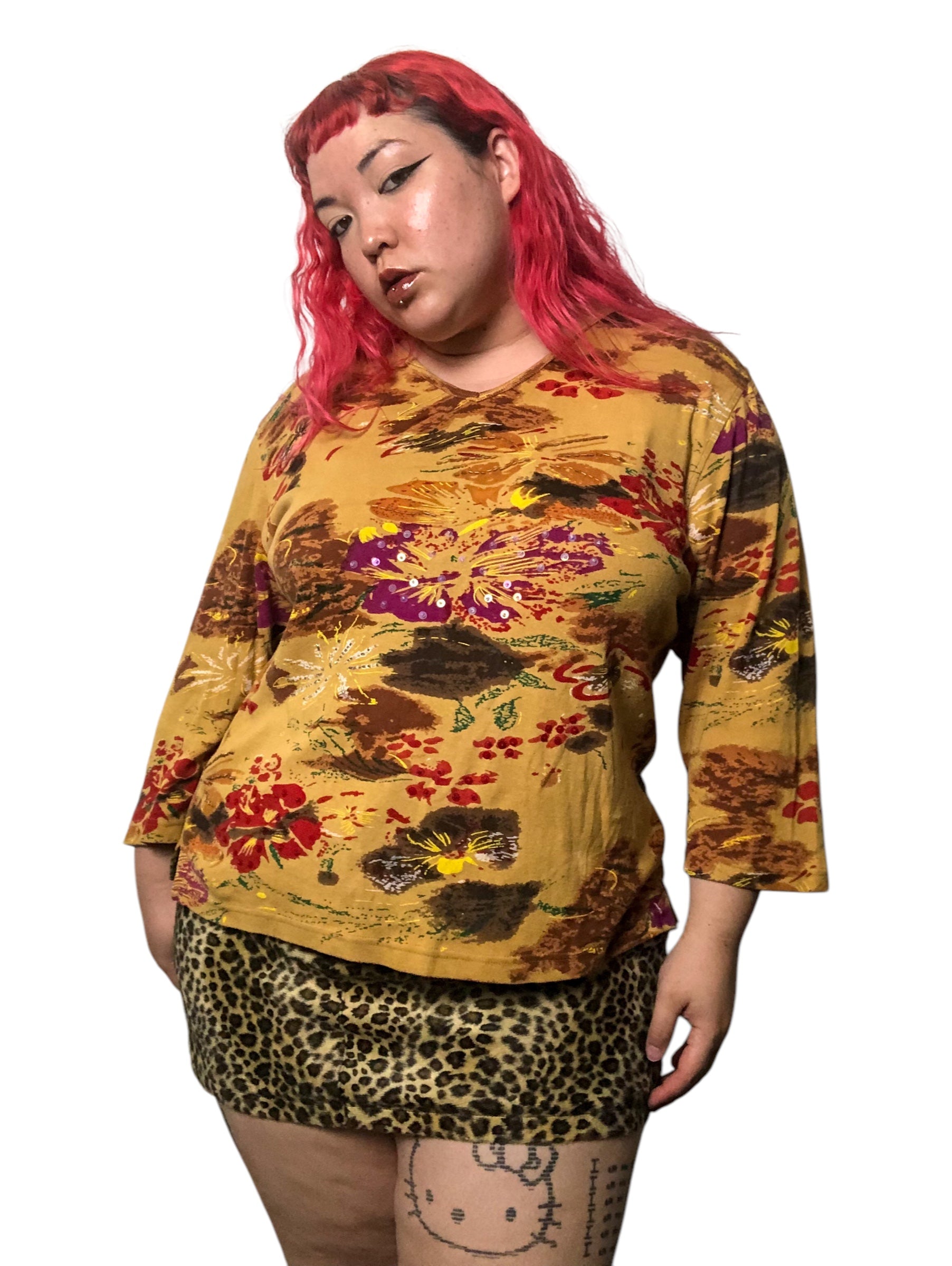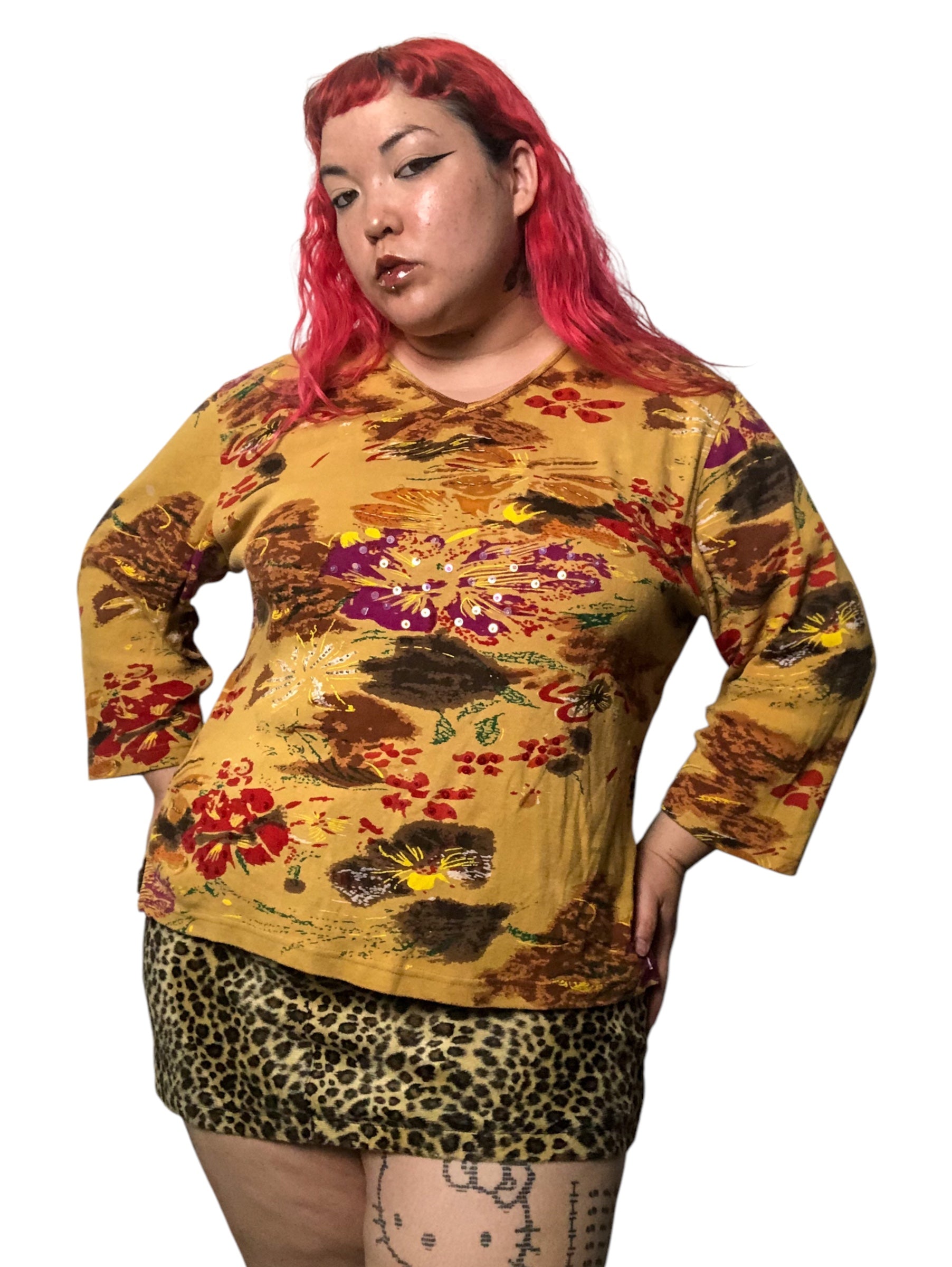90’s/Y2K Jane Ashley Mustard Floral Print Long Sleeve Shirt (3X)