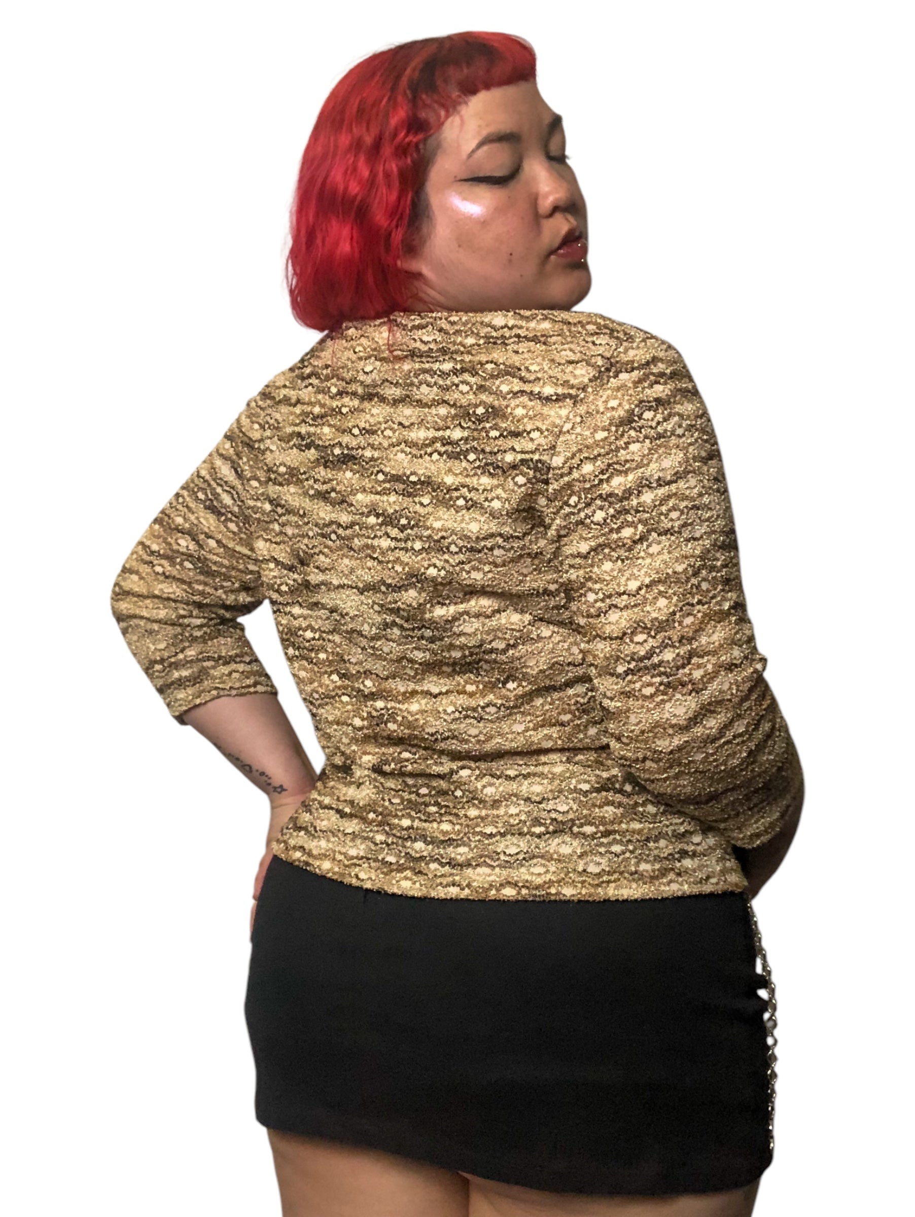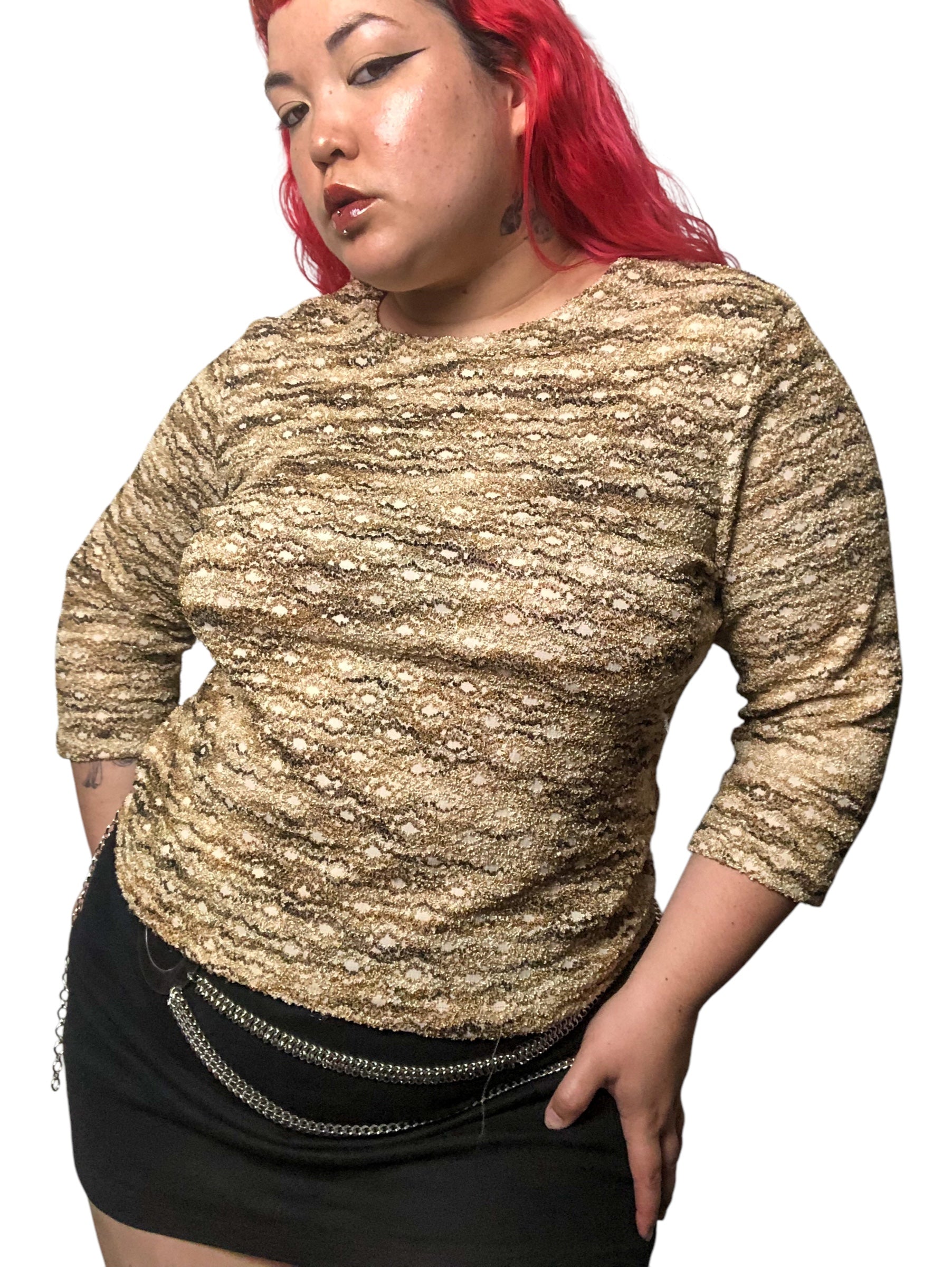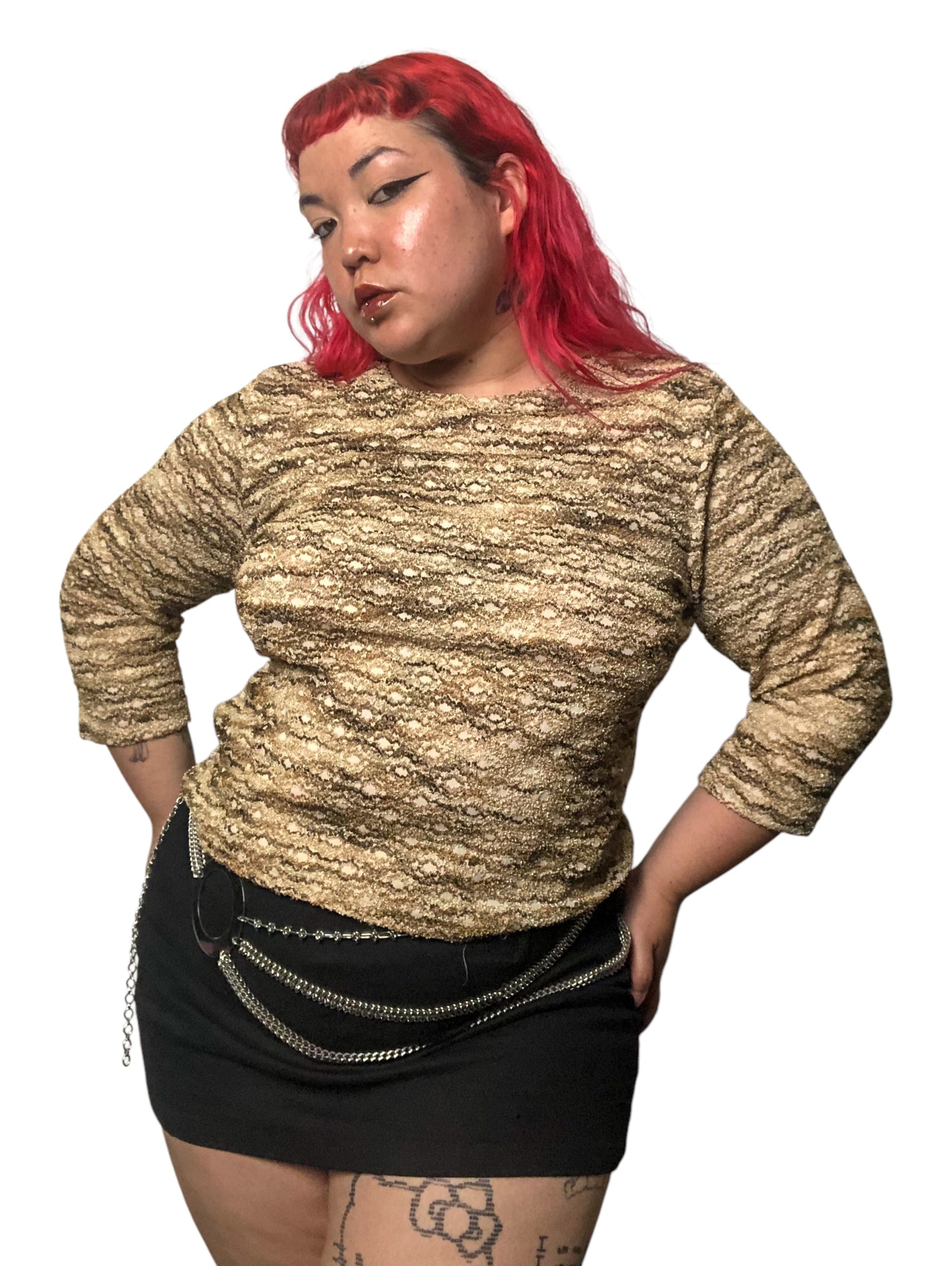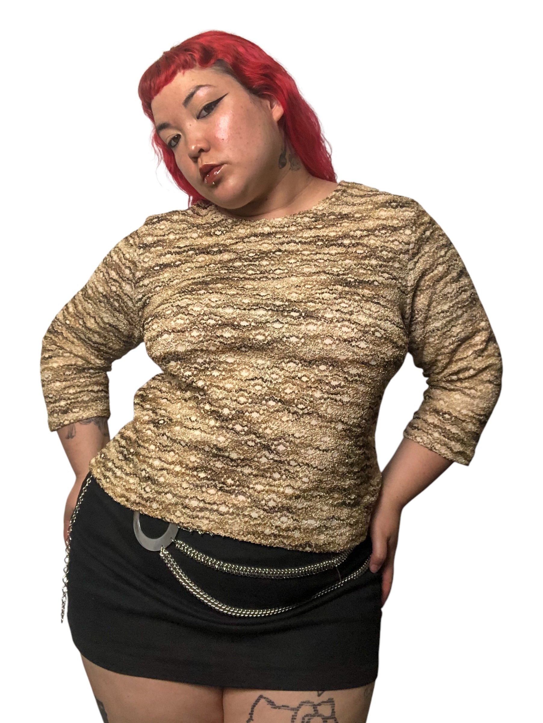 various shades of brown squiggly stripes throughout, 3/4 sleeves, stretchy (62% polyester 35% nylon 3% spandex)