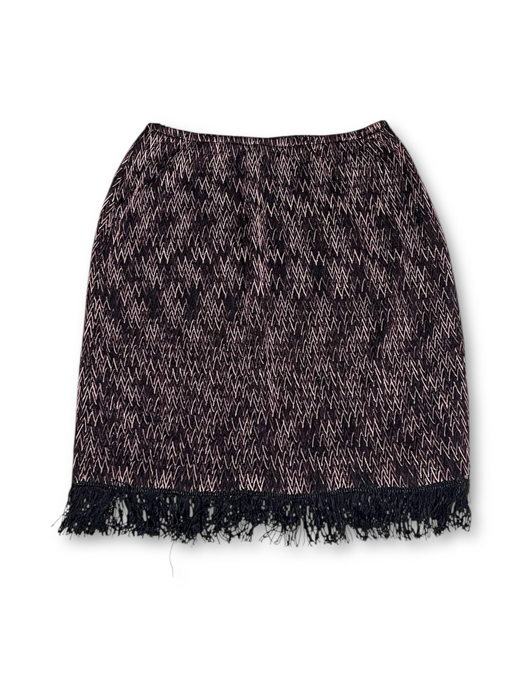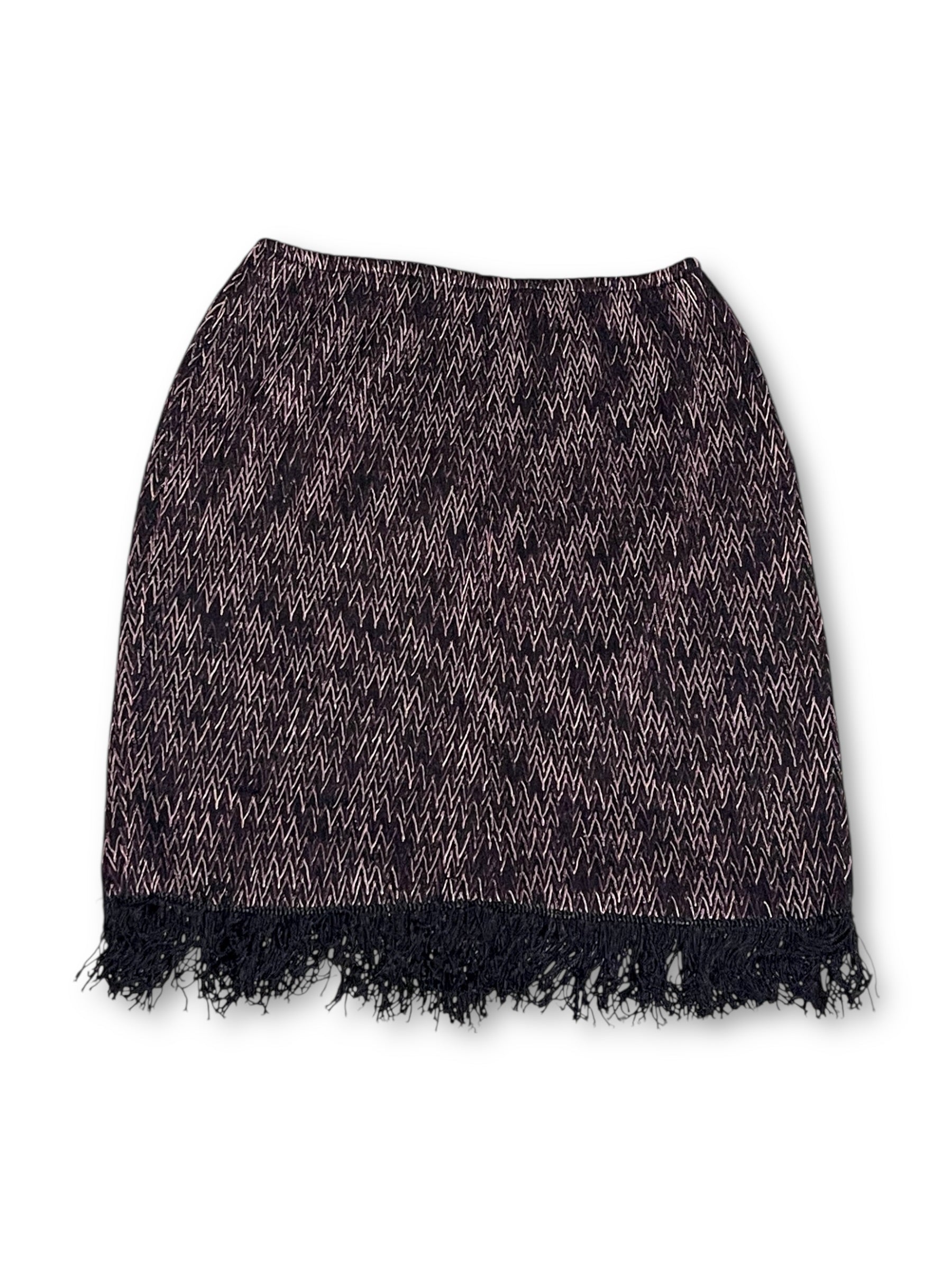 boho grunge! zig zag pattern throughout, black fringe along the bottom, stretchy elastic waistband + some stretch throughout