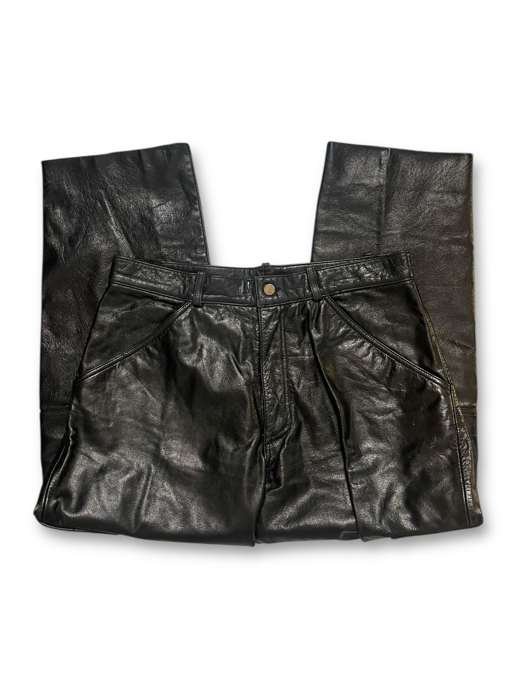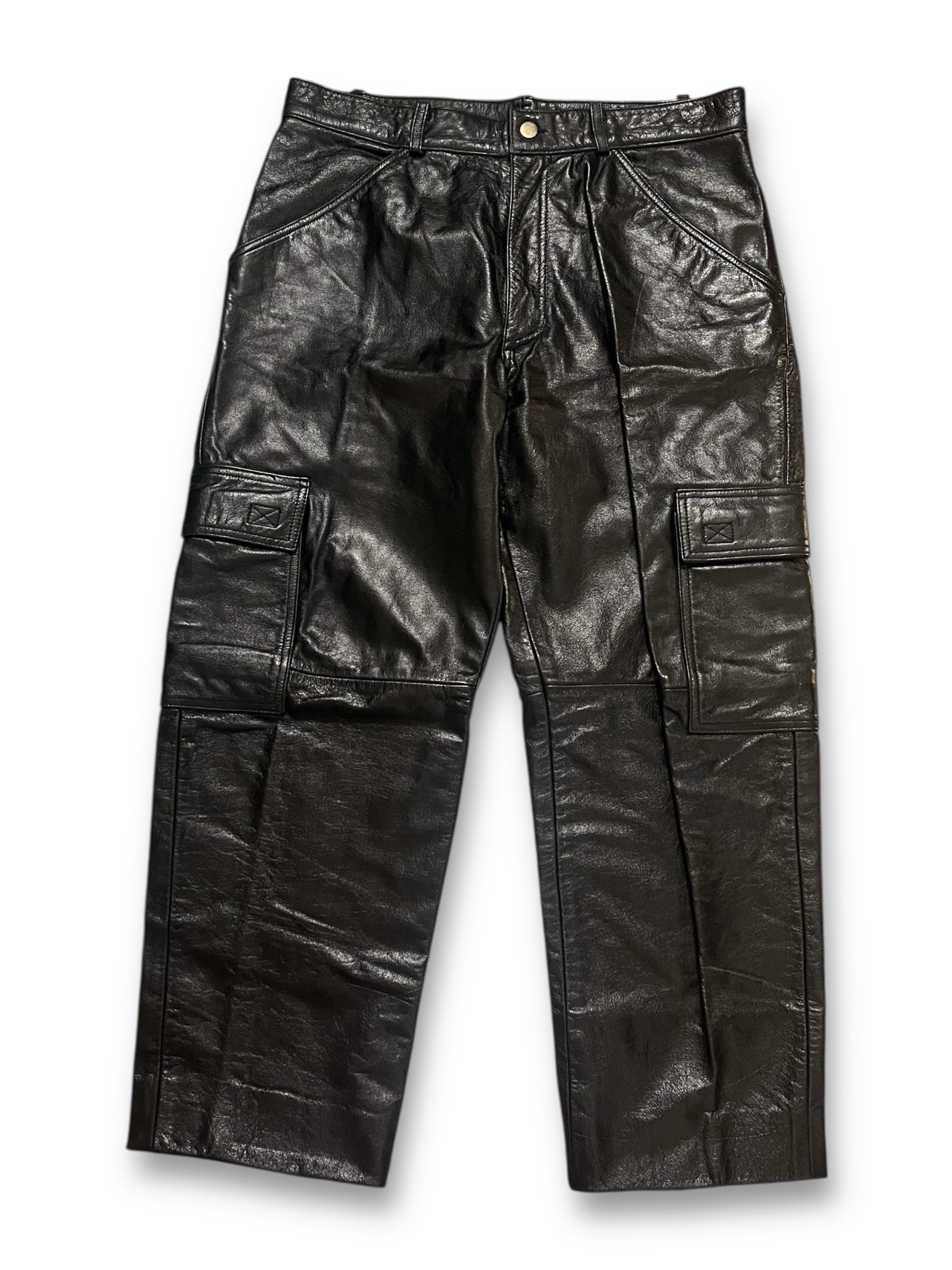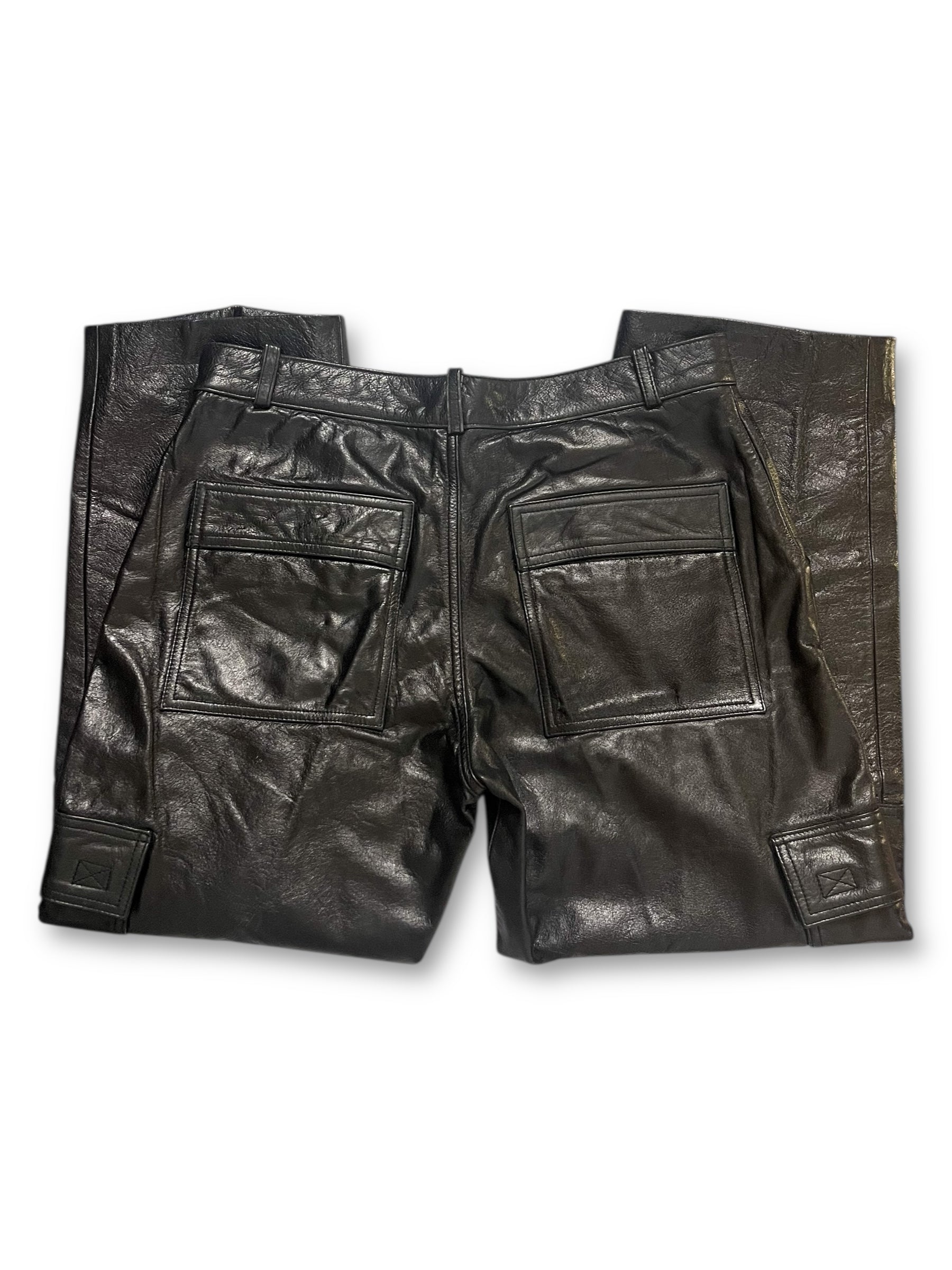 button + zipper closure, belt loops, front + rear pockets, velcro pockets on each pant leg, nylon lining, 100% leather shell, raw pant hems