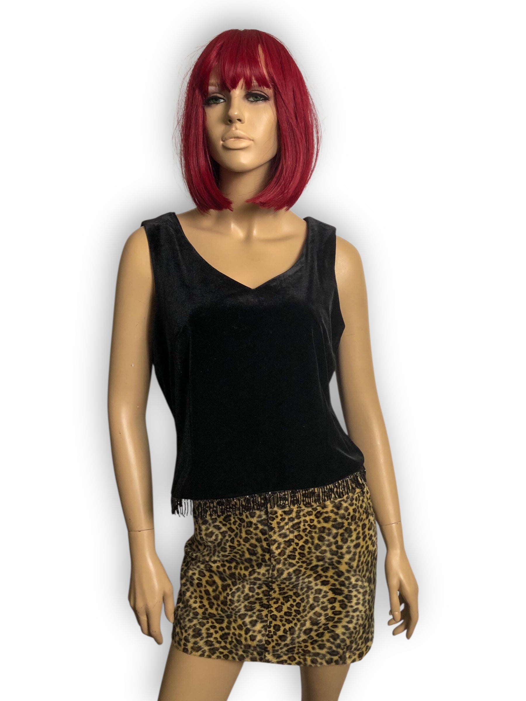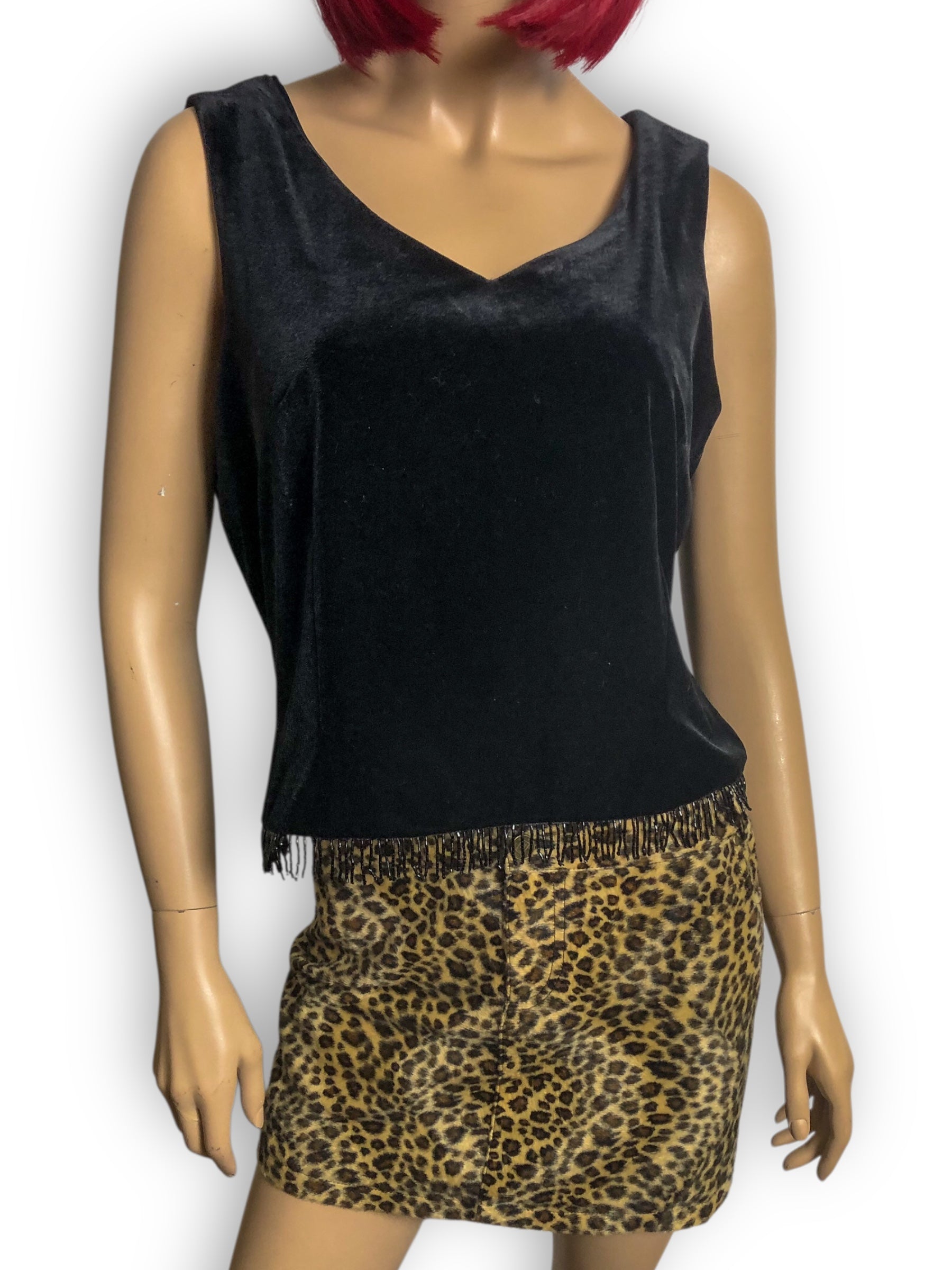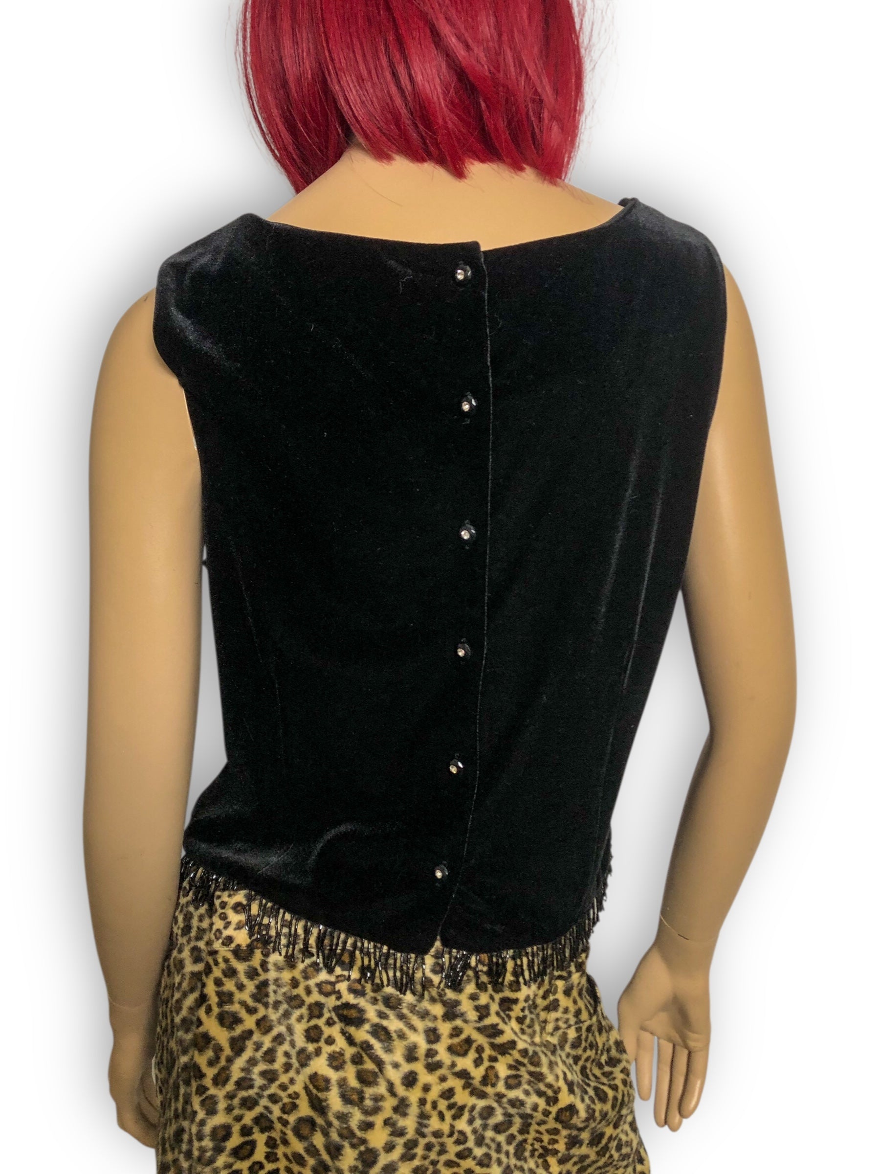 fancy goth going-out top! cute beaded fringe along the bottom hem, chunky rhinestone buttons down the back, polyester lining, some stretch (90% polyester 10% spandex)